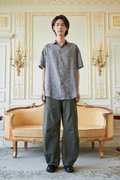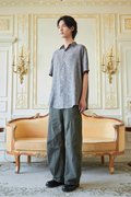 An oversized men’s collared shirt with functional front buttons and a clean back yoke detail.