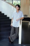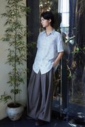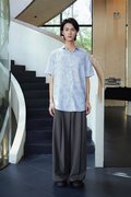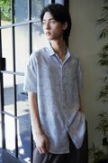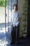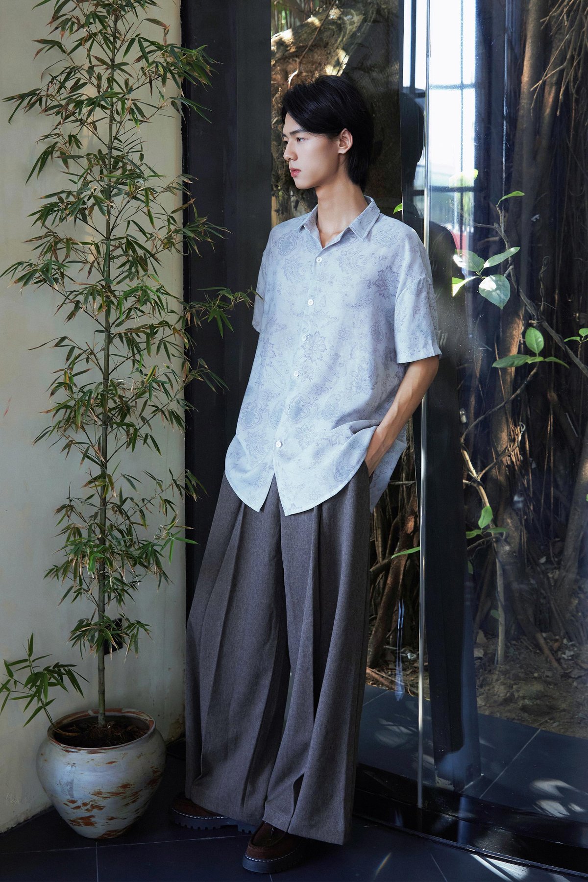 An oversized men’s collared shirt with functional front buttons and a clean back yoke detail.