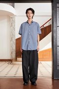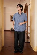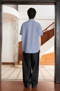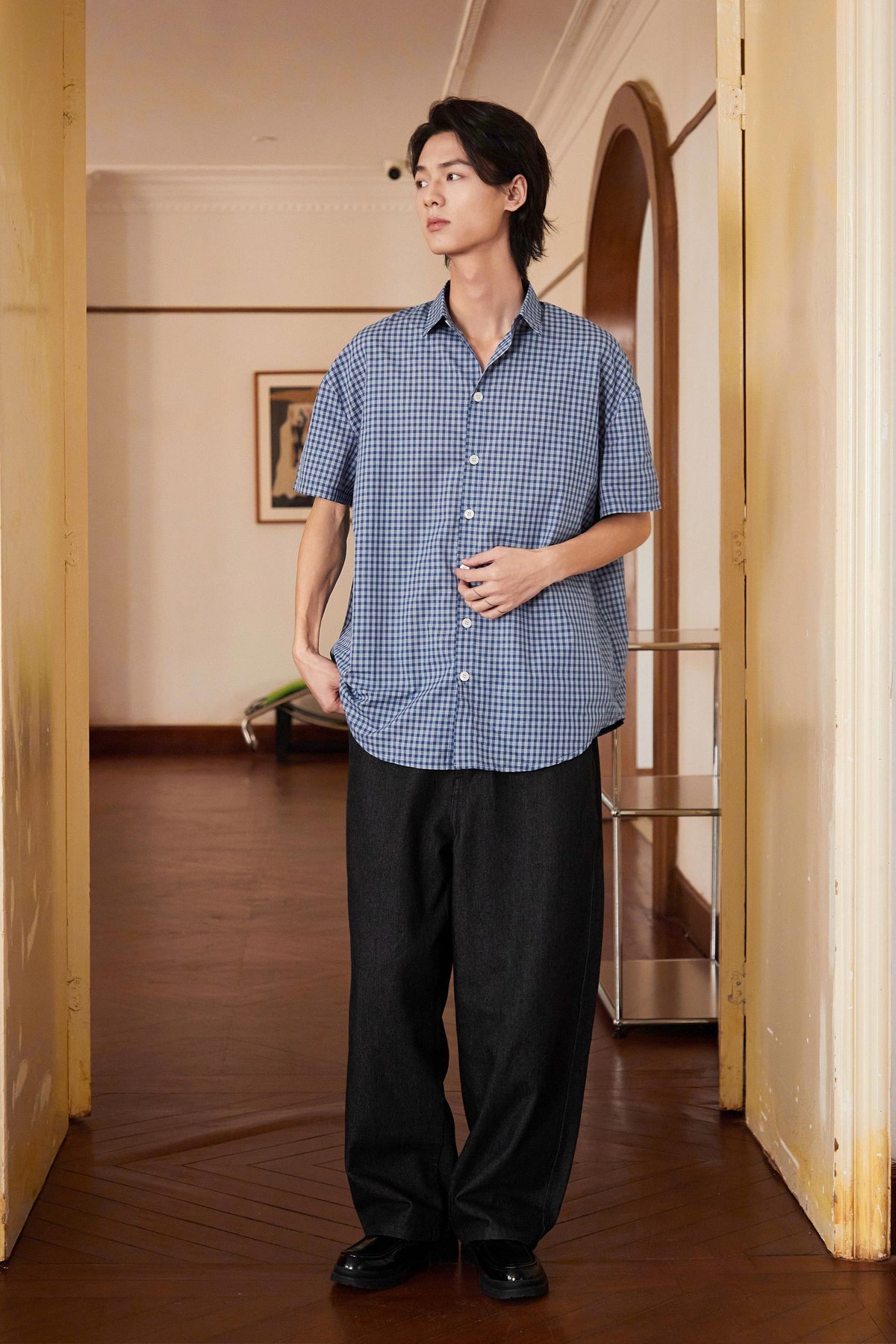 An oversized men’s collared shirt with functional front buttons and a clean back yoke detail.
