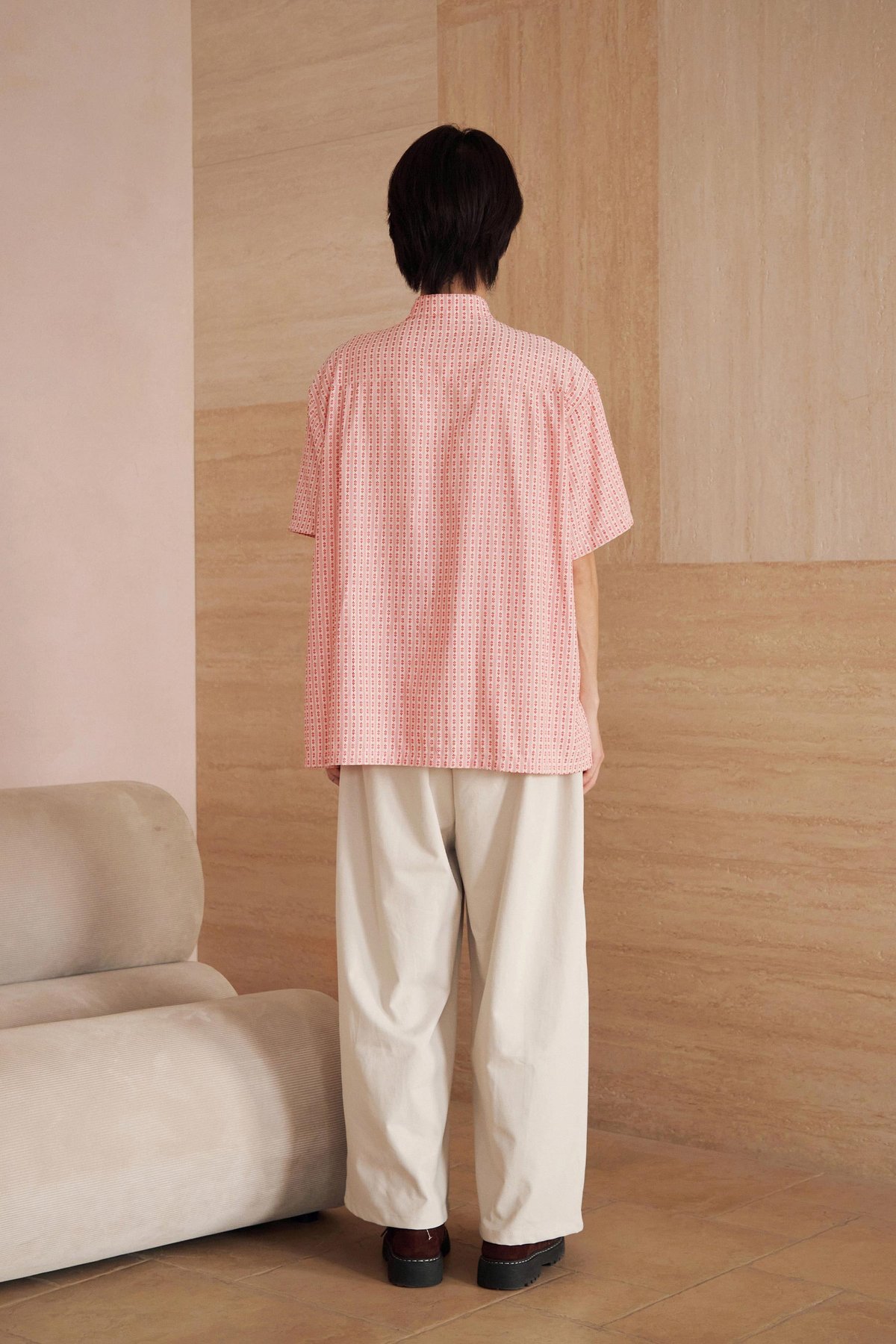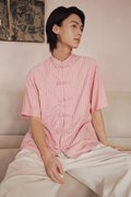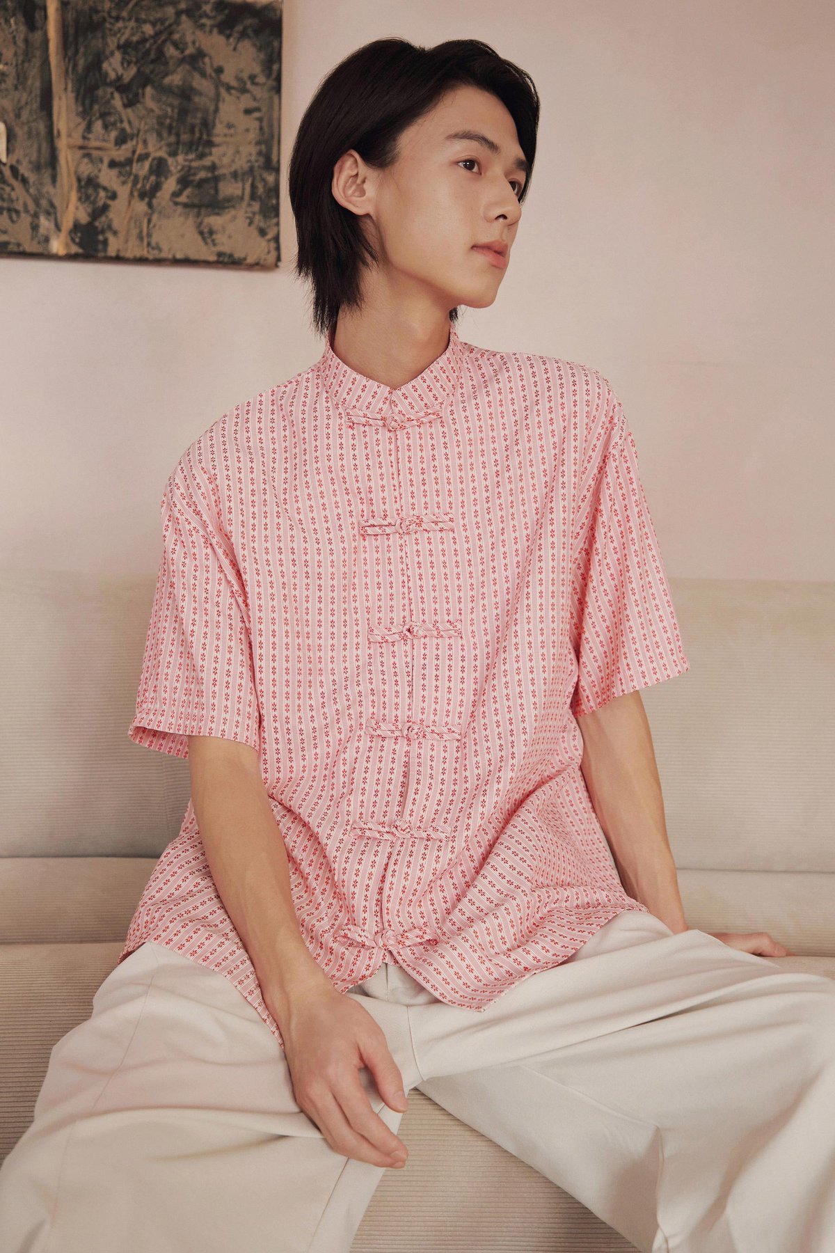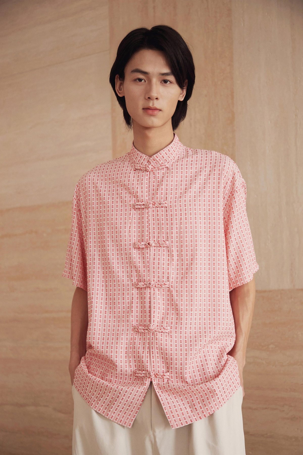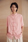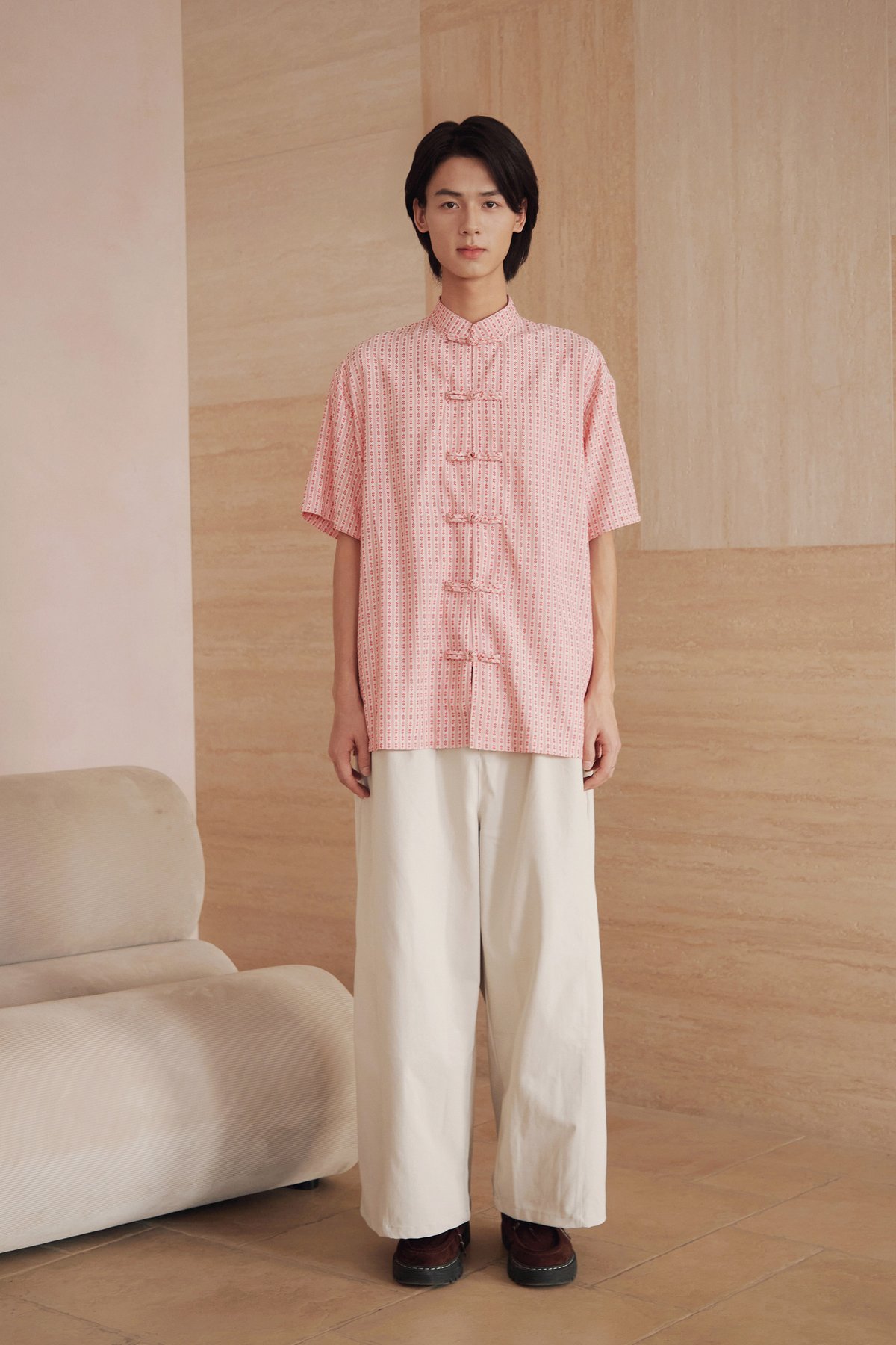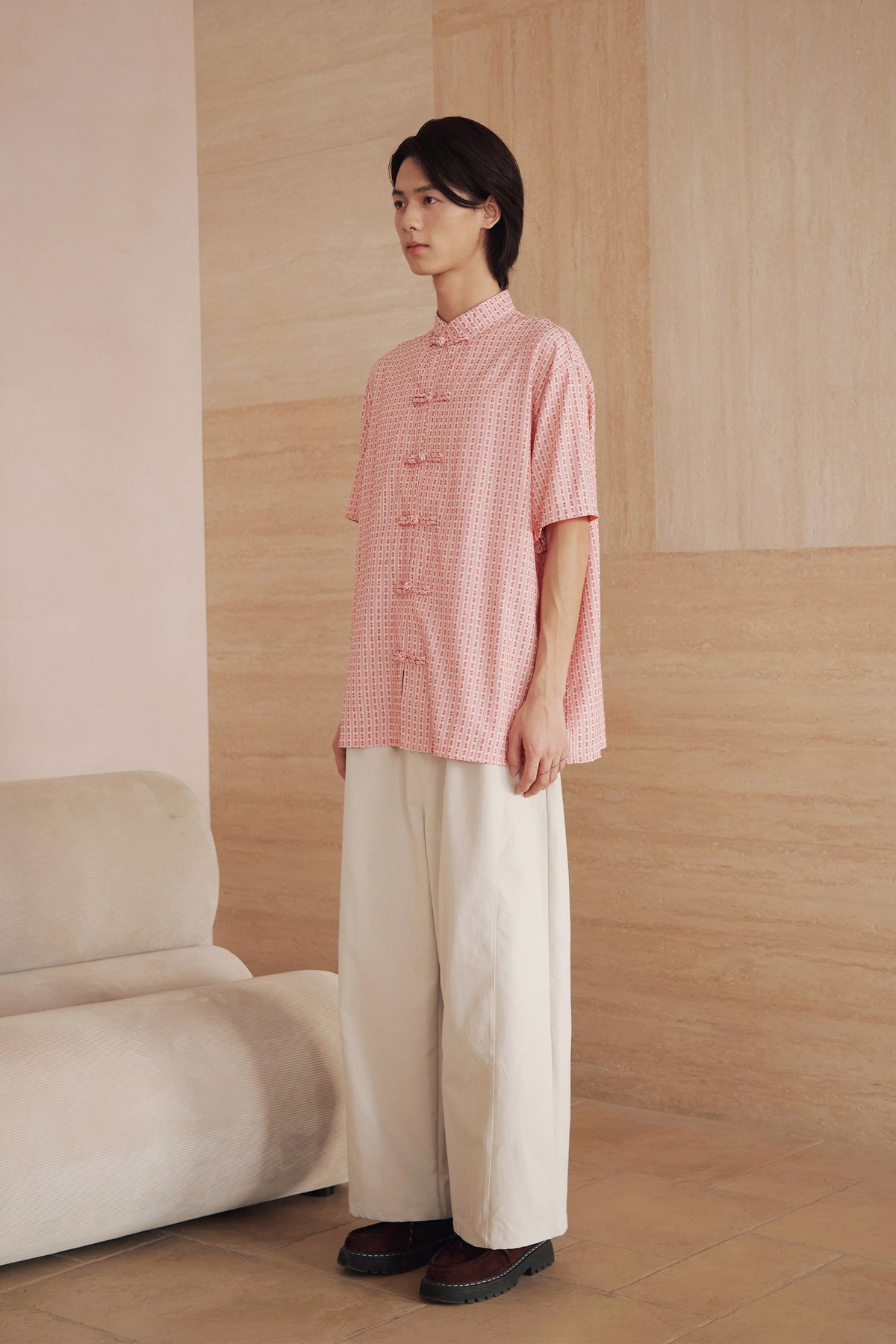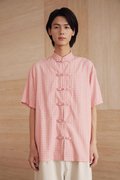 An oversized men’s Tang shirt featuring a Chinese stand collar and functional Chinese frog buttons at the front.