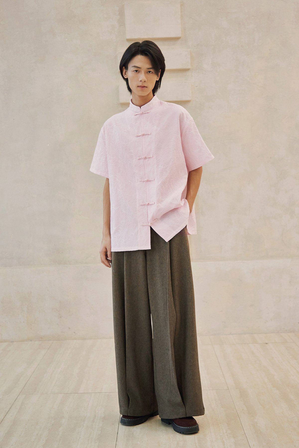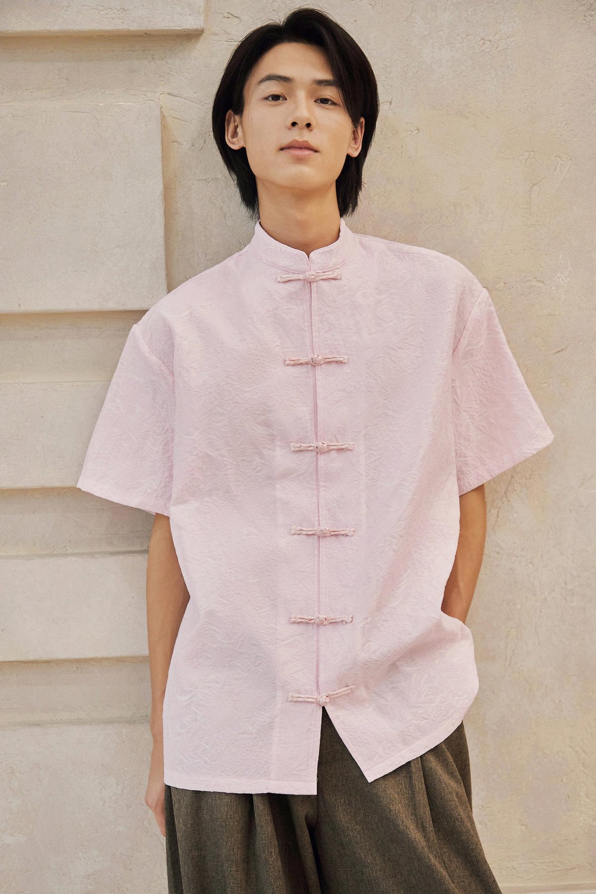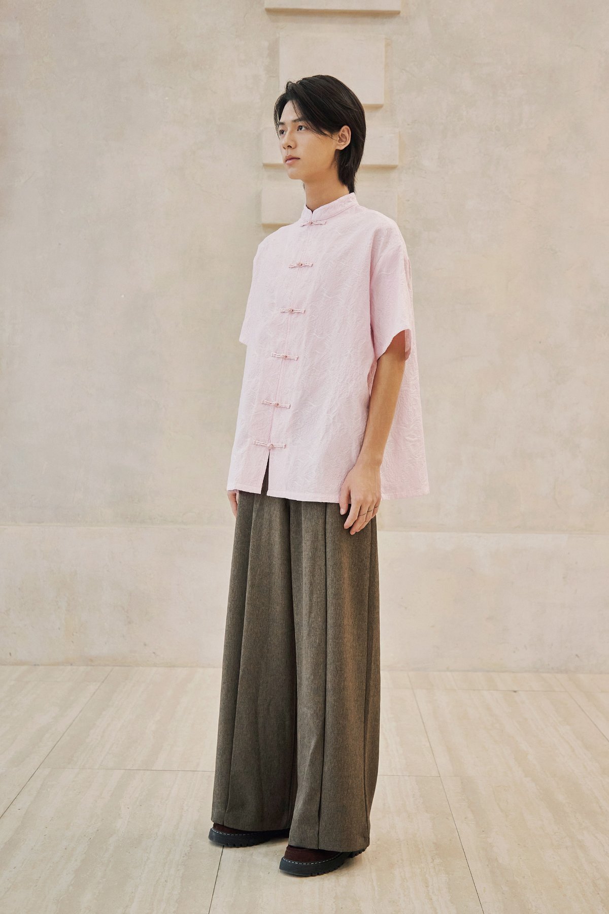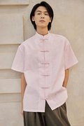 An oversized men’s Tang shirt featuring a Chinese stand collar and functional Chinese frog buttons at the front.