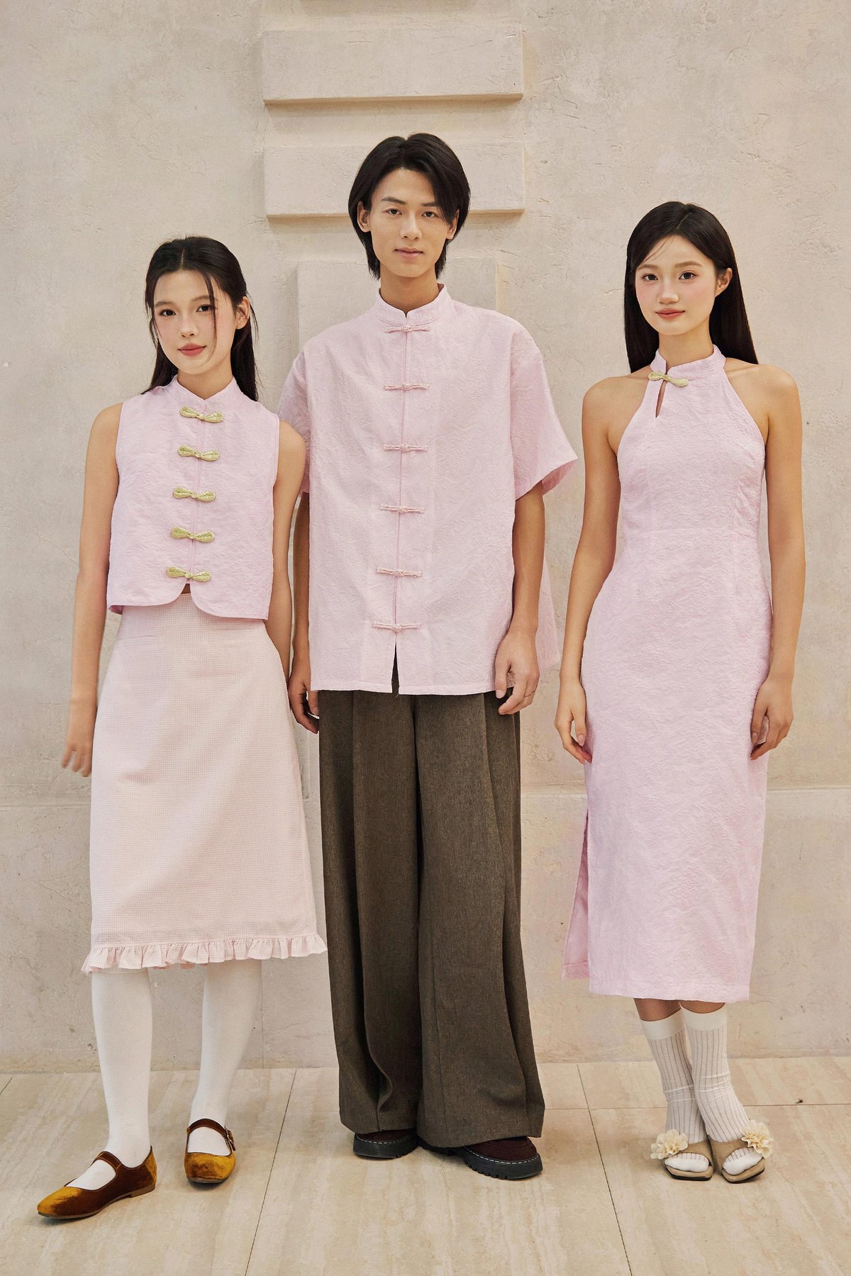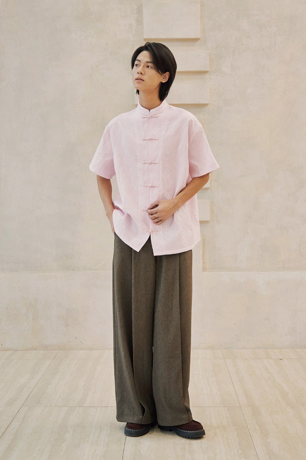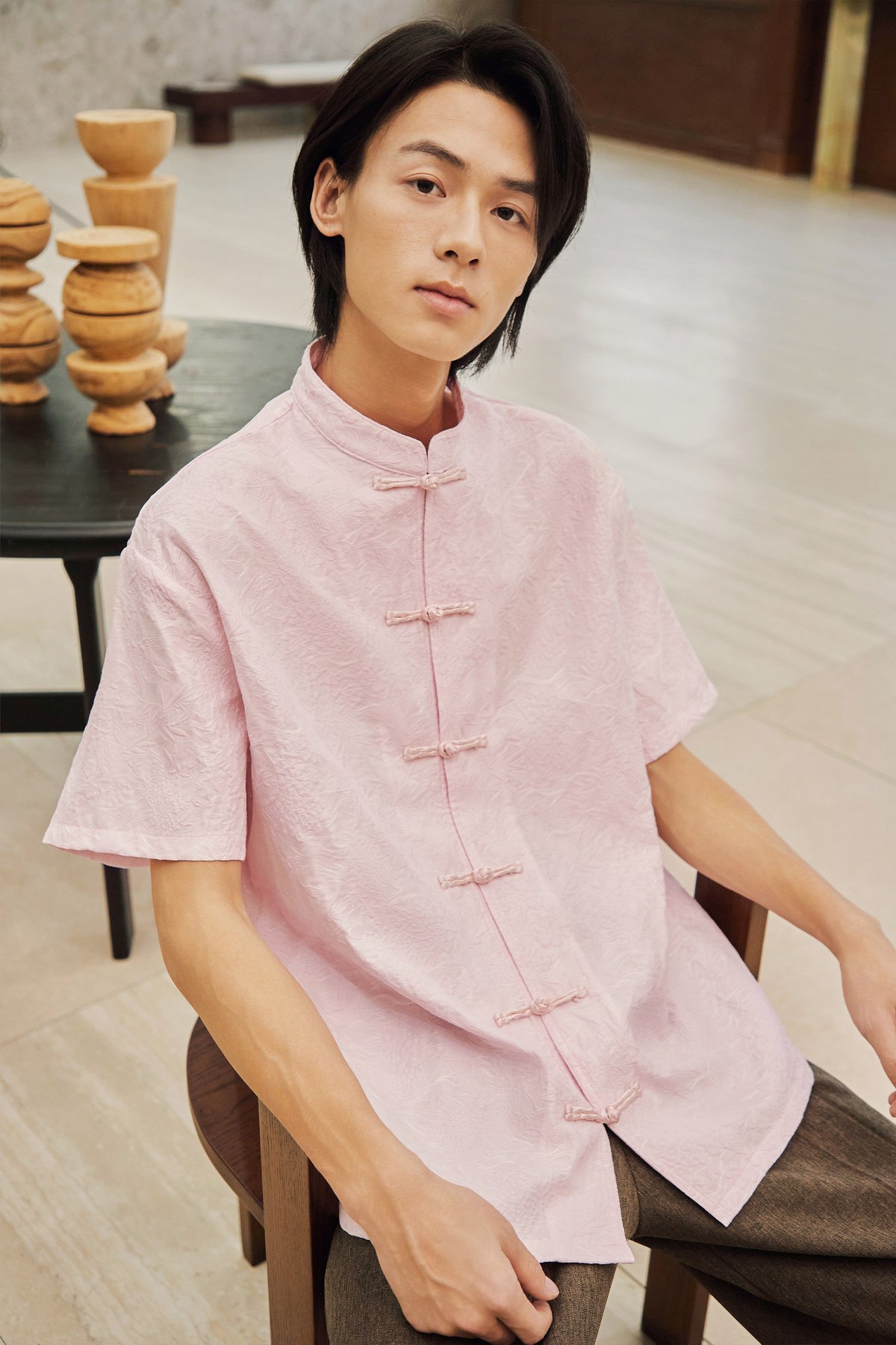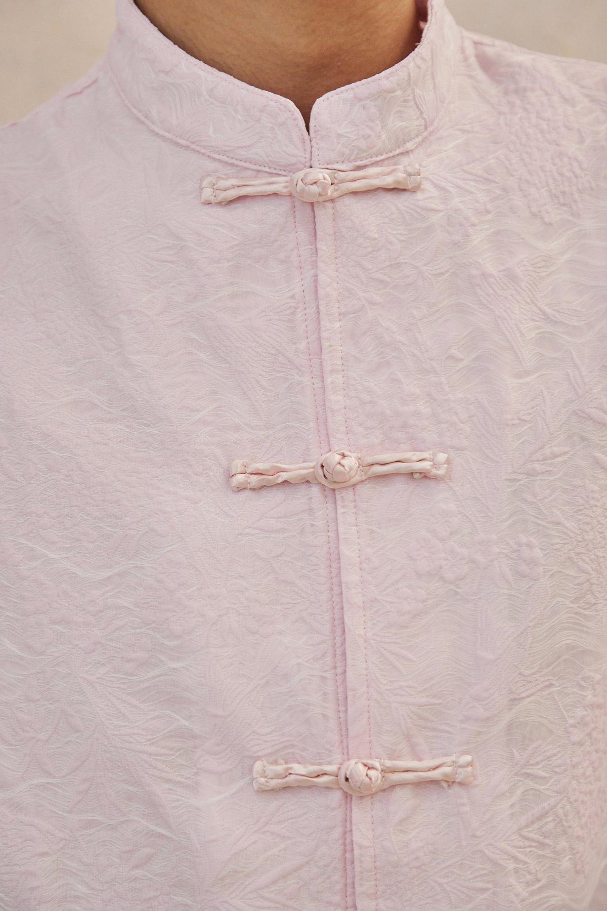 An oversized men’s Tang shirt featuring a Chinese stand collar and functional Chinese frog buttons at the front.