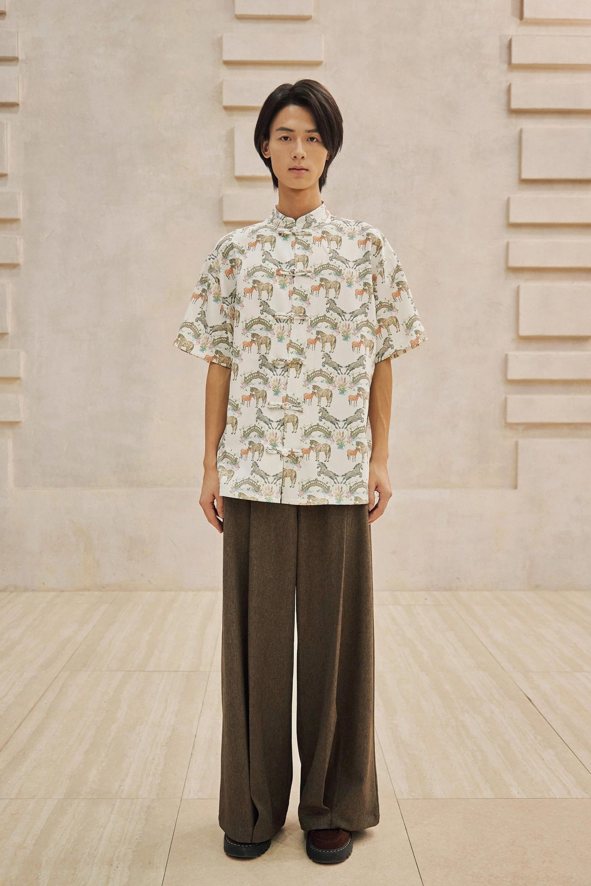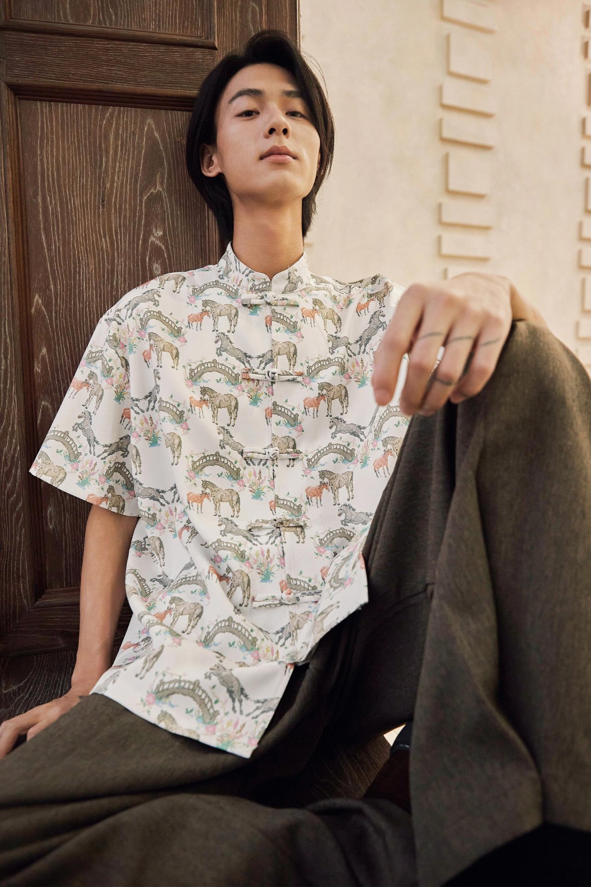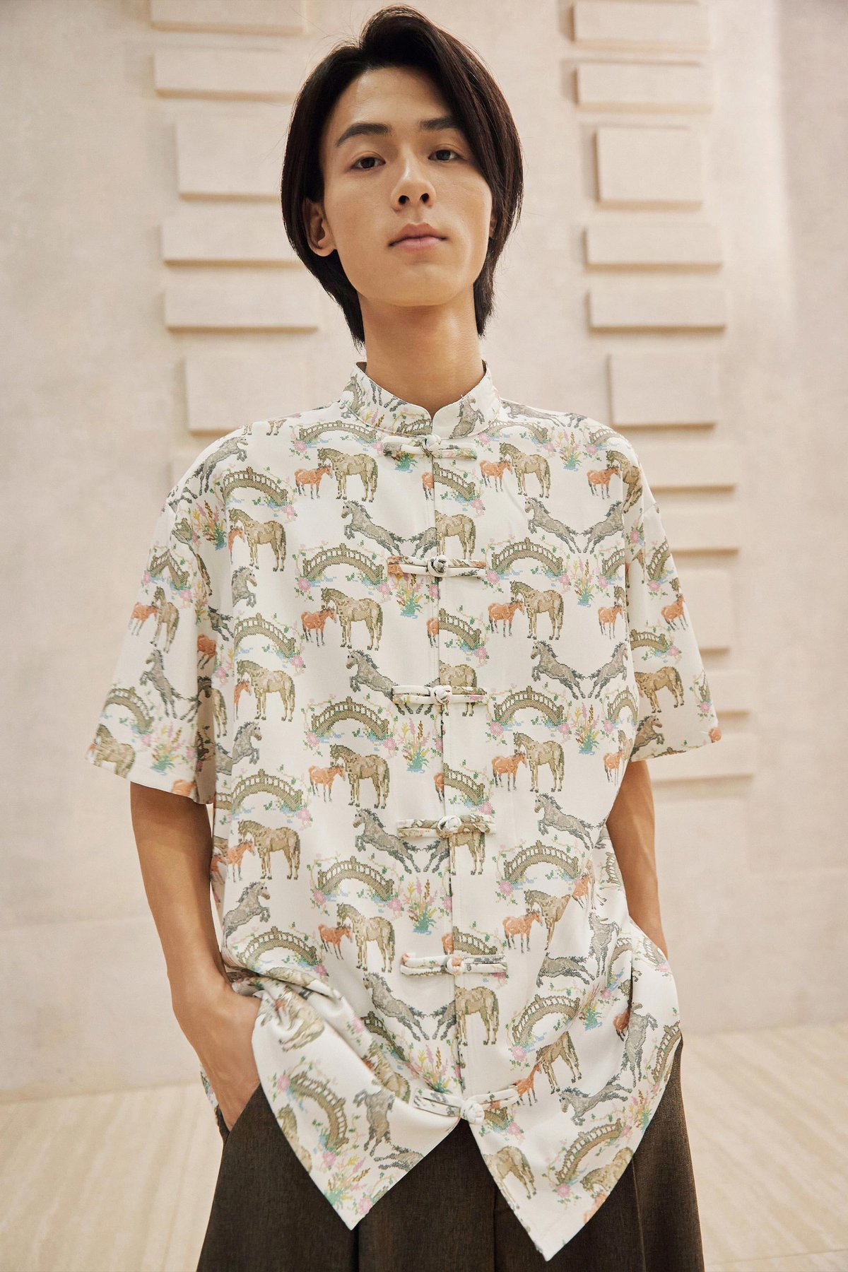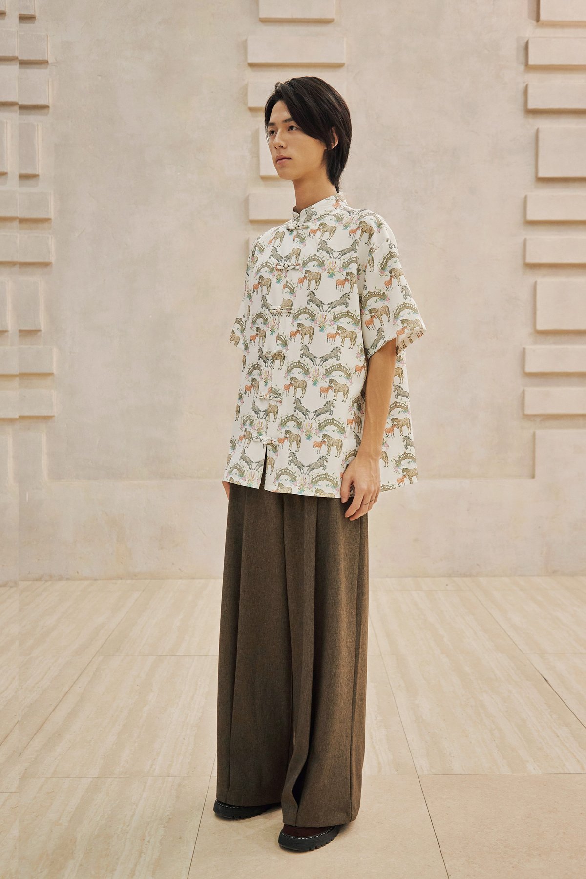 An oversized men’s Tang shirt featuring a Chinese stand collar and functional Chinese frog buttons at the front.