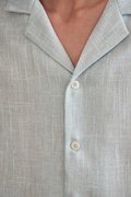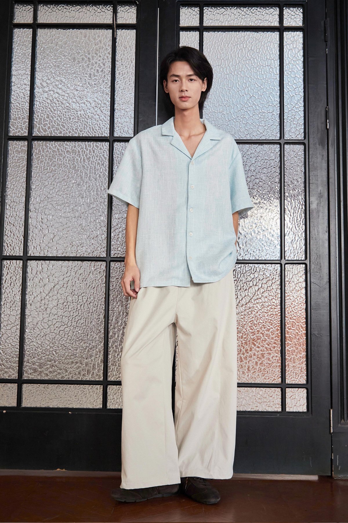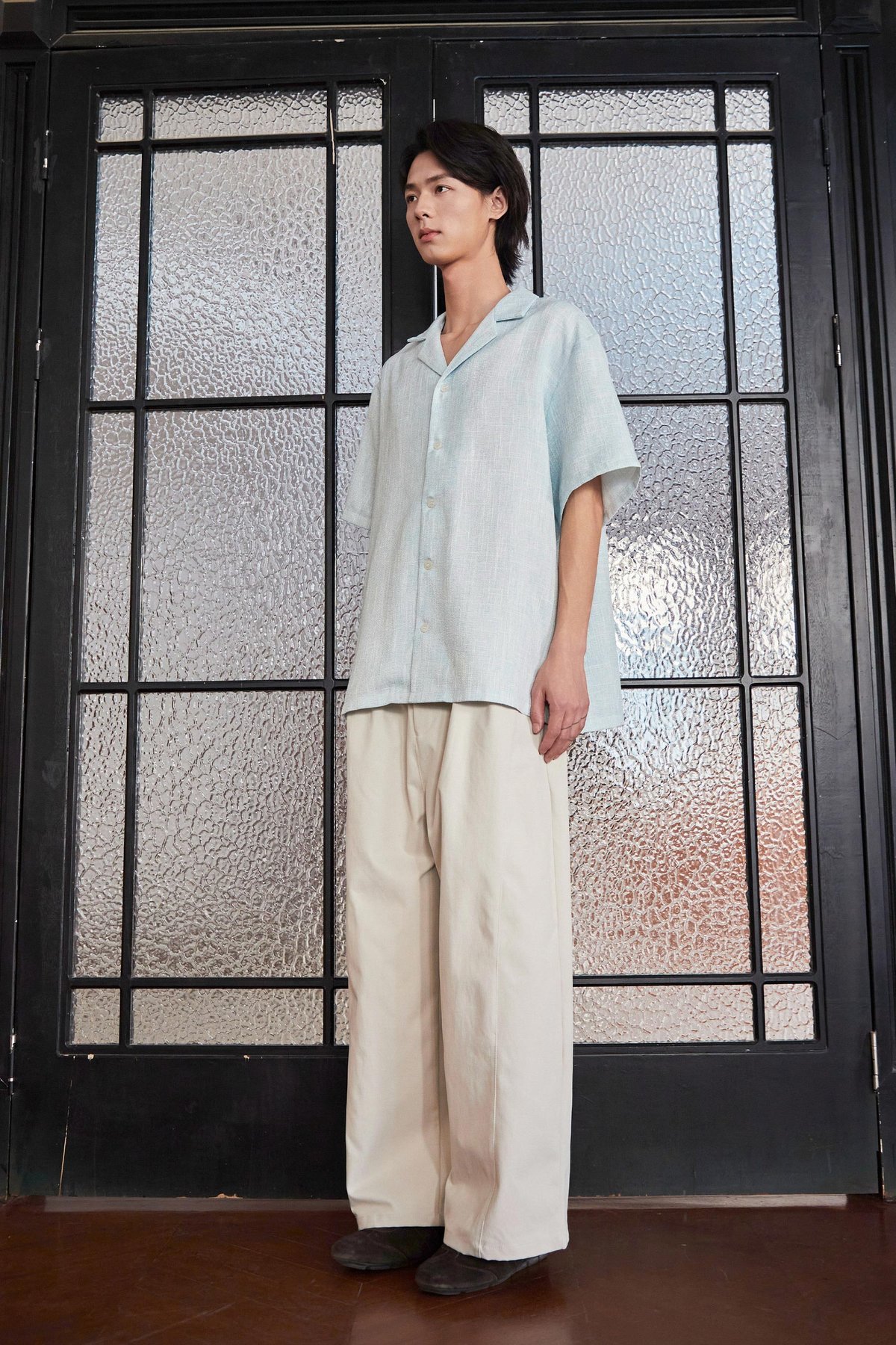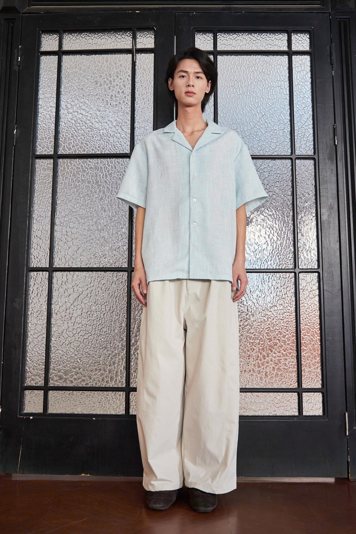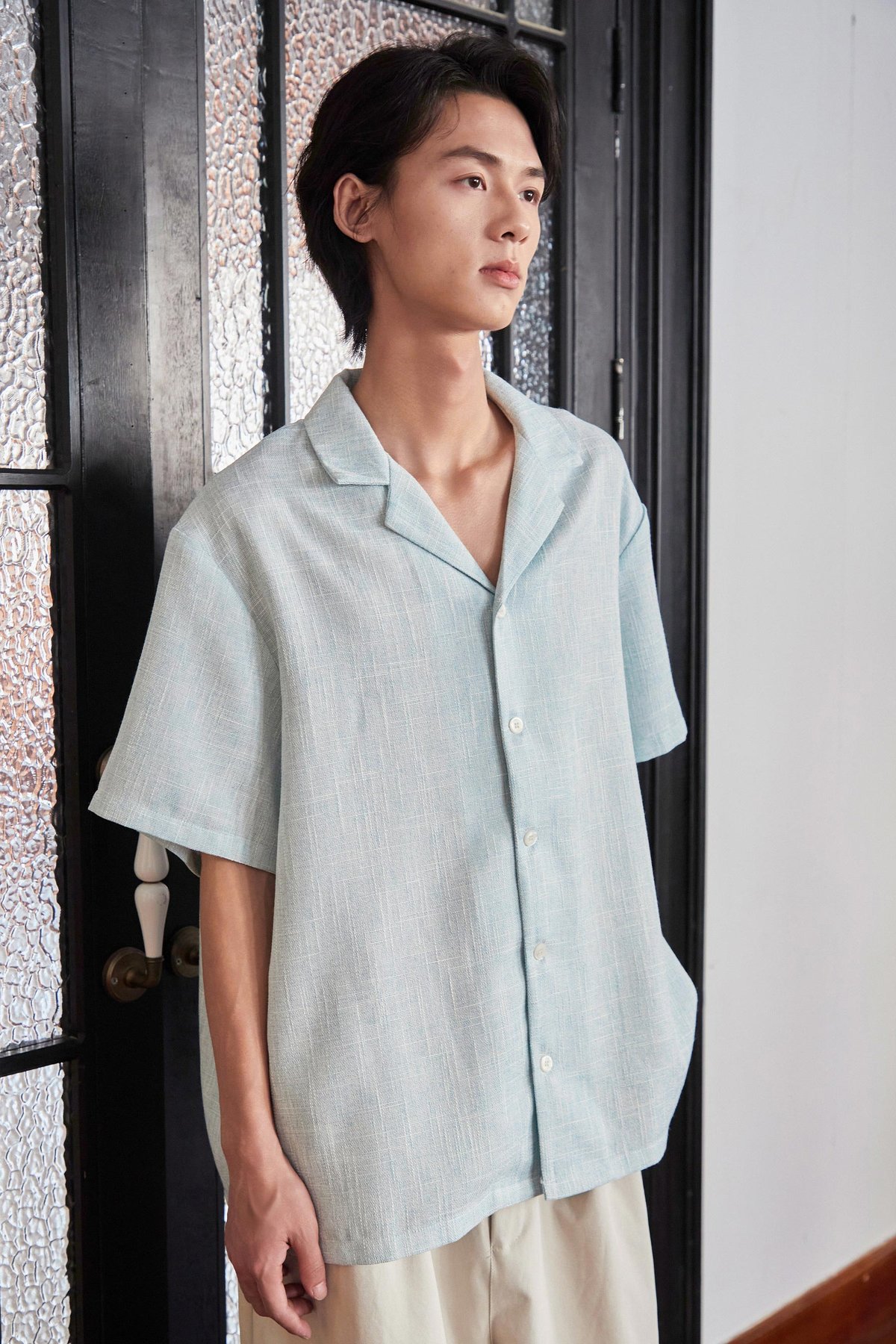 A shirt featuring a back yoke with double pleats, an open collar, functional front buttons and an oversized cut.
