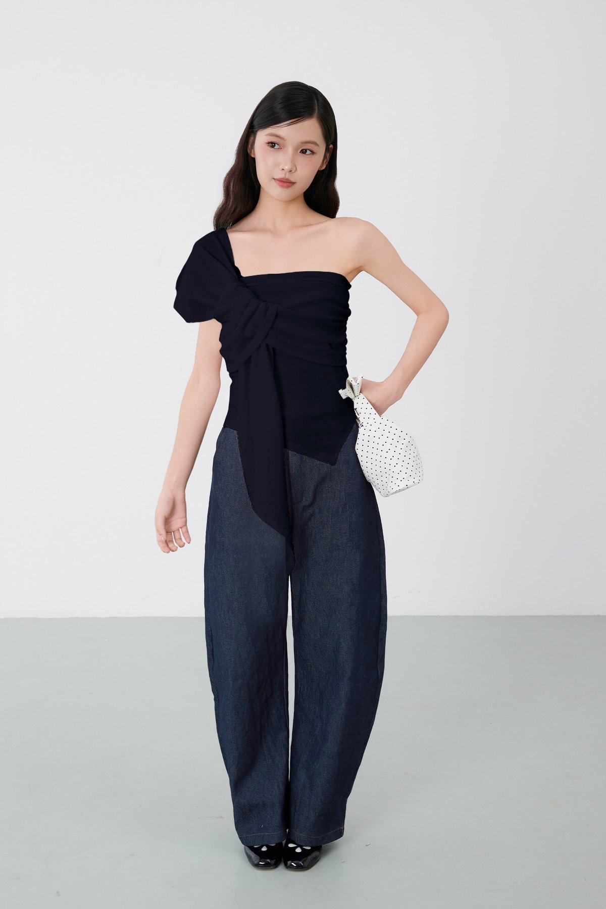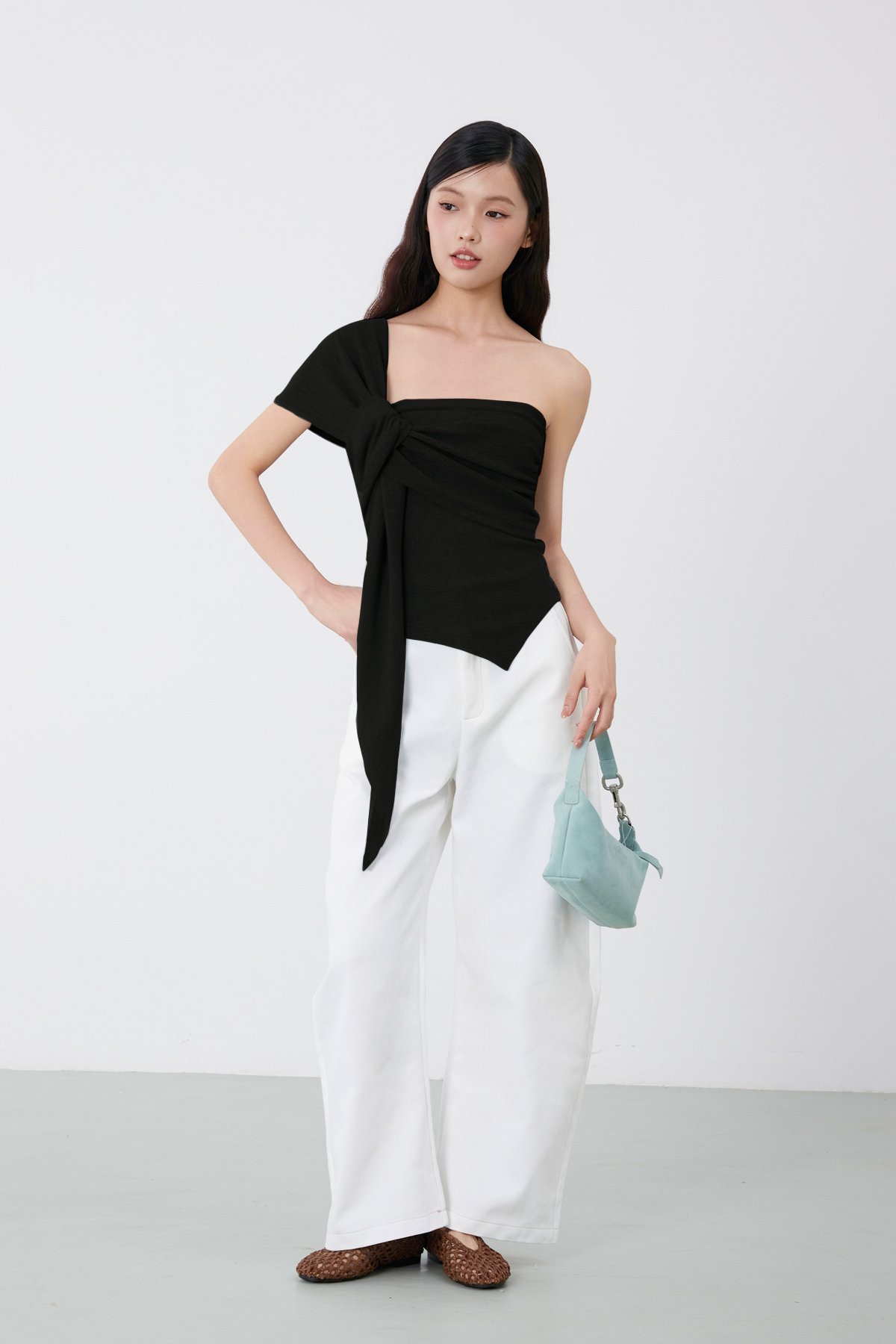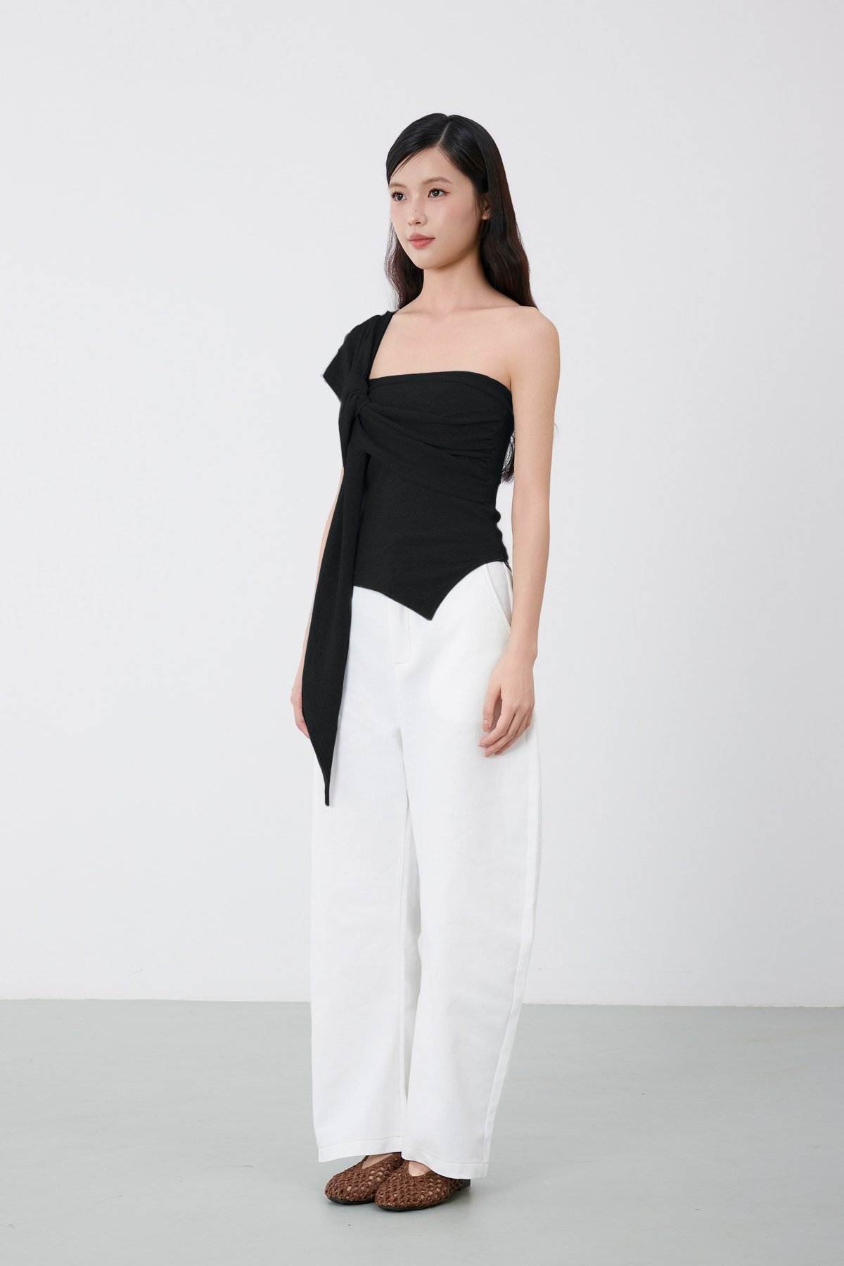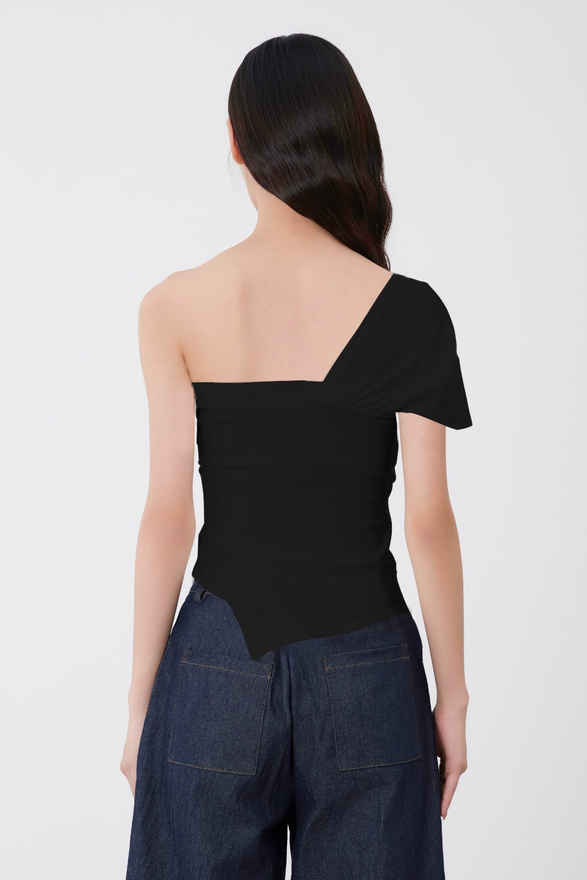 A slip on multiway top with asymmetrical hemline. Comes with side ruching detail.