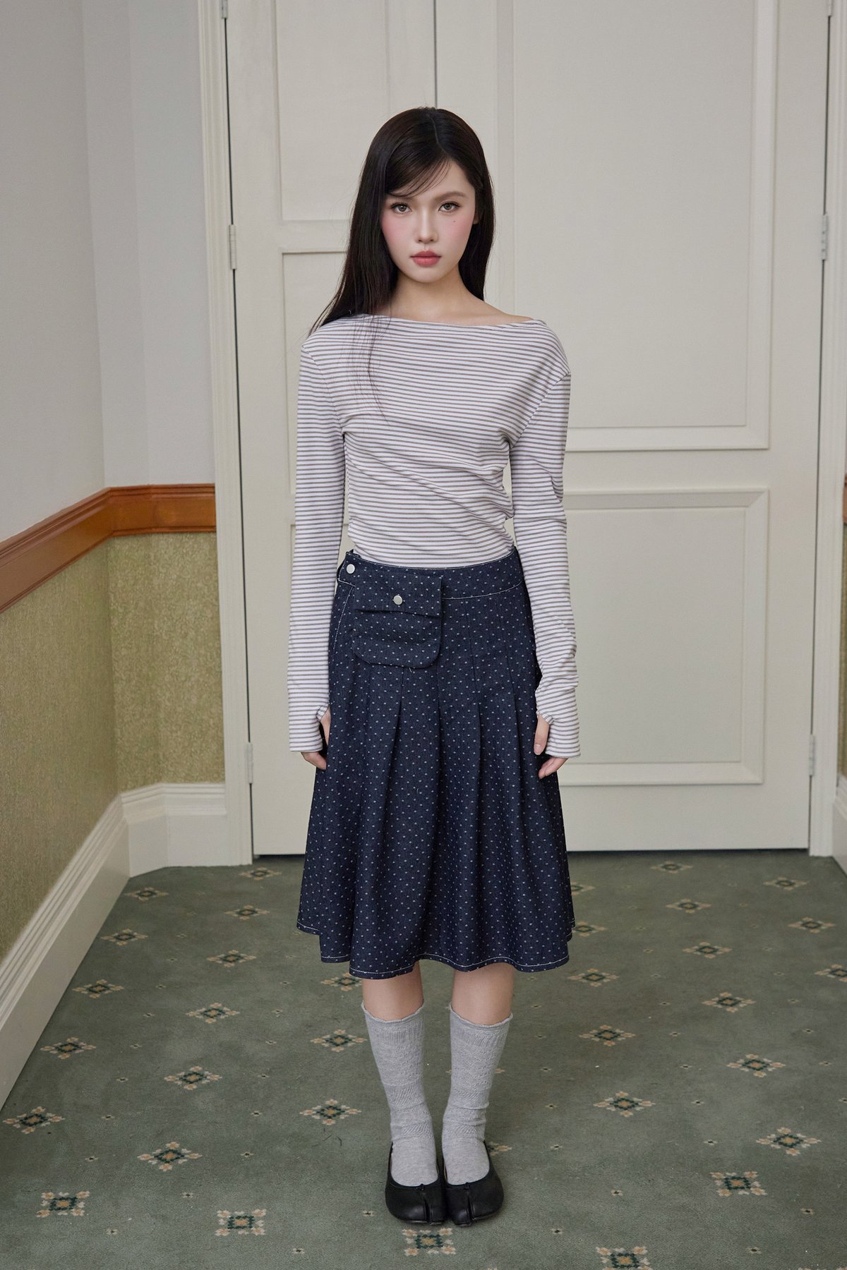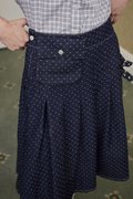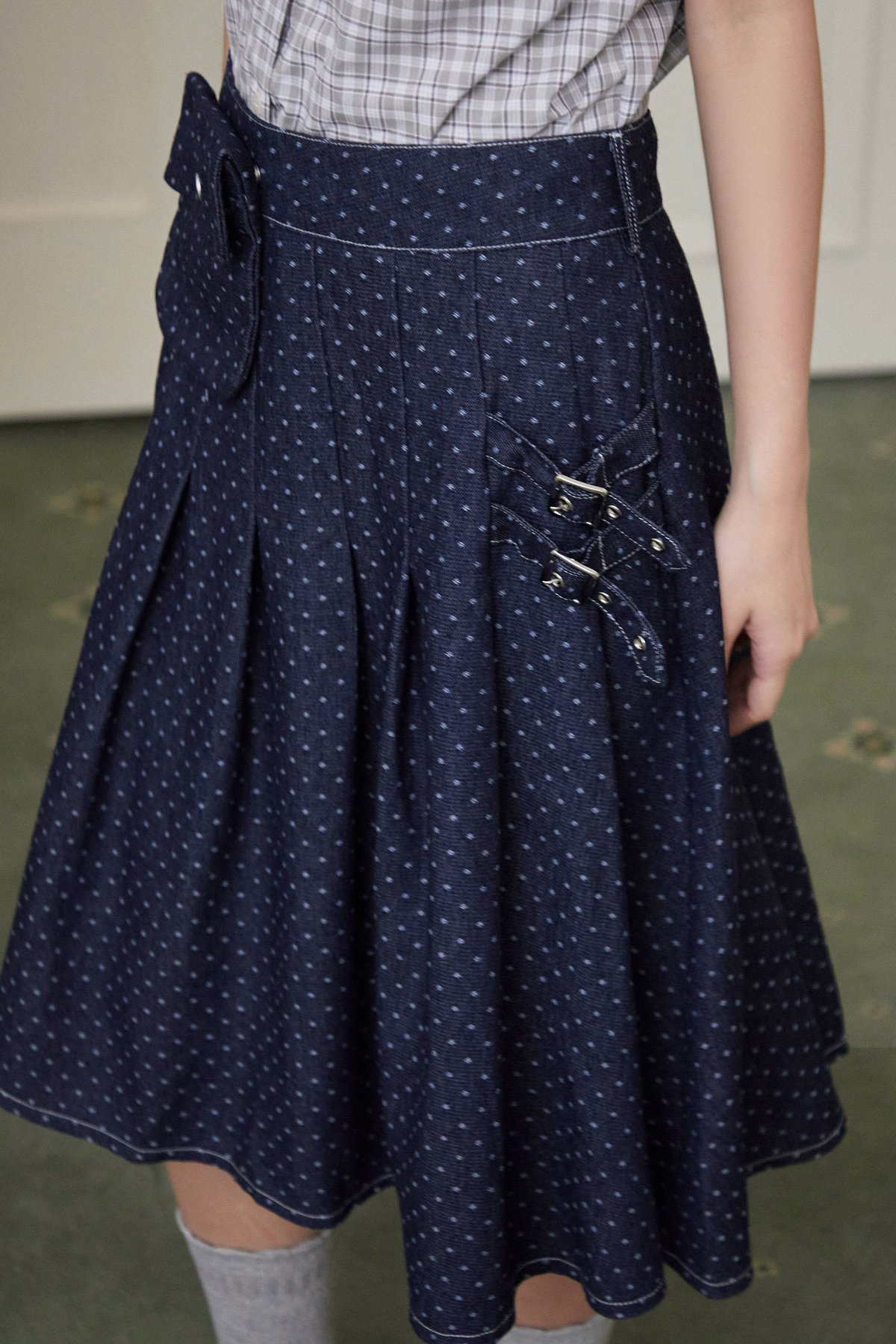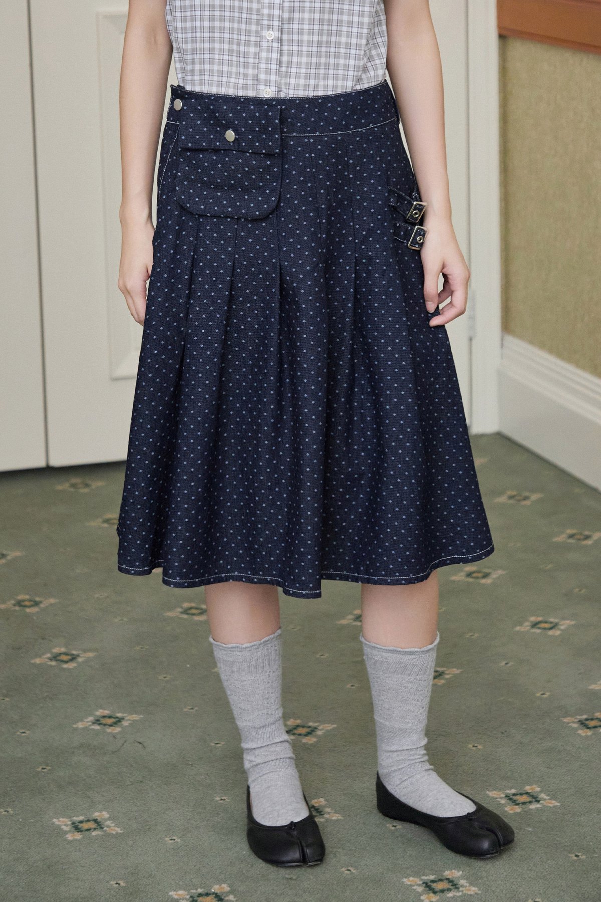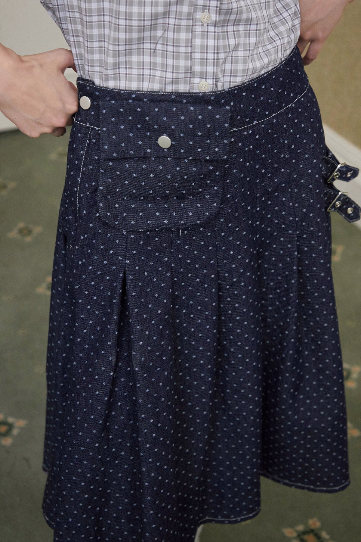 A skirt designed with side rivet button and zipper closure, detachable adjustable pocket, and faux side belt details. Finished with front and back pleats and belt loops.