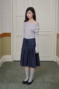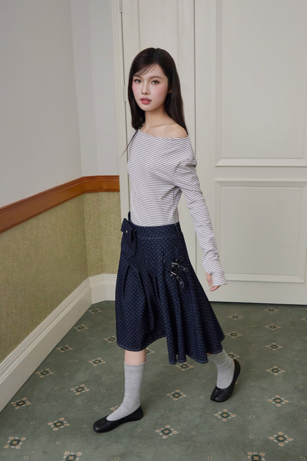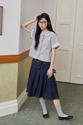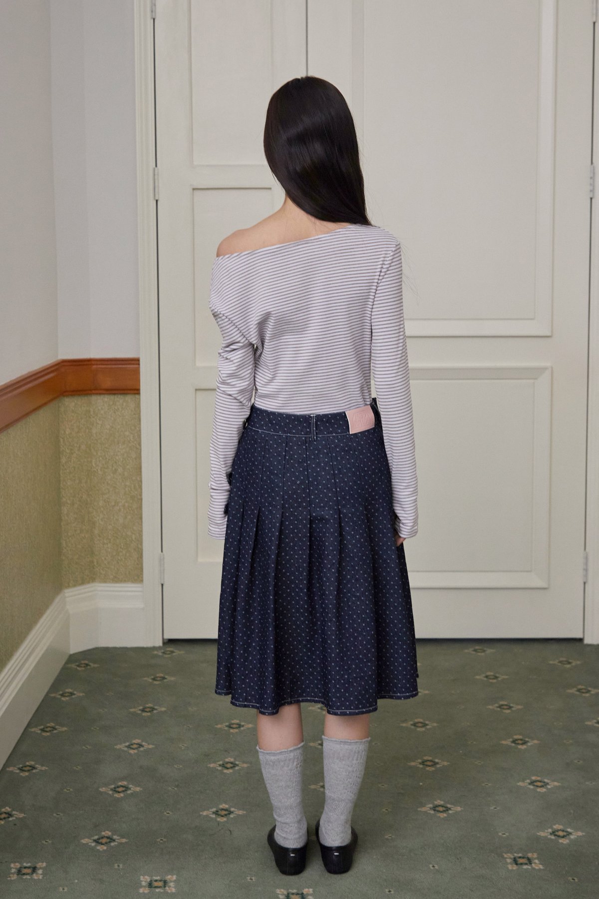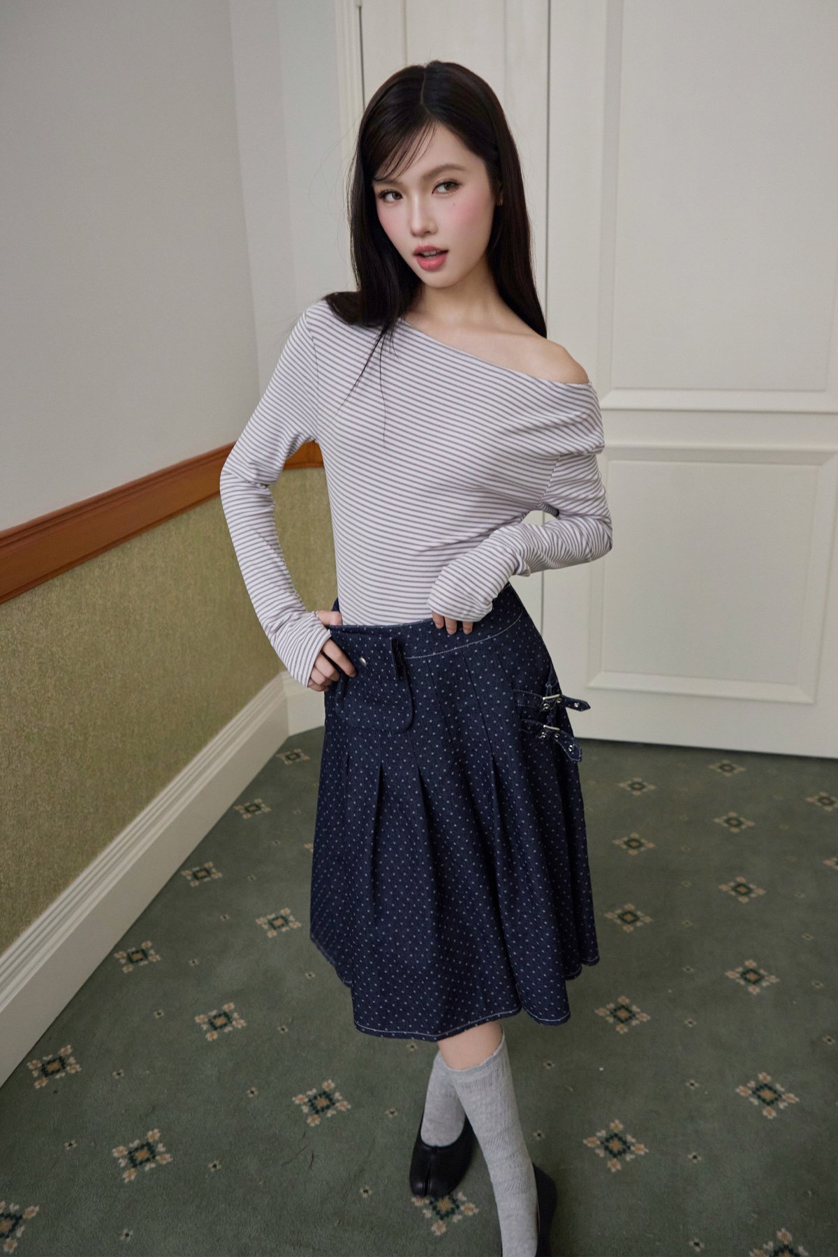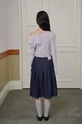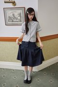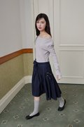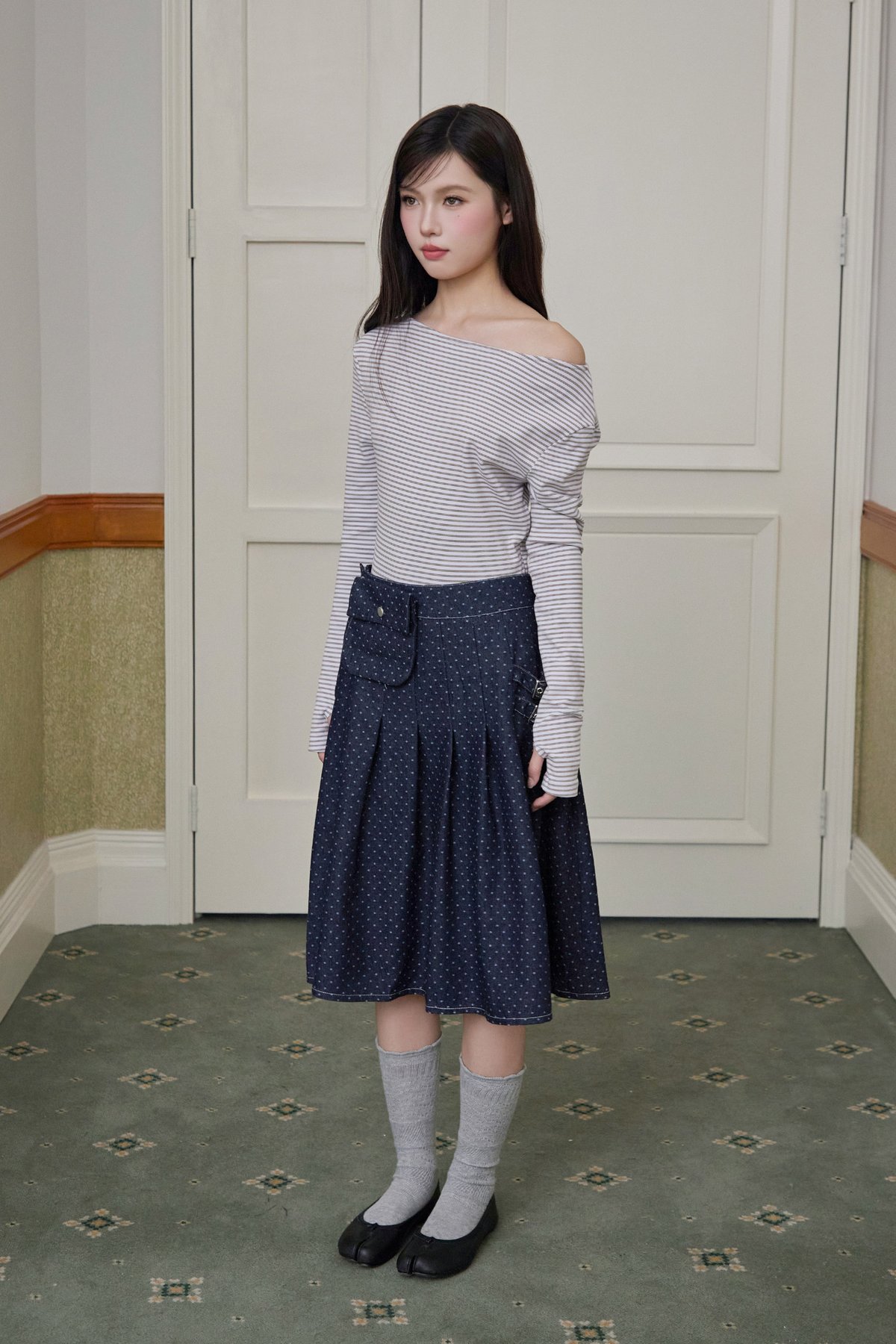 A skirt designed with side rivet button and zipper closure, detachable adjustable pocket, and faux side belt details. Finished with front and back pleats and belt loops.