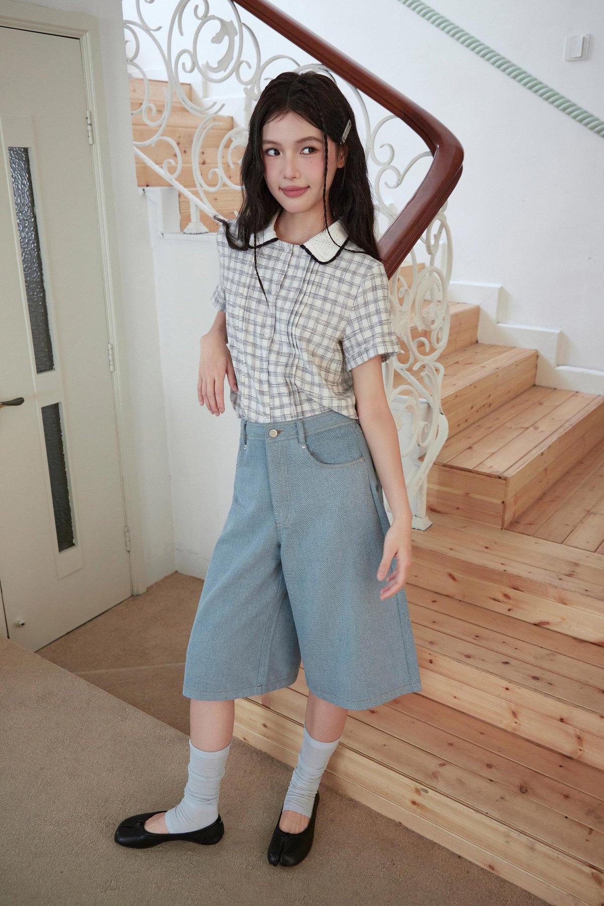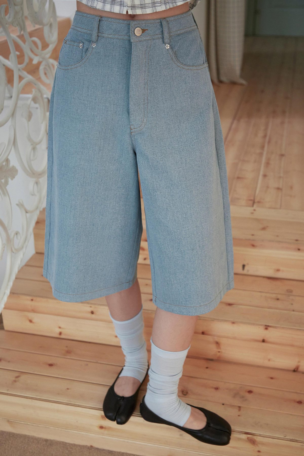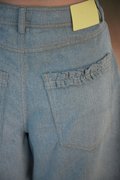 Mid-rise jorts with functional front pockets, ruffled back pockets, and rivet button with zipper fly closure..