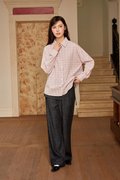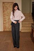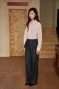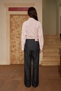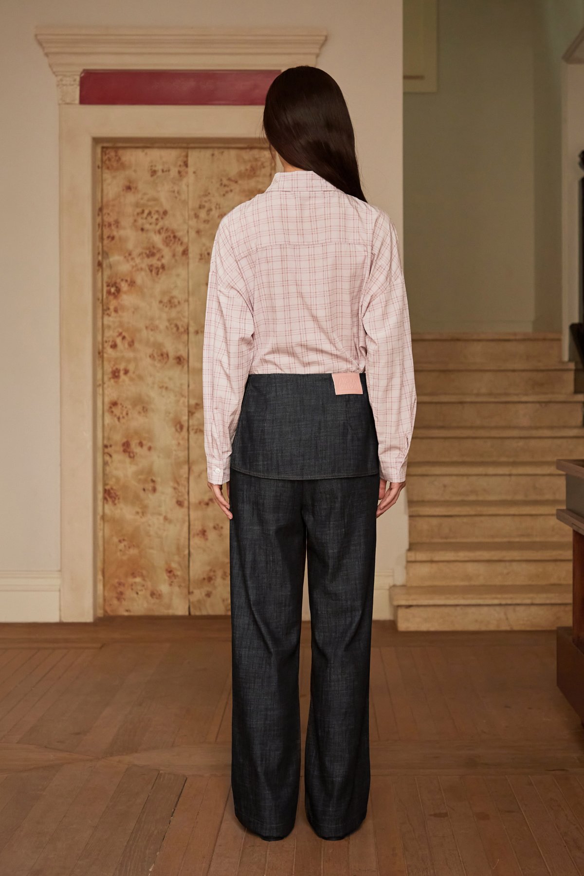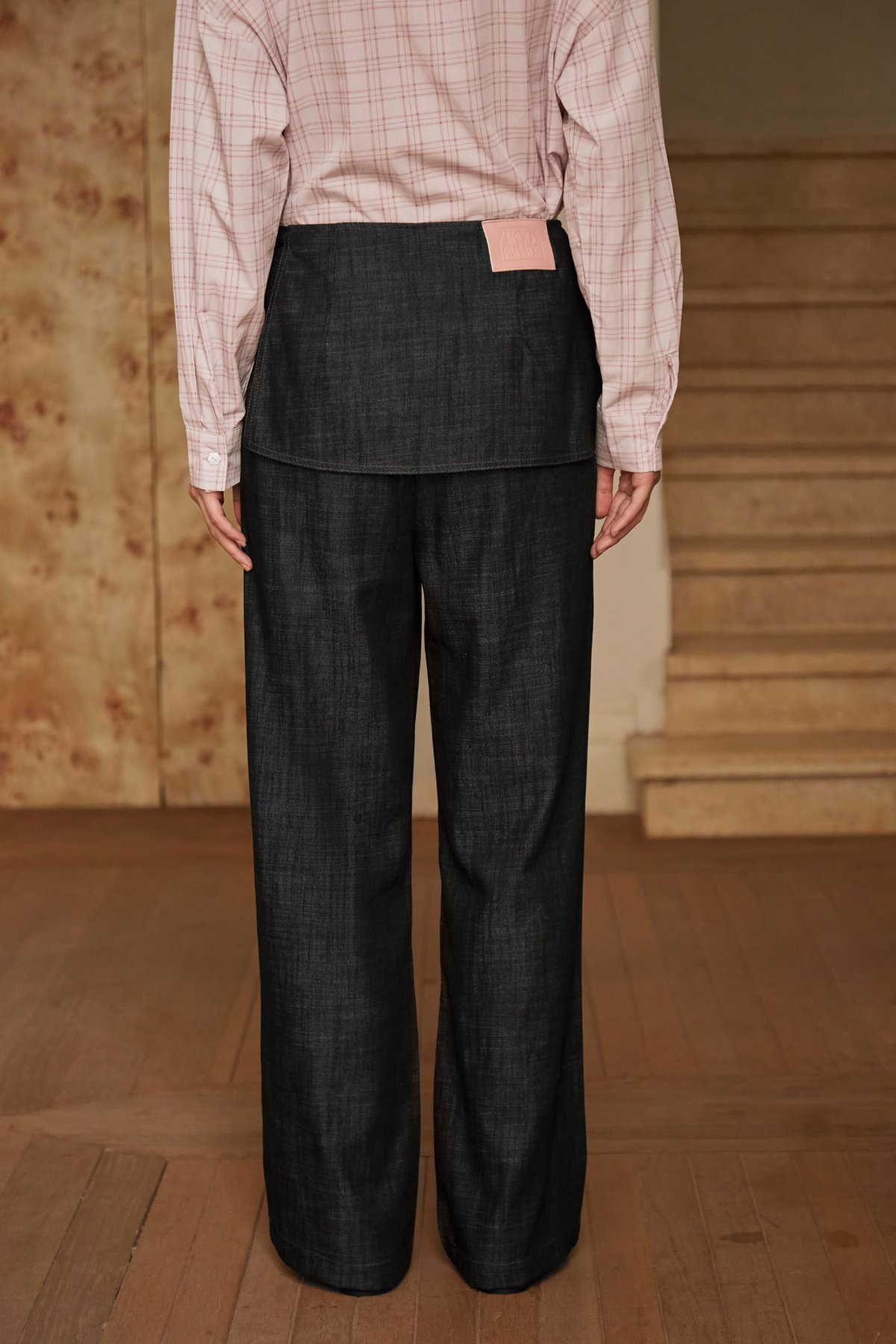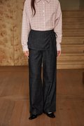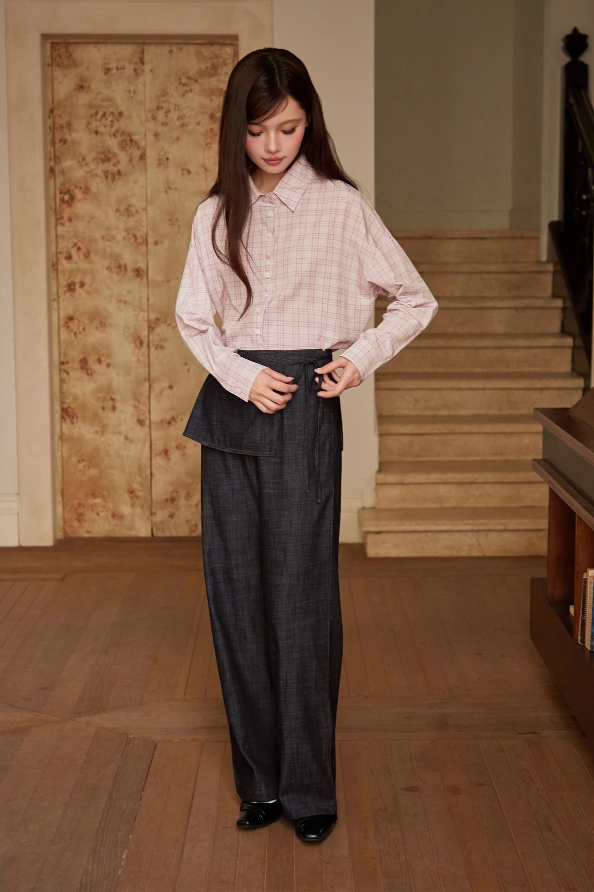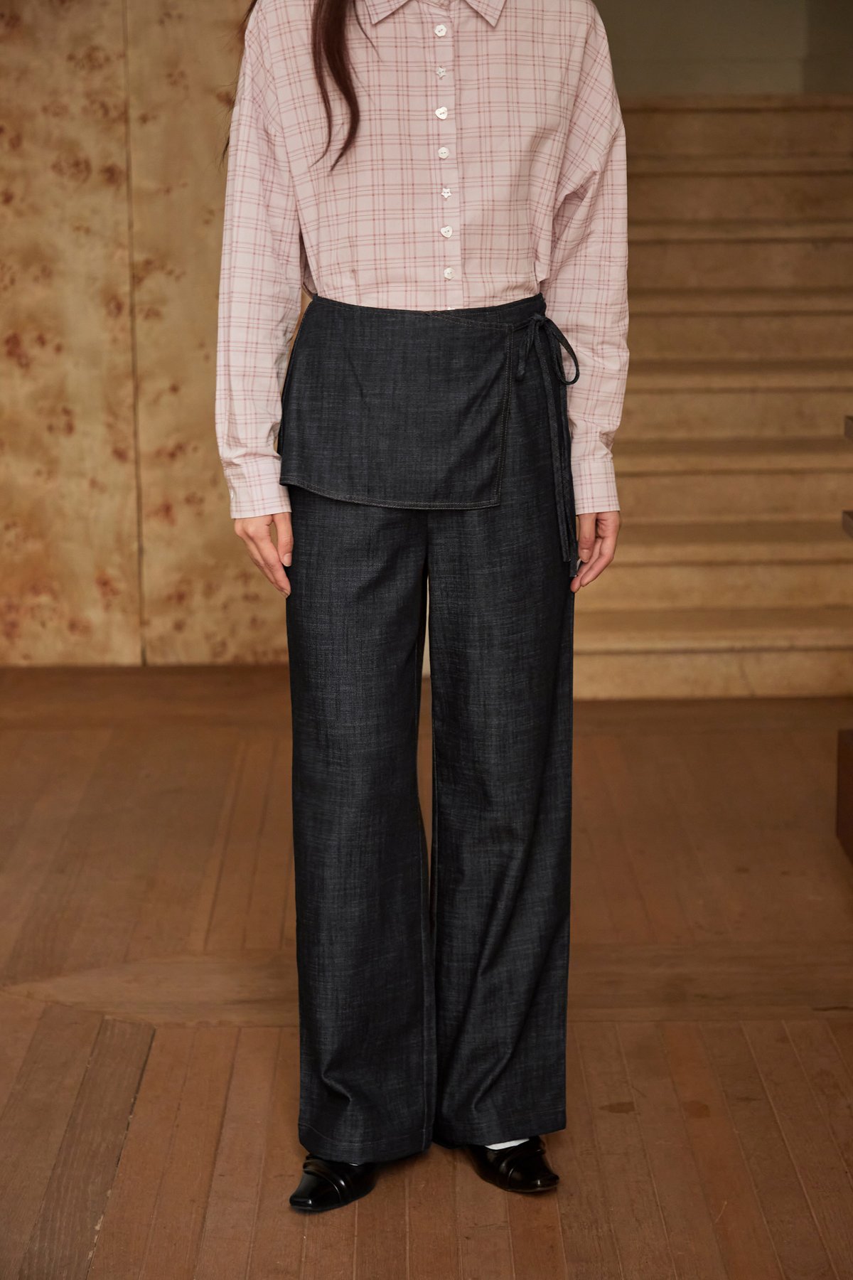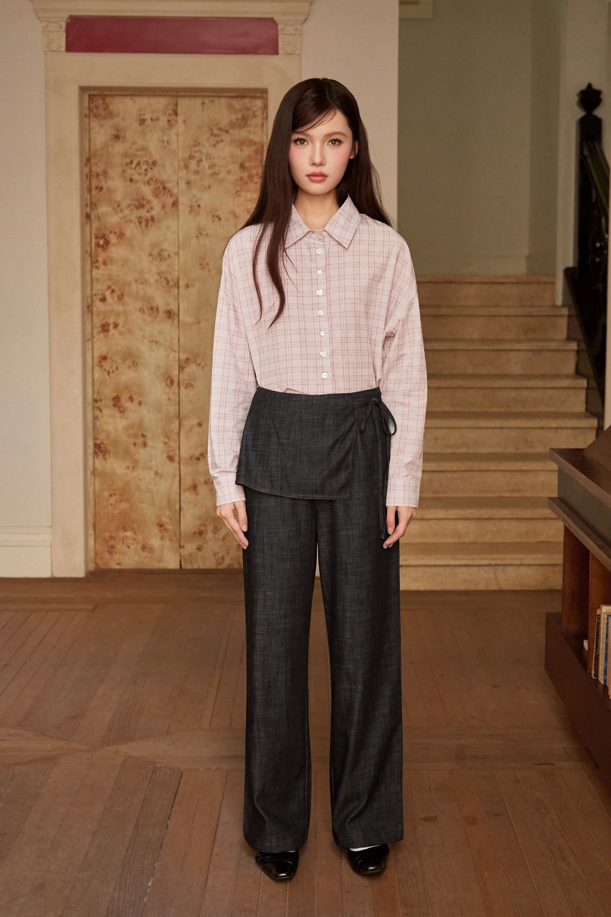 Skirt pants with a straight silhouette, featuring a side concealed zipper and an adjustable side ribbon tie. The skirt panel is fixed onto the pants for a sleek, layered finish.