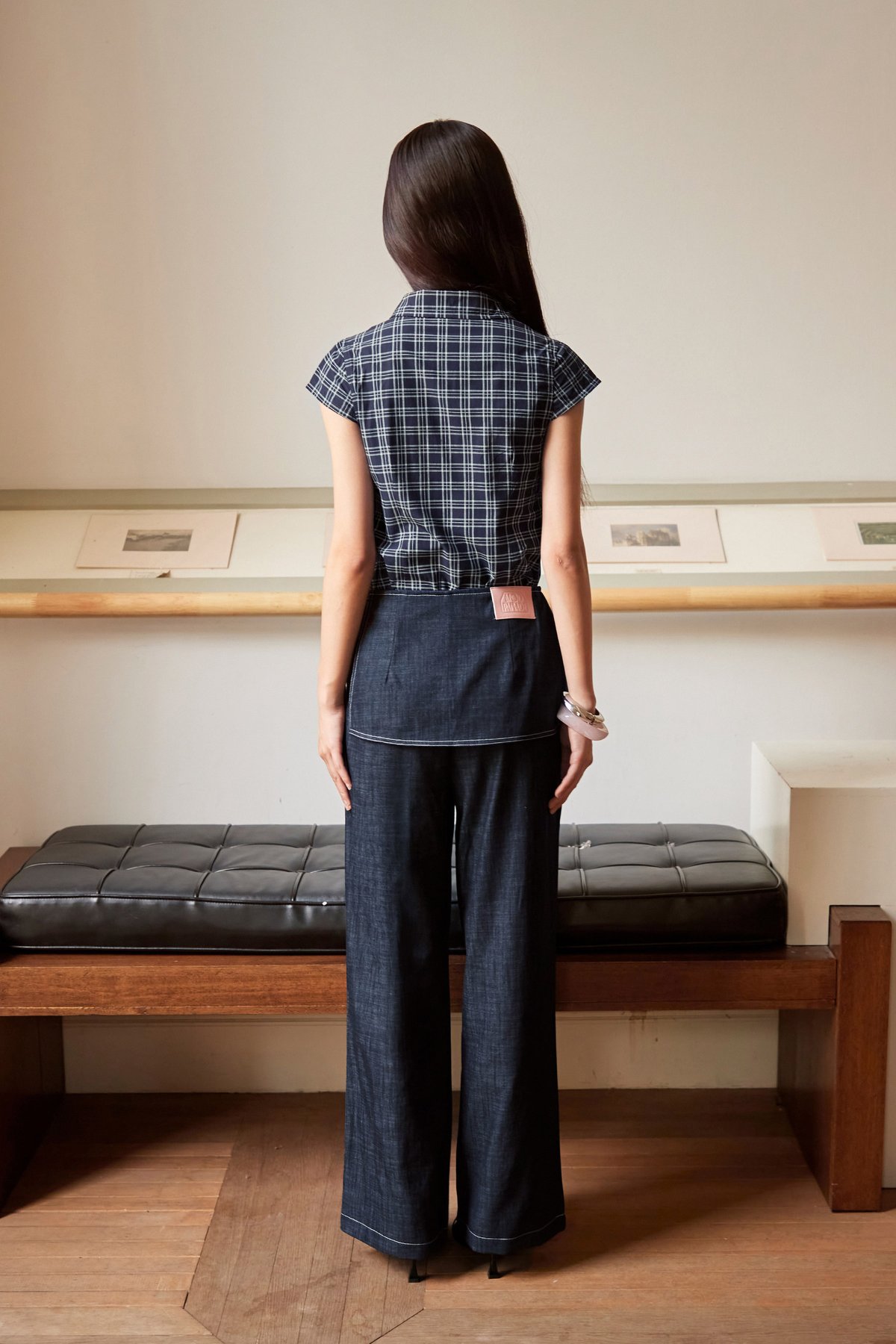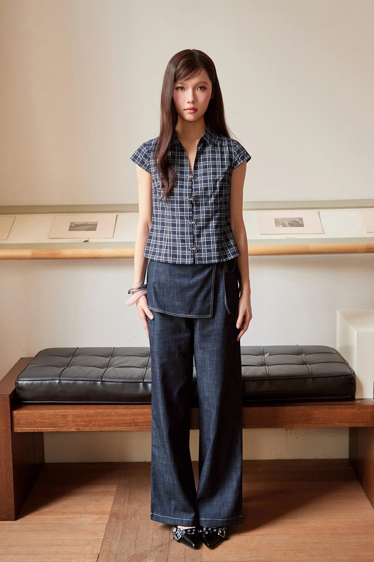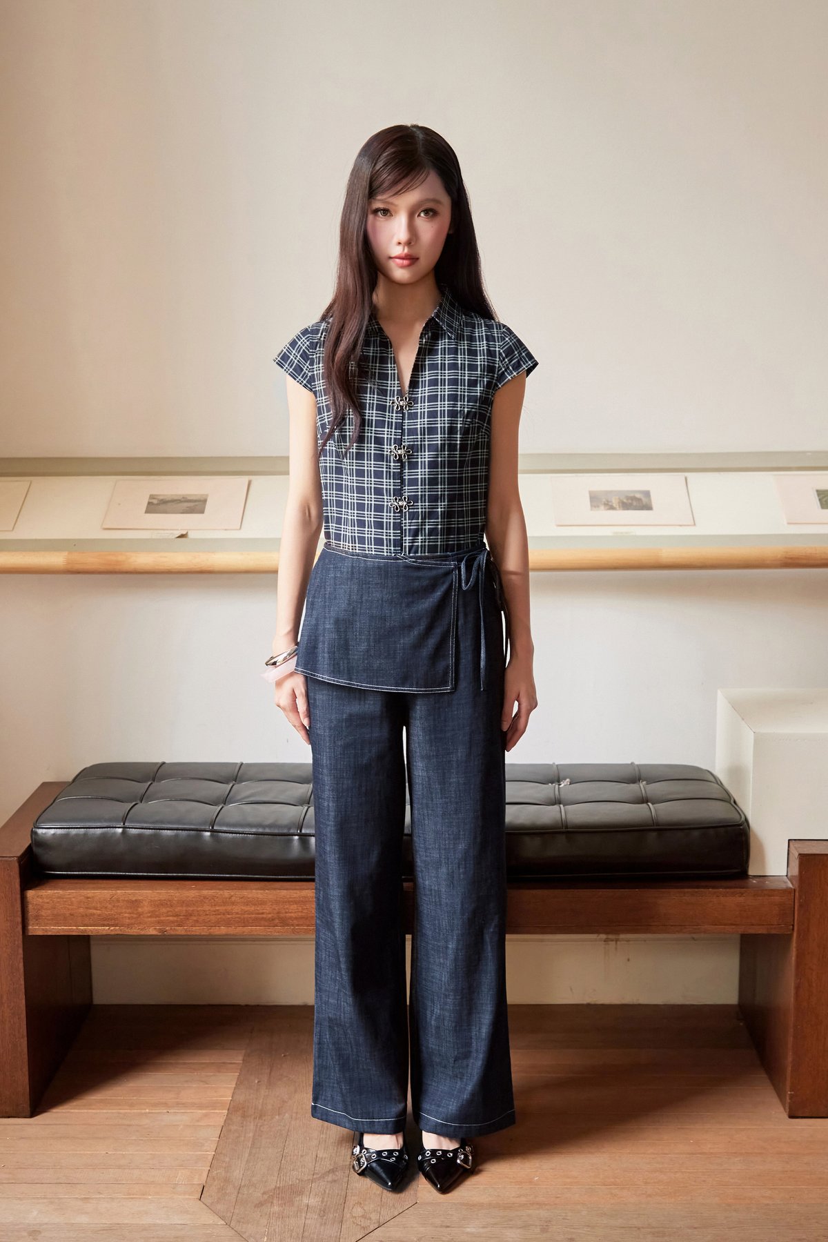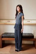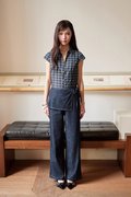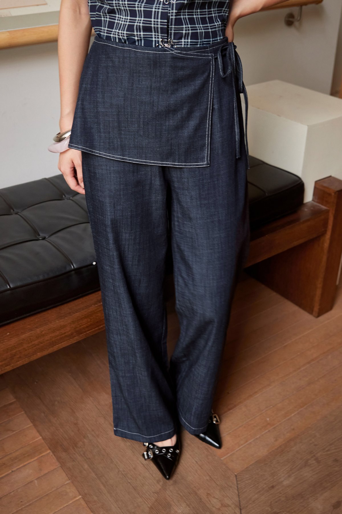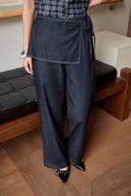Skirt pants with a straight silhouette, featuring a side concealed zipper and an adjustable side ribbon tie. The skirt panel is fixed onto the pants for a sleek, layered finish.