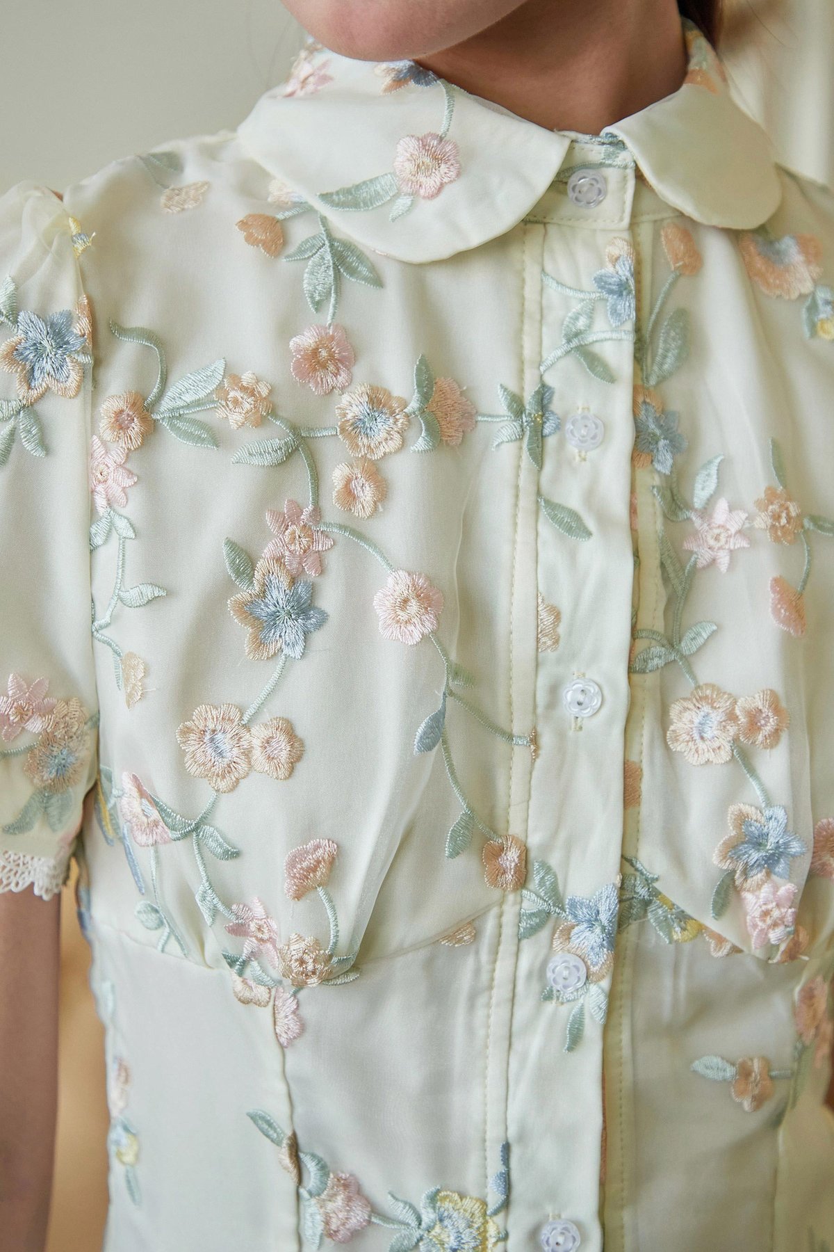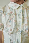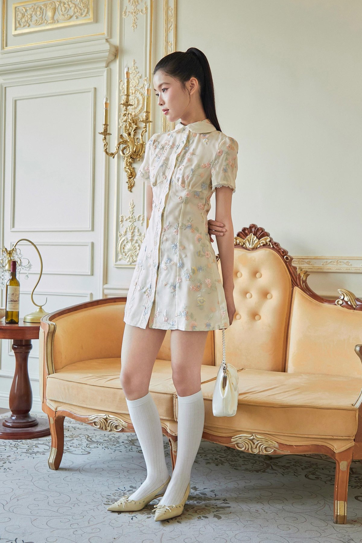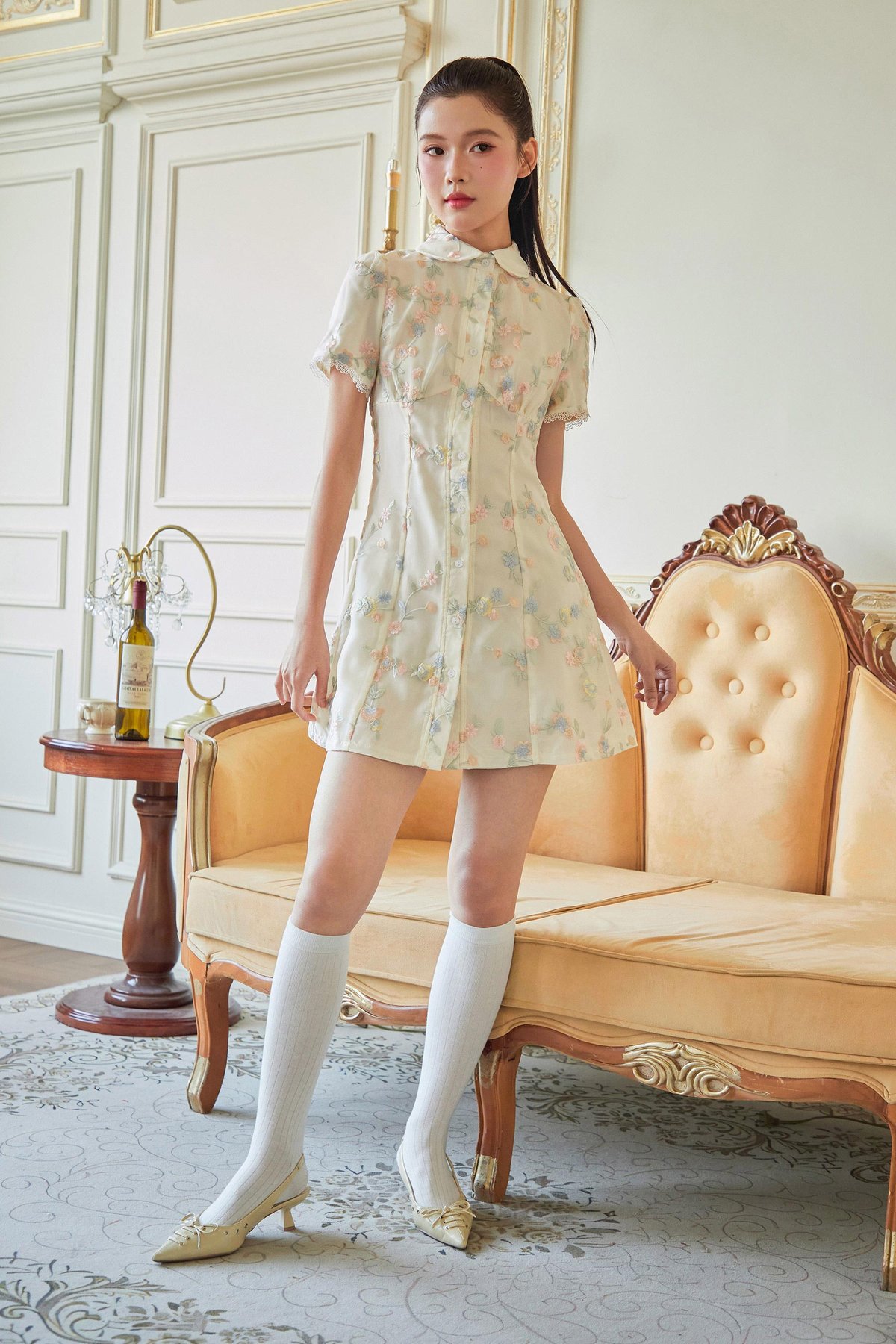 A dress featuring a Peter Pan collar, functional front buttons, and lace trim at the sleeve hems.