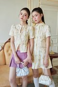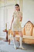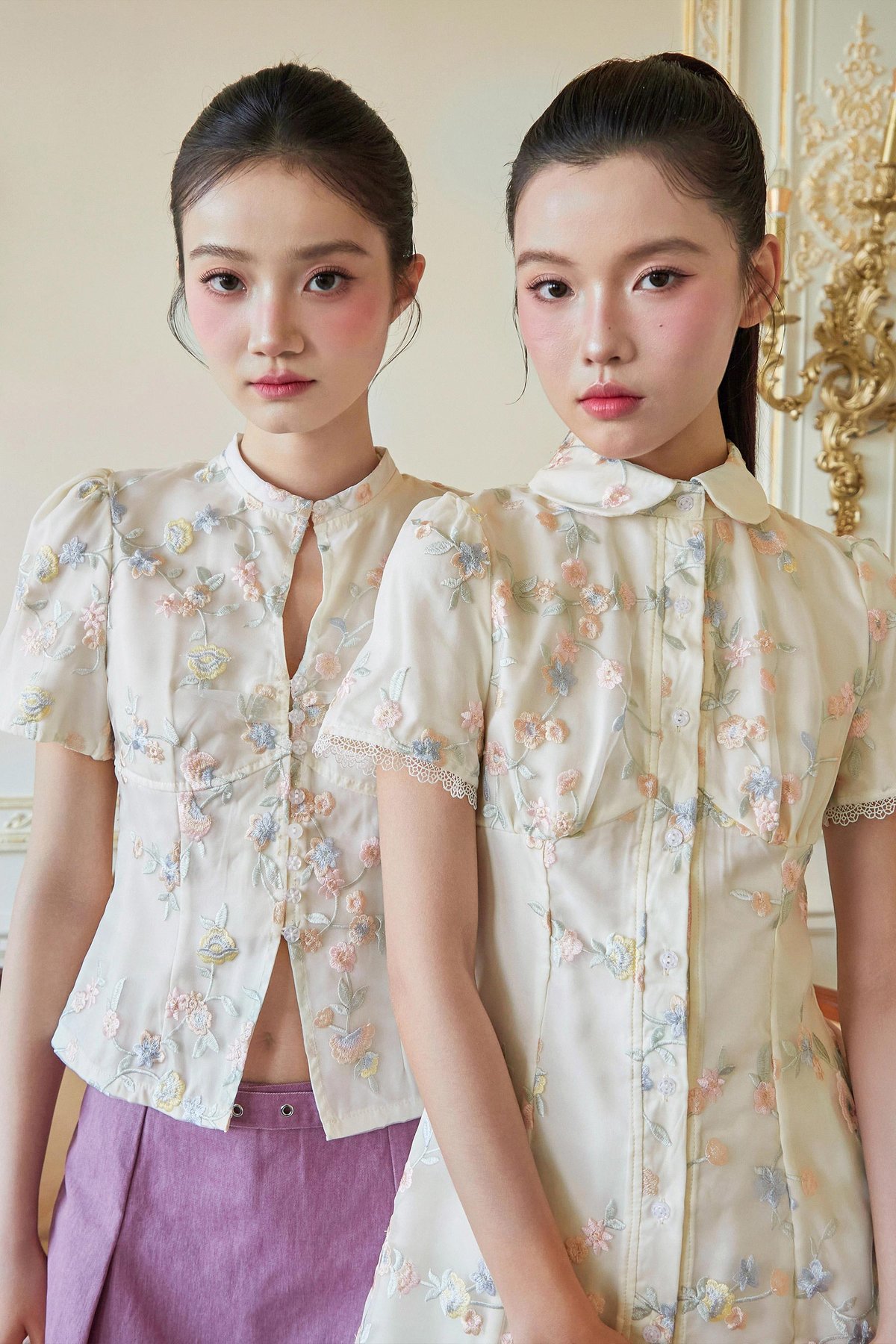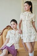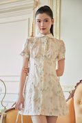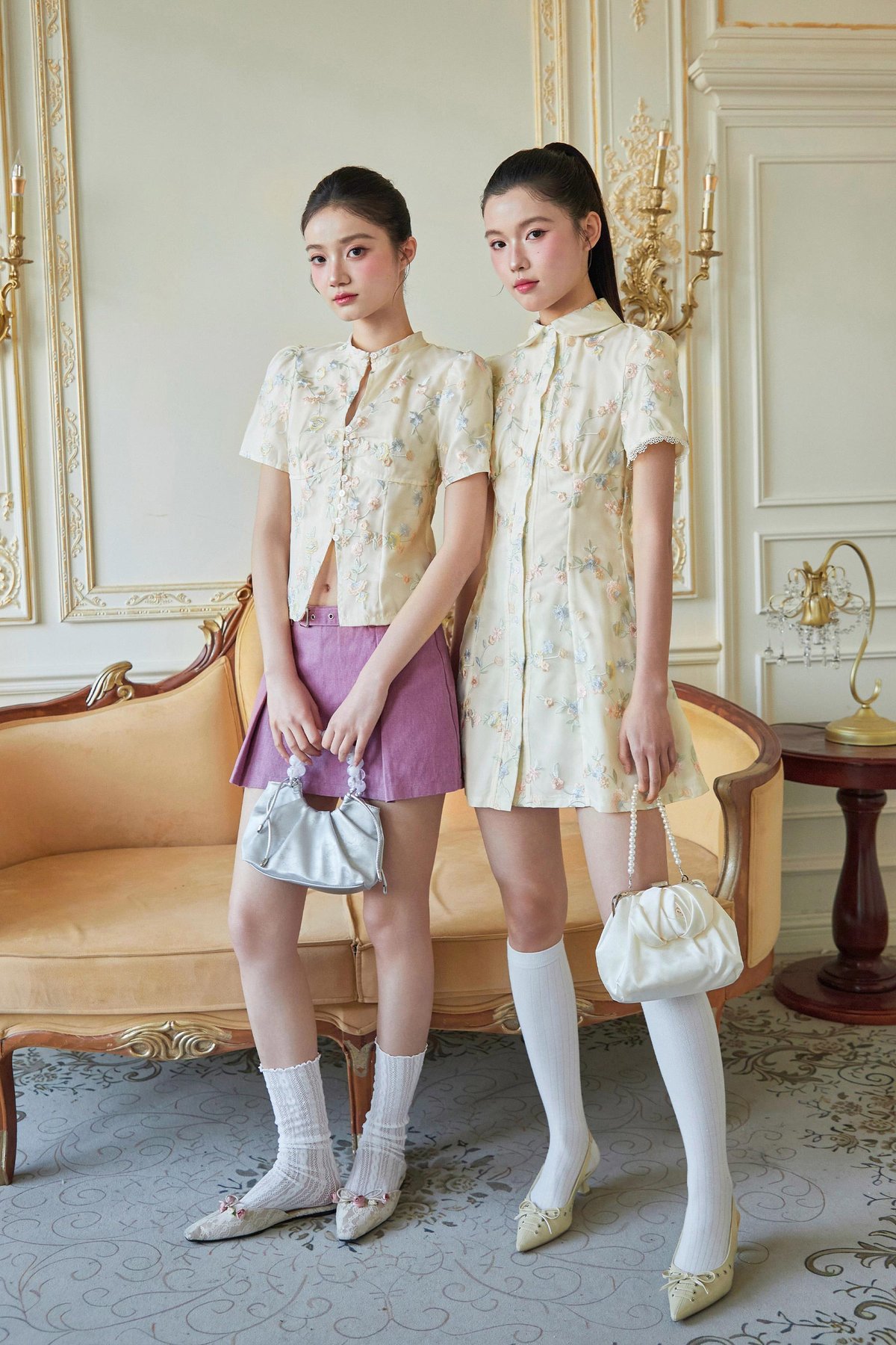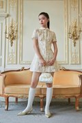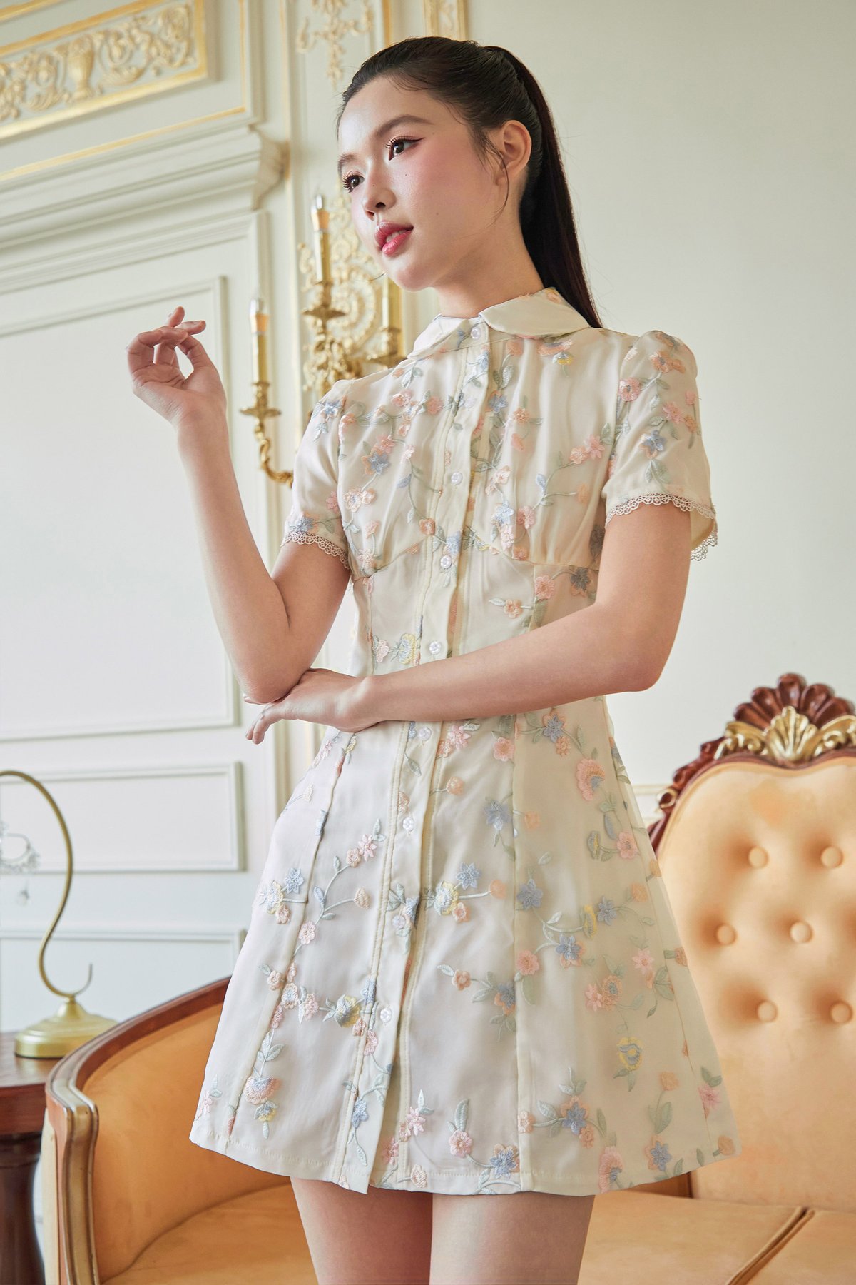 A dress featuring a Peter Pan collar, functional front buttons, and lace trim at the sleeve hems.