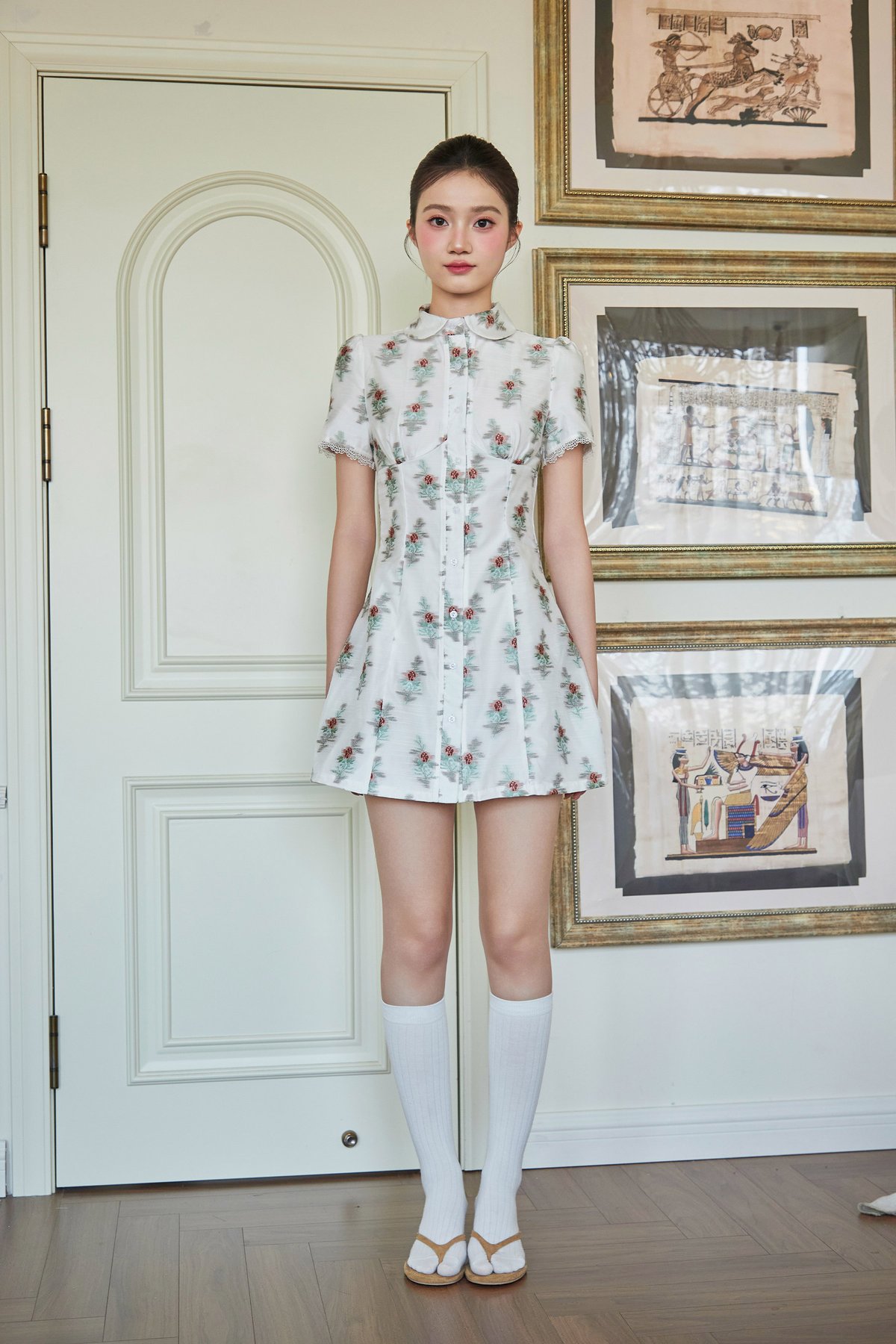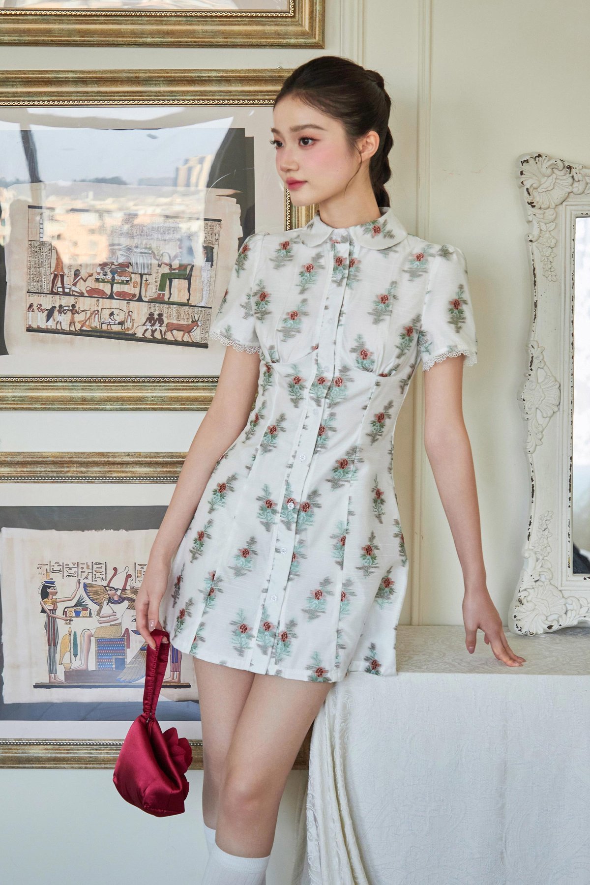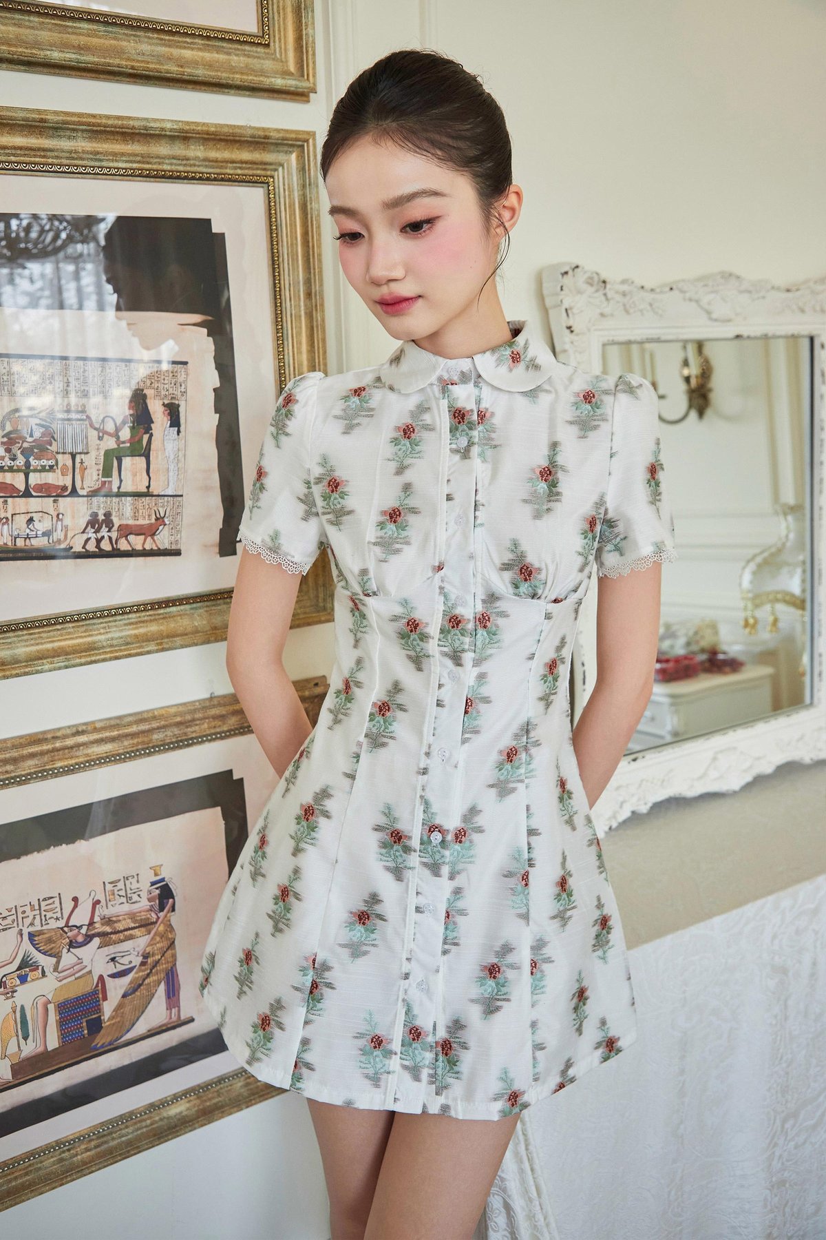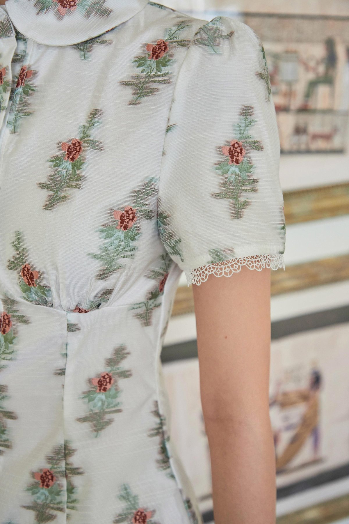 A dress featuring a Peter Pan collar, functional front buttons, and lace trim at the sleeve hems.