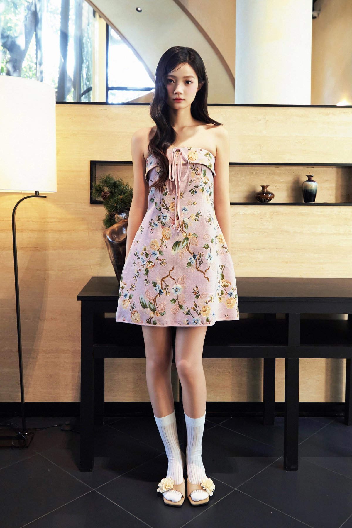 A tube dress with an anti-slip band, faux front ribbon, side pockets, smocked back, and a back concealed zipper.