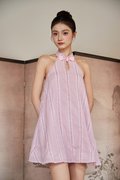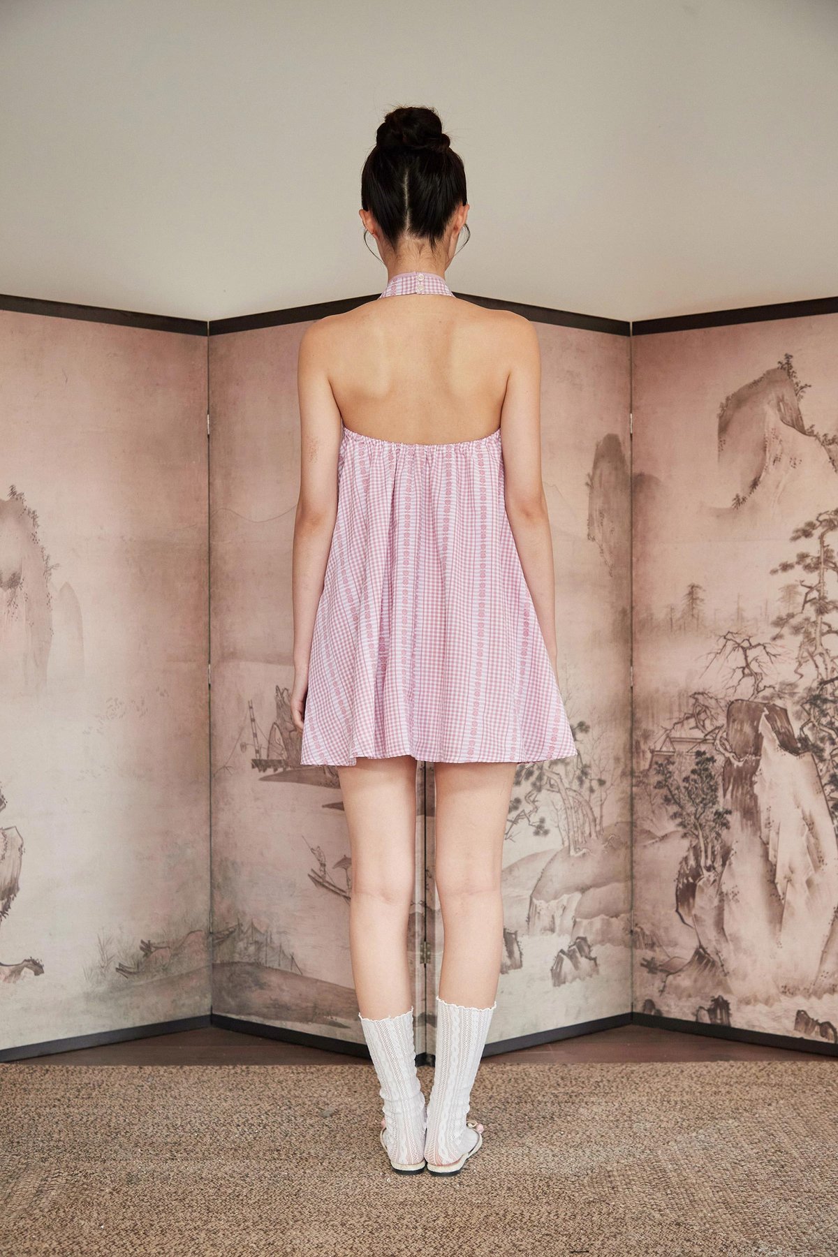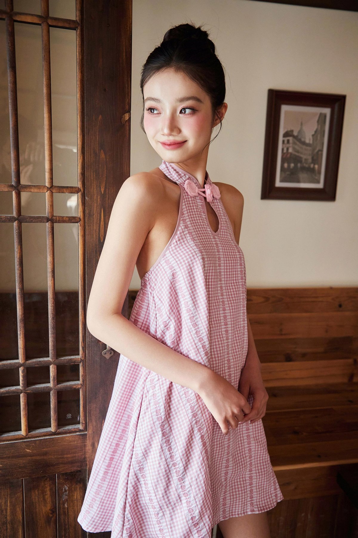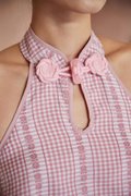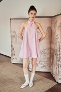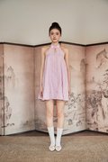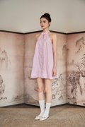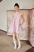 A modern cheongsam-inspired dress with a halter neckline, frog-button accents and a flattering flare silhouette. Designed with an open back, elastic band at the back and functional buttons at the back of the neck. Comes with side pockets and is fully lined for comfort.
