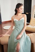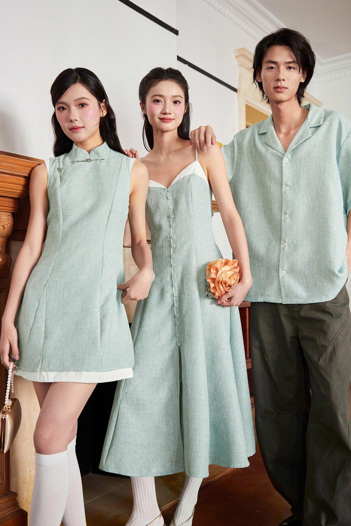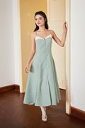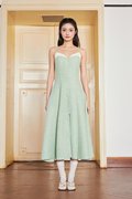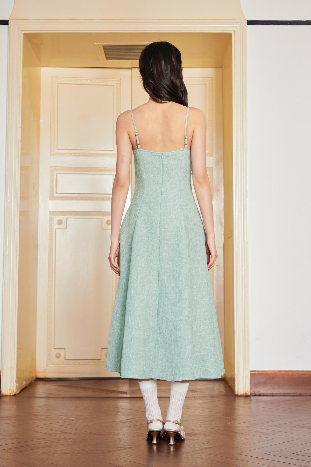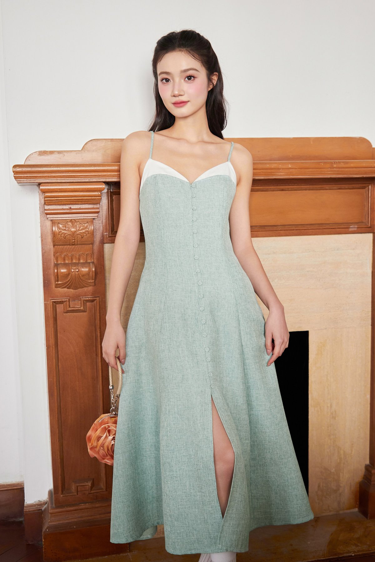 A dress designed in a midi-maxi length with adjustable straps and contrast fabric detailing. Finished with functional front buttons, practical side pockets, and a back concealed zipper for a seamless fit.