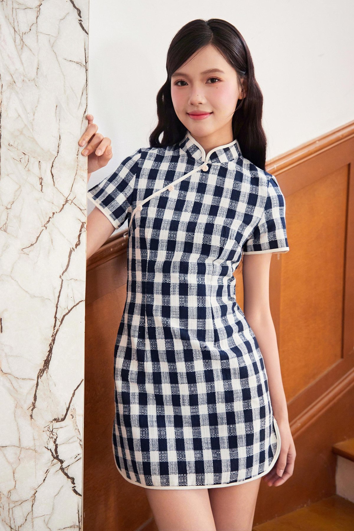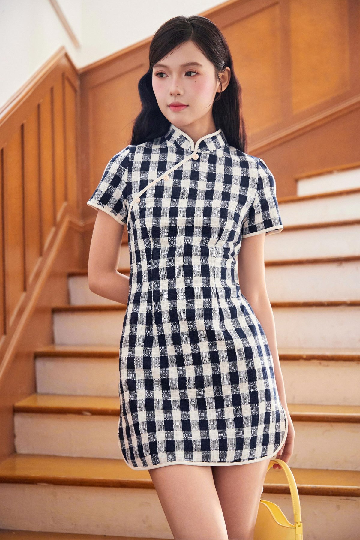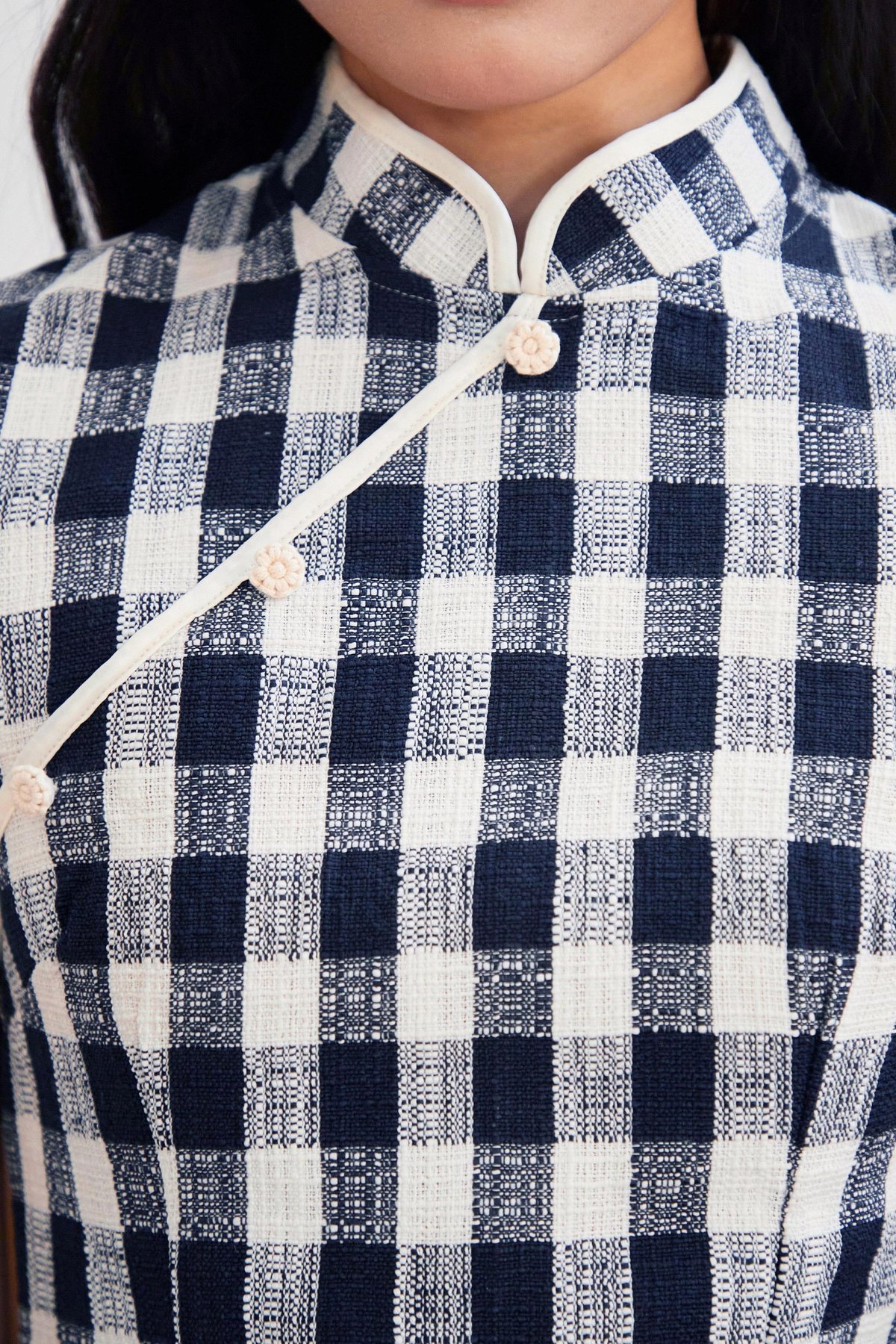 A cheongsam designed with contrast piping details and faux asymmetrical button accents. Finished with a curved hem and a back concealed zipper for a clean, streamlined fit.