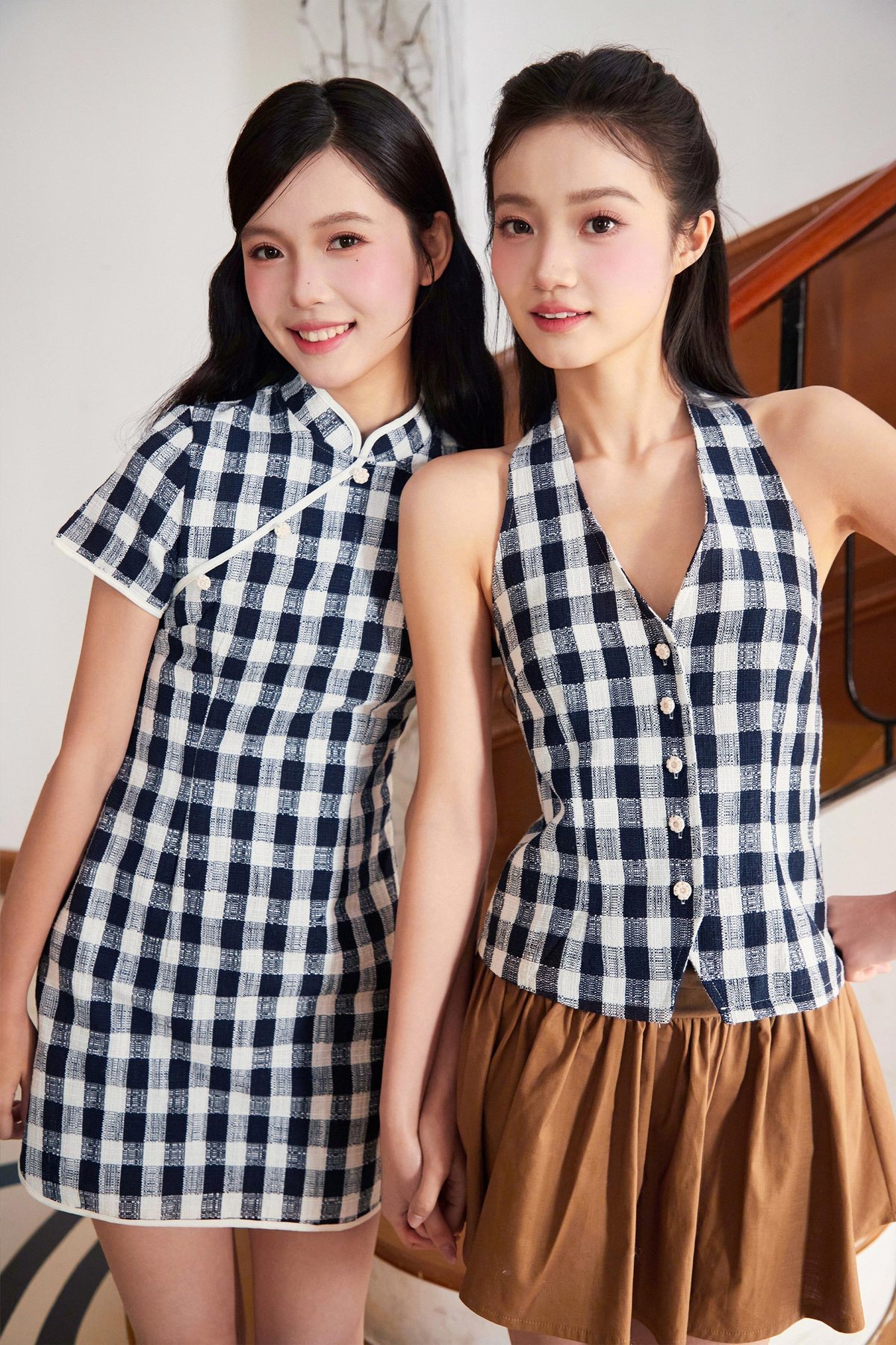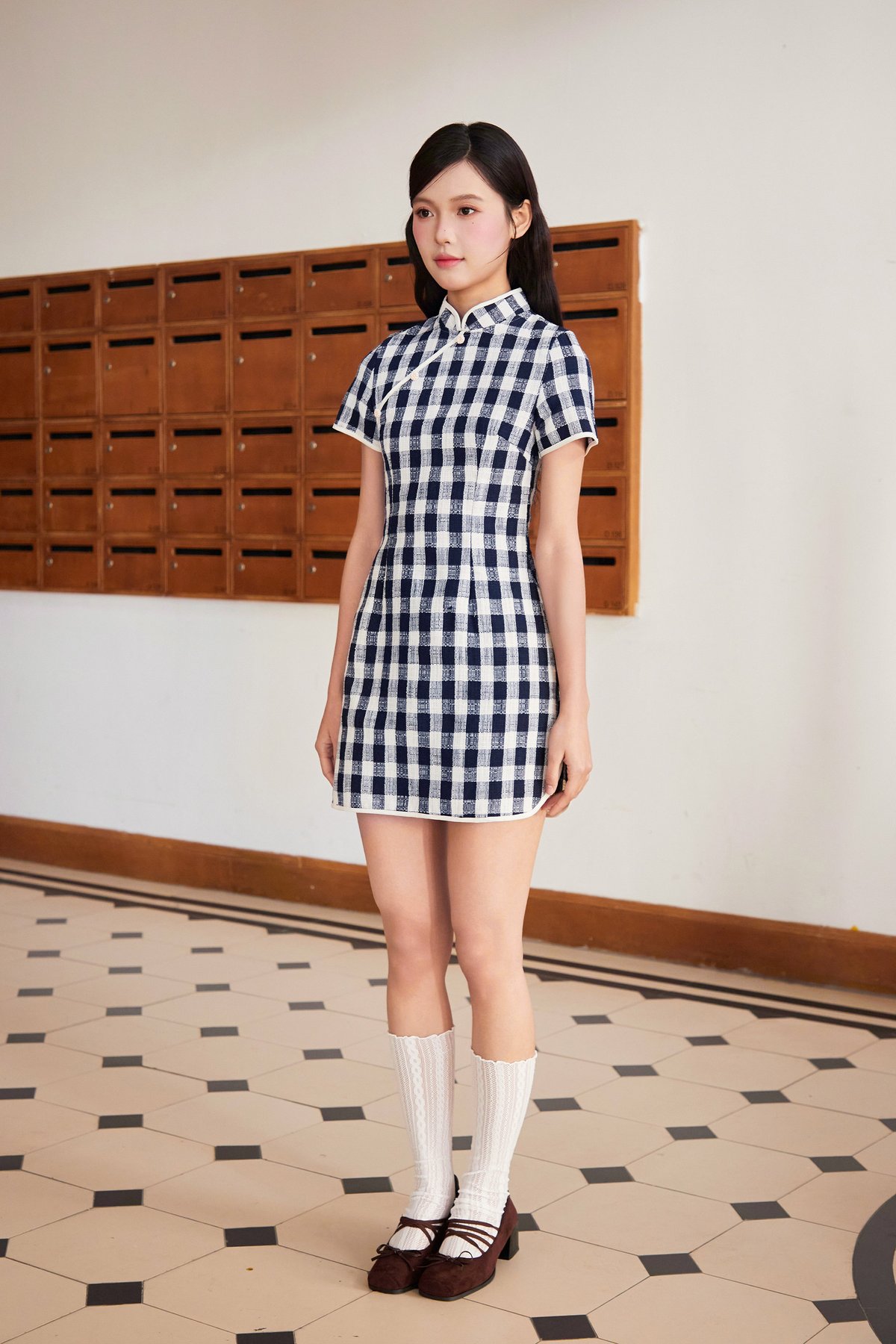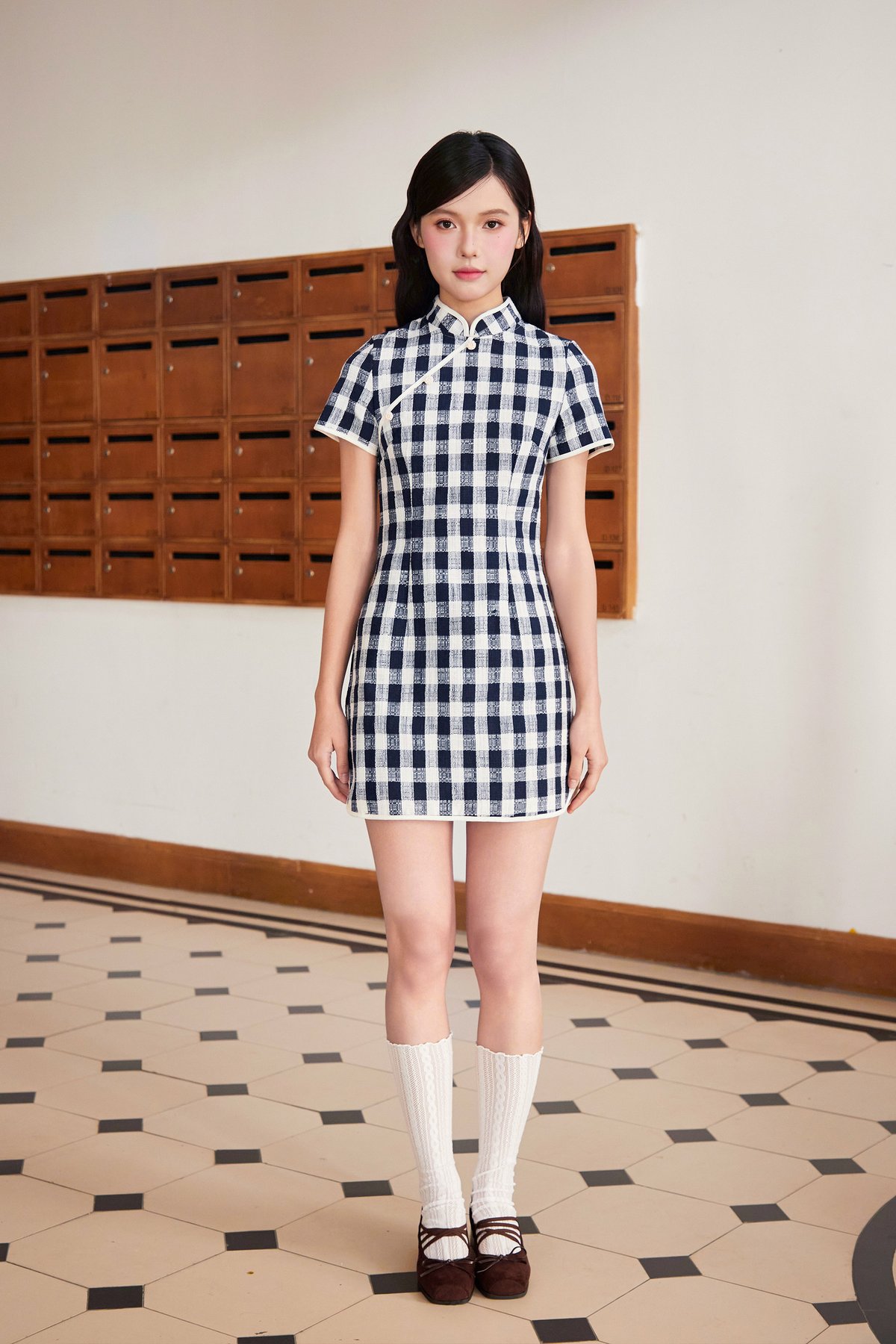 A cheongsam designed with contrast piping details and faux asymmetrical button accents. Finished with a curved hem and a back concealed zipper for a clean, streamlined fit.