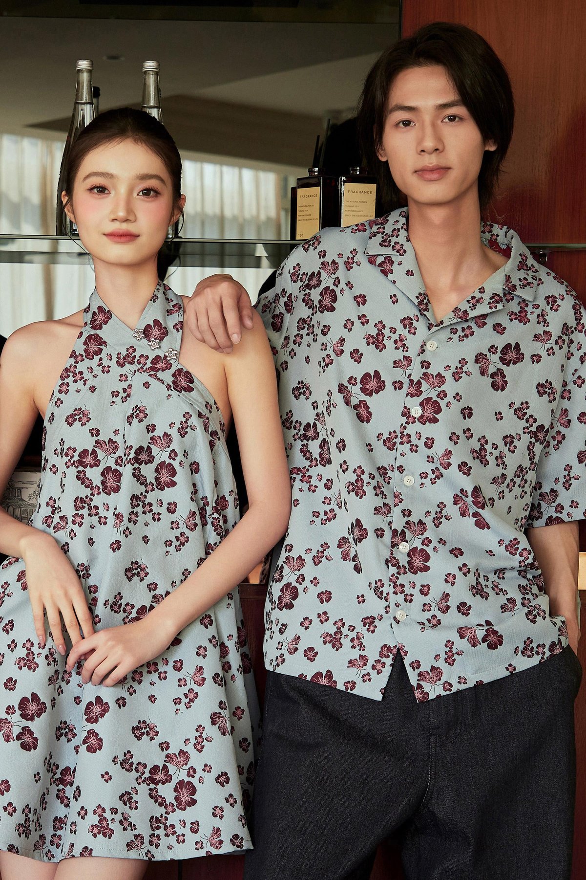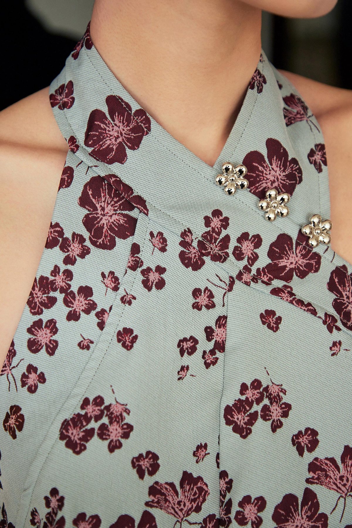 A modern Chinese-style dress featuring faux front buttons, a halter neckline and a flattering flare silhouette. Finished with a concealed back zip and functional side pockets. Unlined for light, comfortable wear.