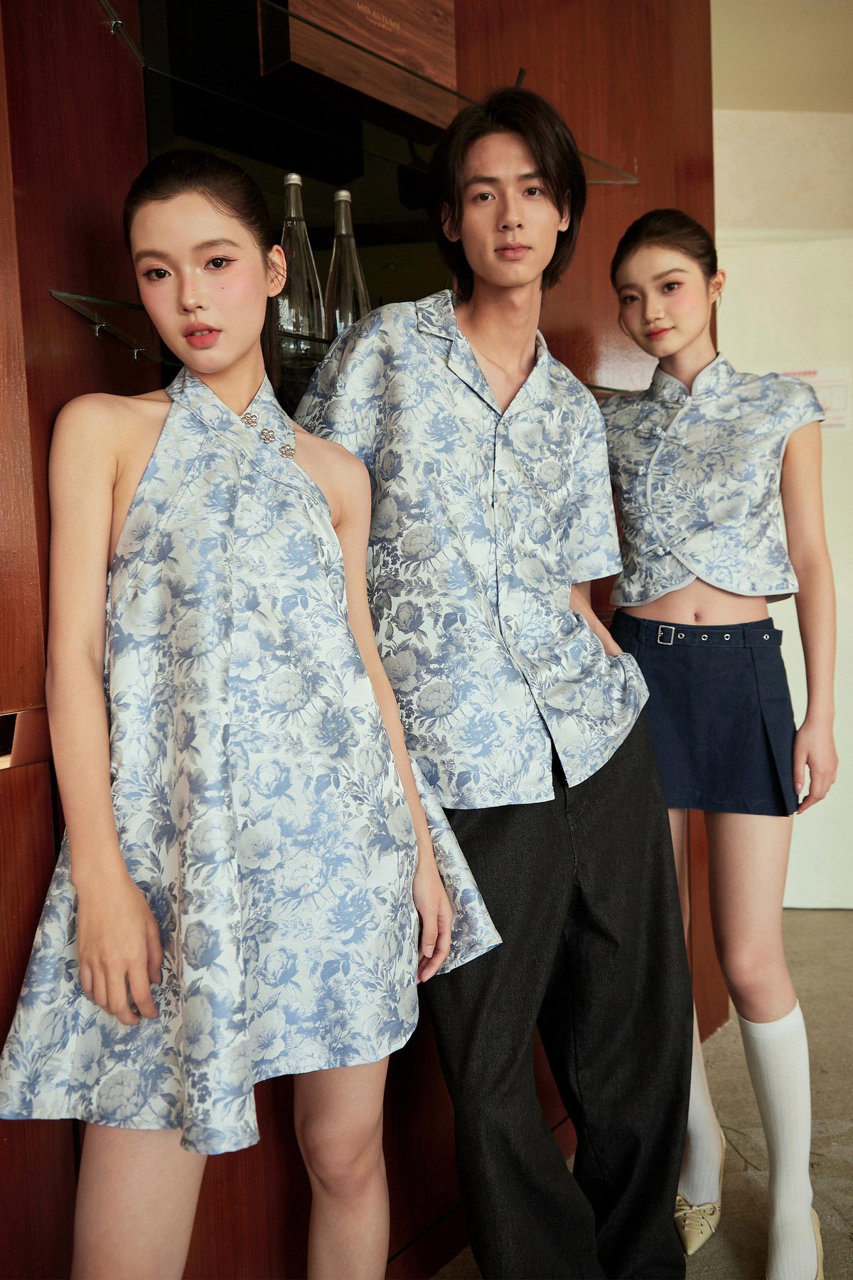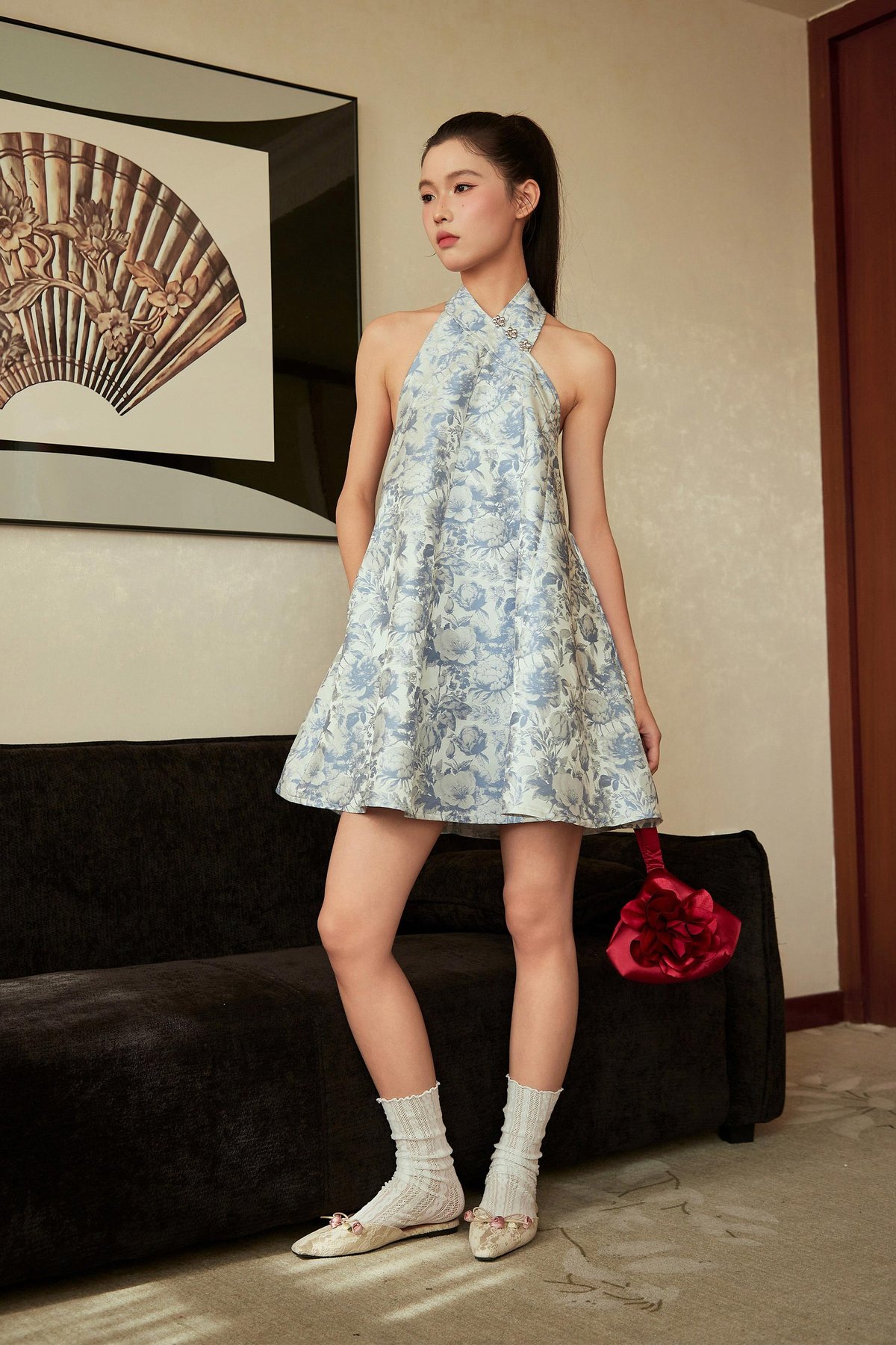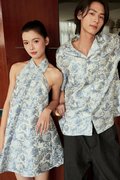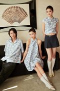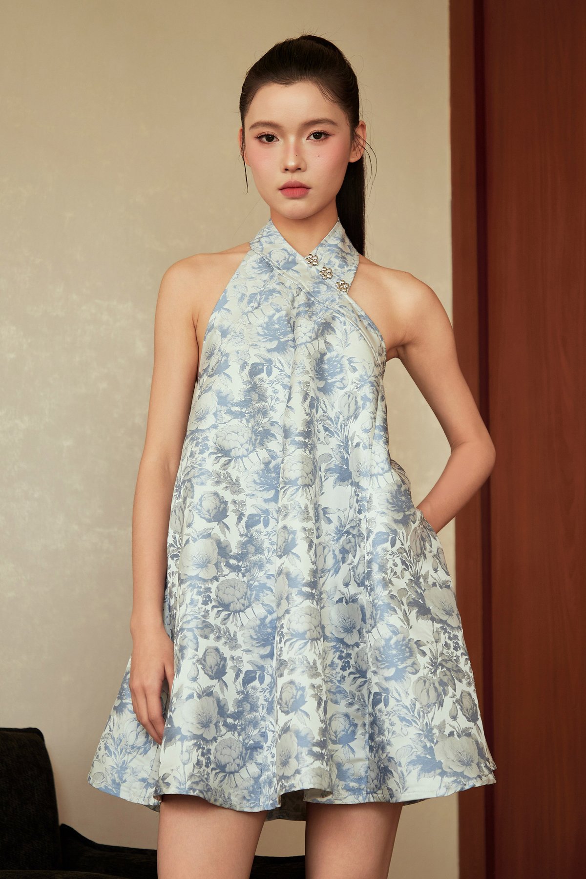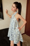 A modern Chinese-style dress featuring faux front buttons, a halter neckline and a flattering flare silhouette. Finished with a concealed back zip and functional side pockets. Unlined for light, comfortable wear.