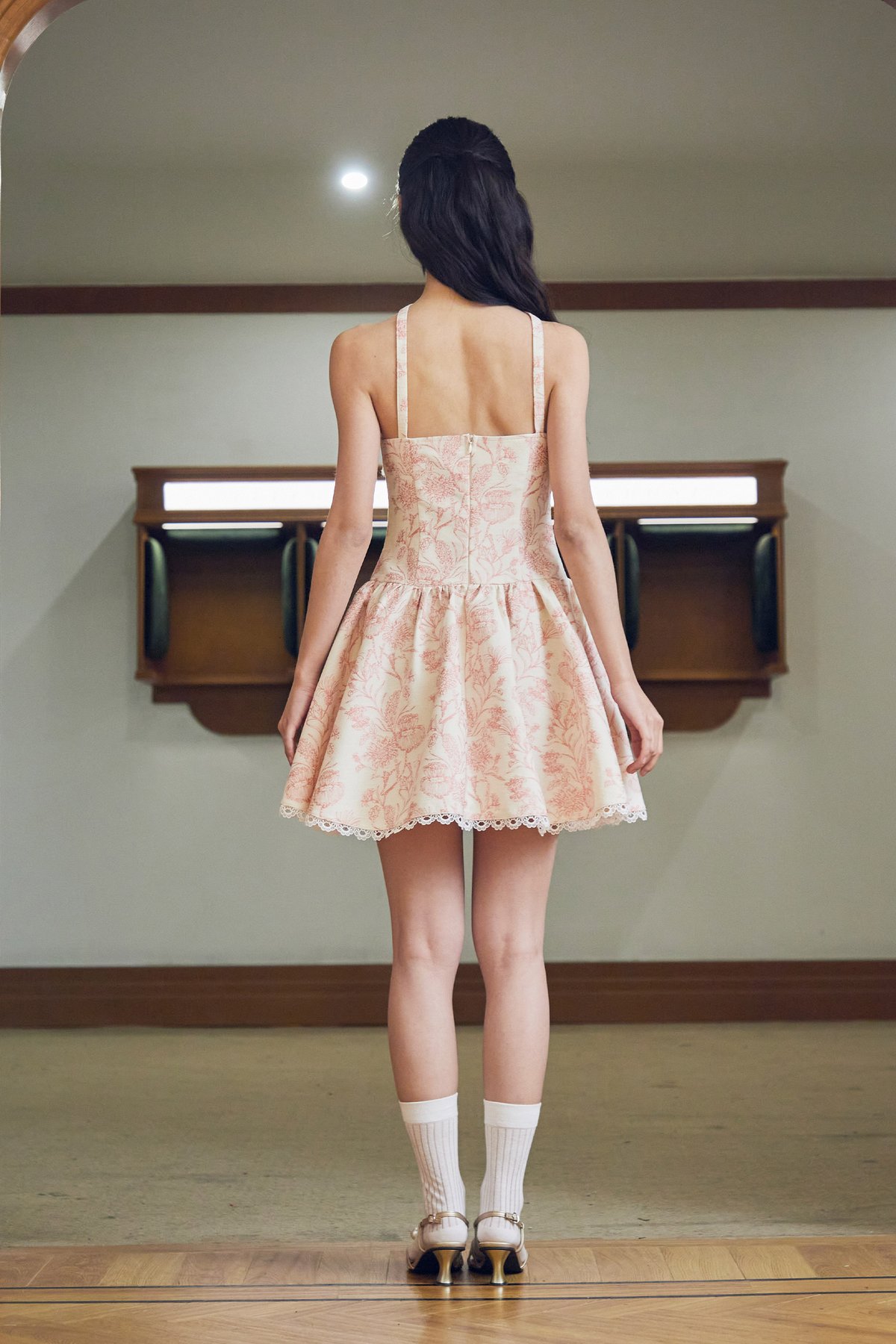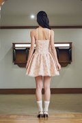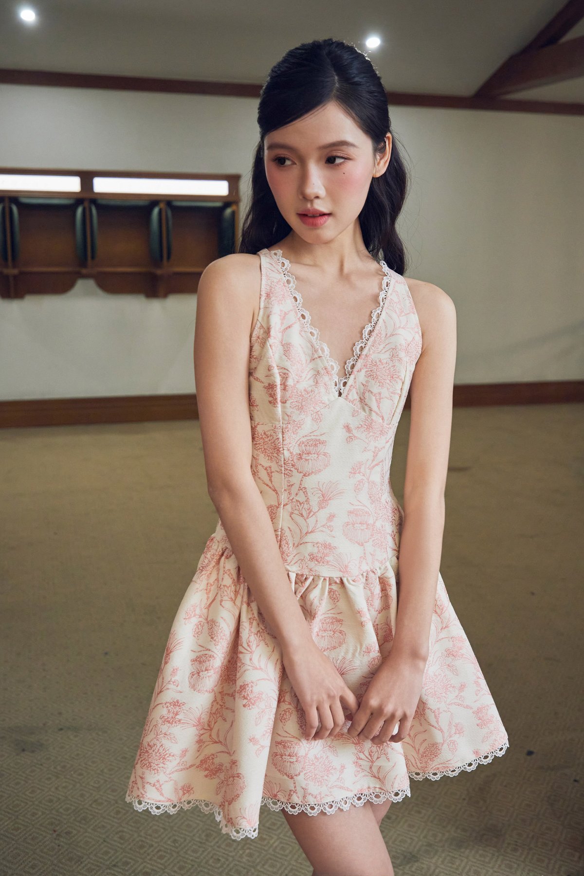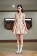 This dress features delicate trimming details along the neckline, adjustable straps for a custom fit, and a flattering drop-waist silhouette. It is finished with a concealed zipper at the back for a seamless look.