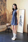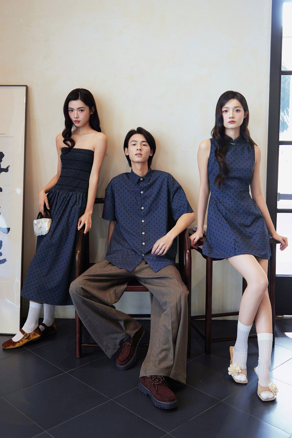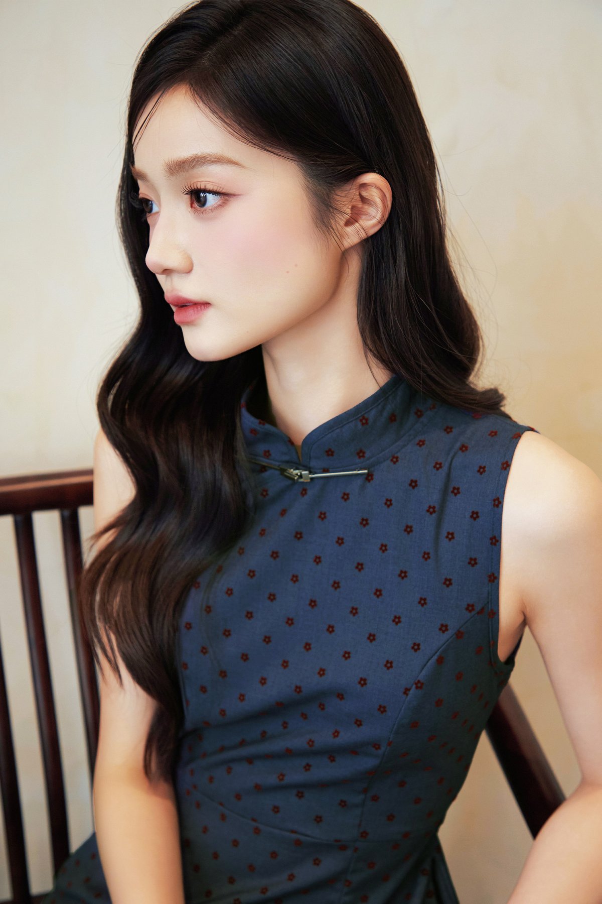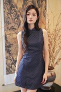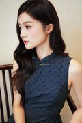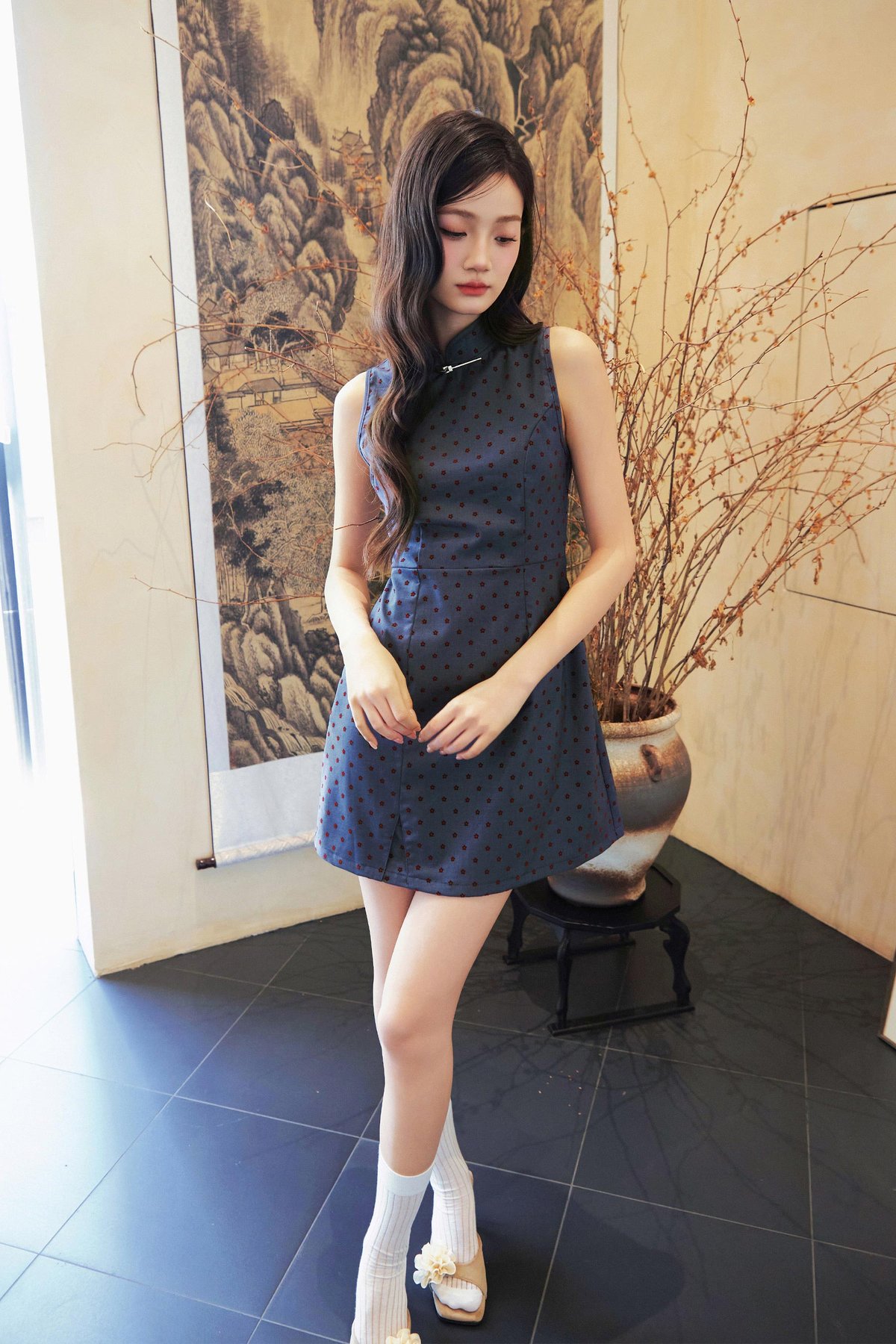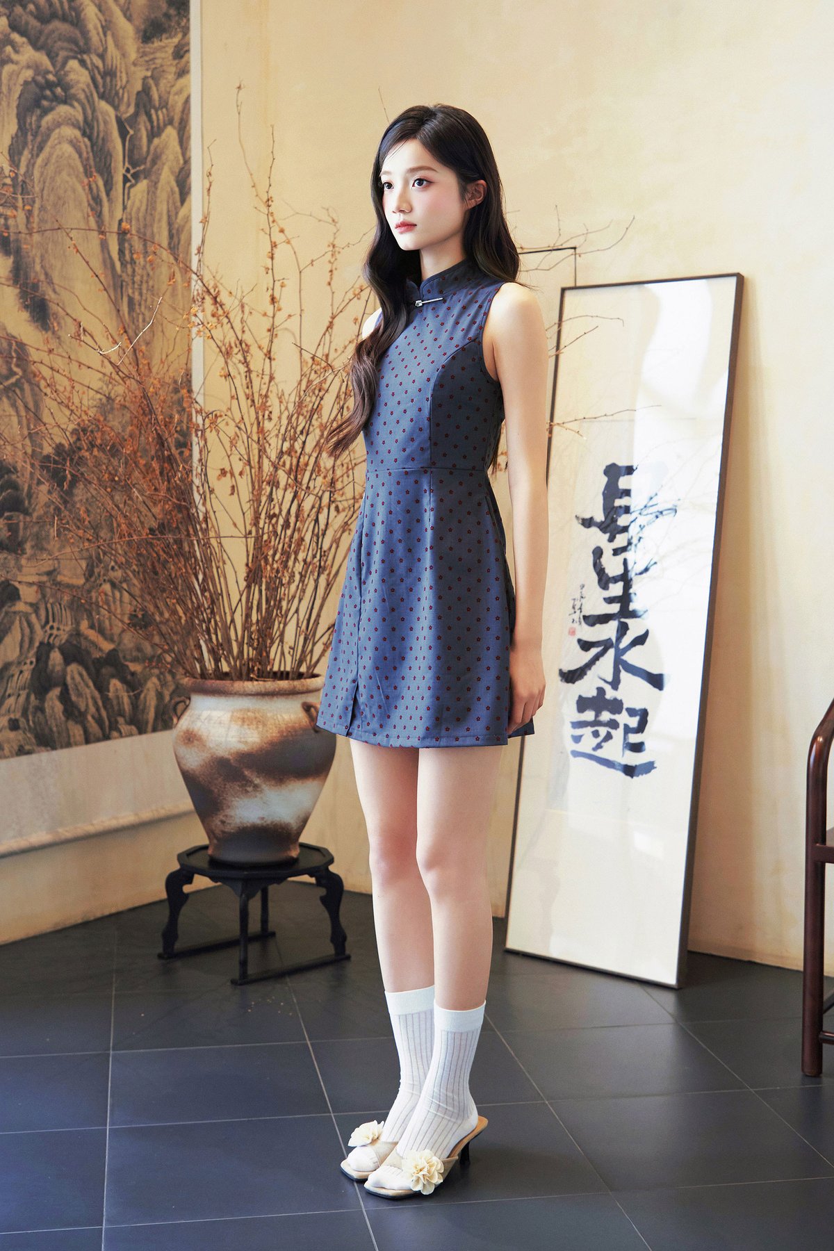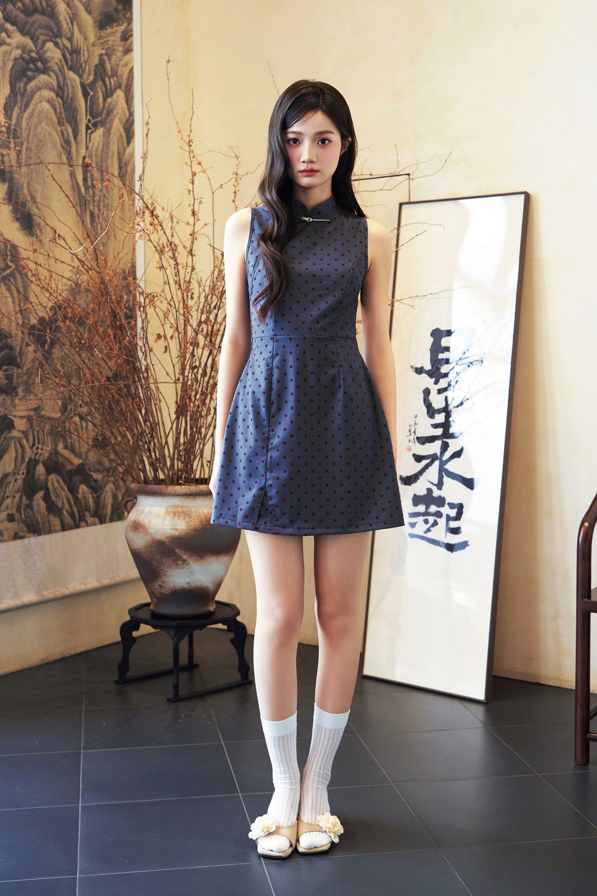 A timeless cheongsam dress with a Chinese stand collar, back concealed zipper, decorative metal bar button, and practical side pockets.