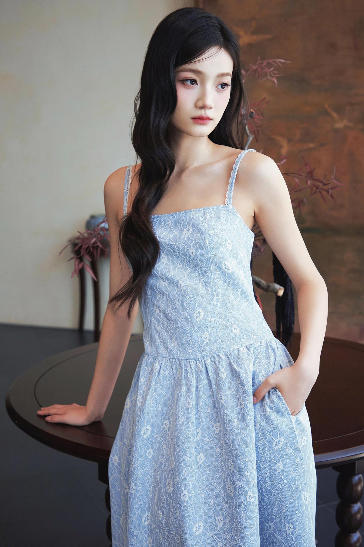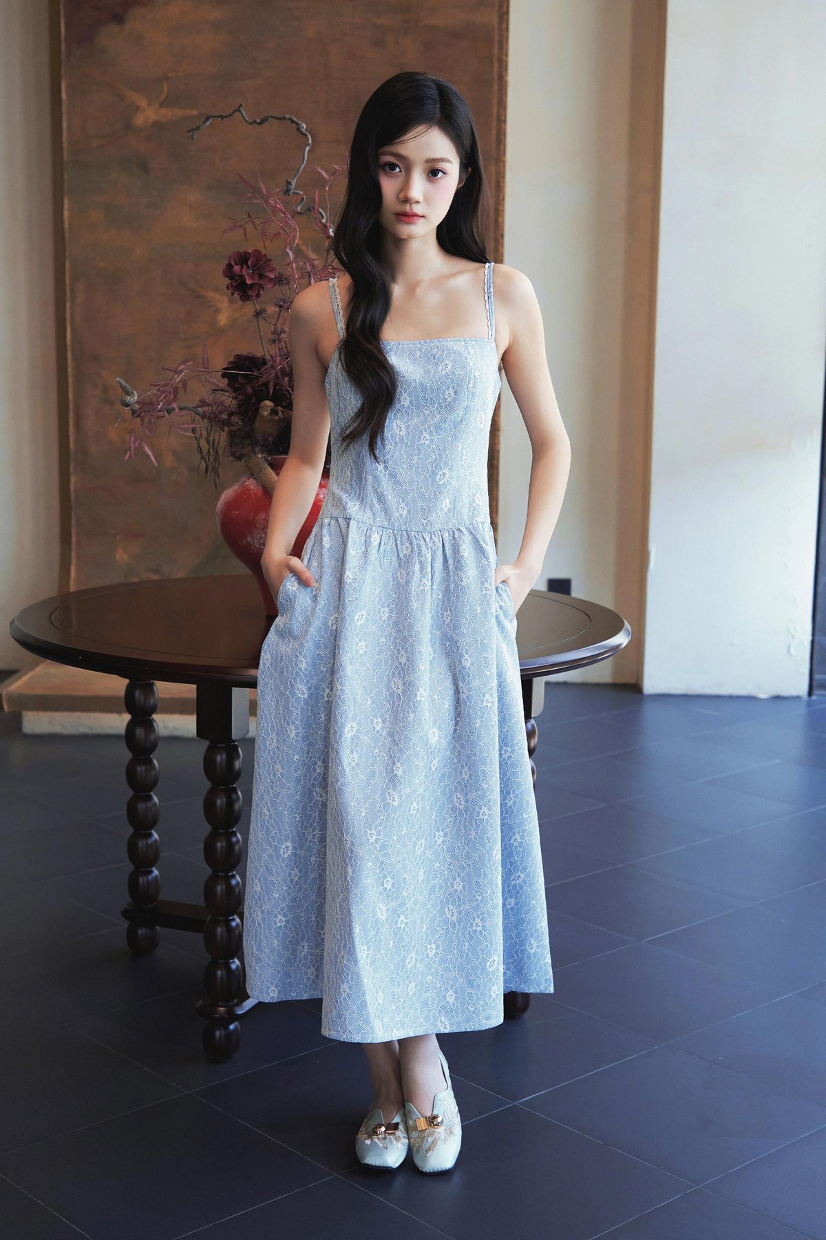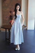 A dress with non-adjustable straps, trimmed strap details, side pockets, and a back concealed zipper.
