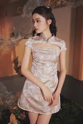 A dress featuring a Chinese stand collar with a hidden hook and bar closure, finished with a back concealed zipper for a clean fit. Designed with cap sleeves, a front cutout detail, and functional side pockets for everyday ease.