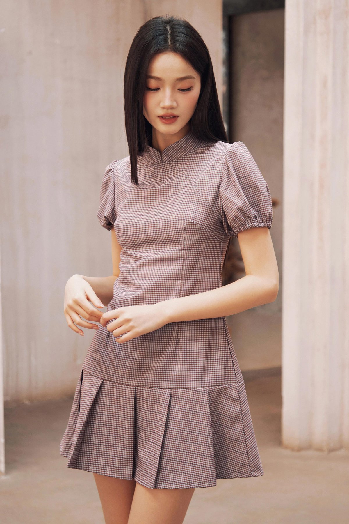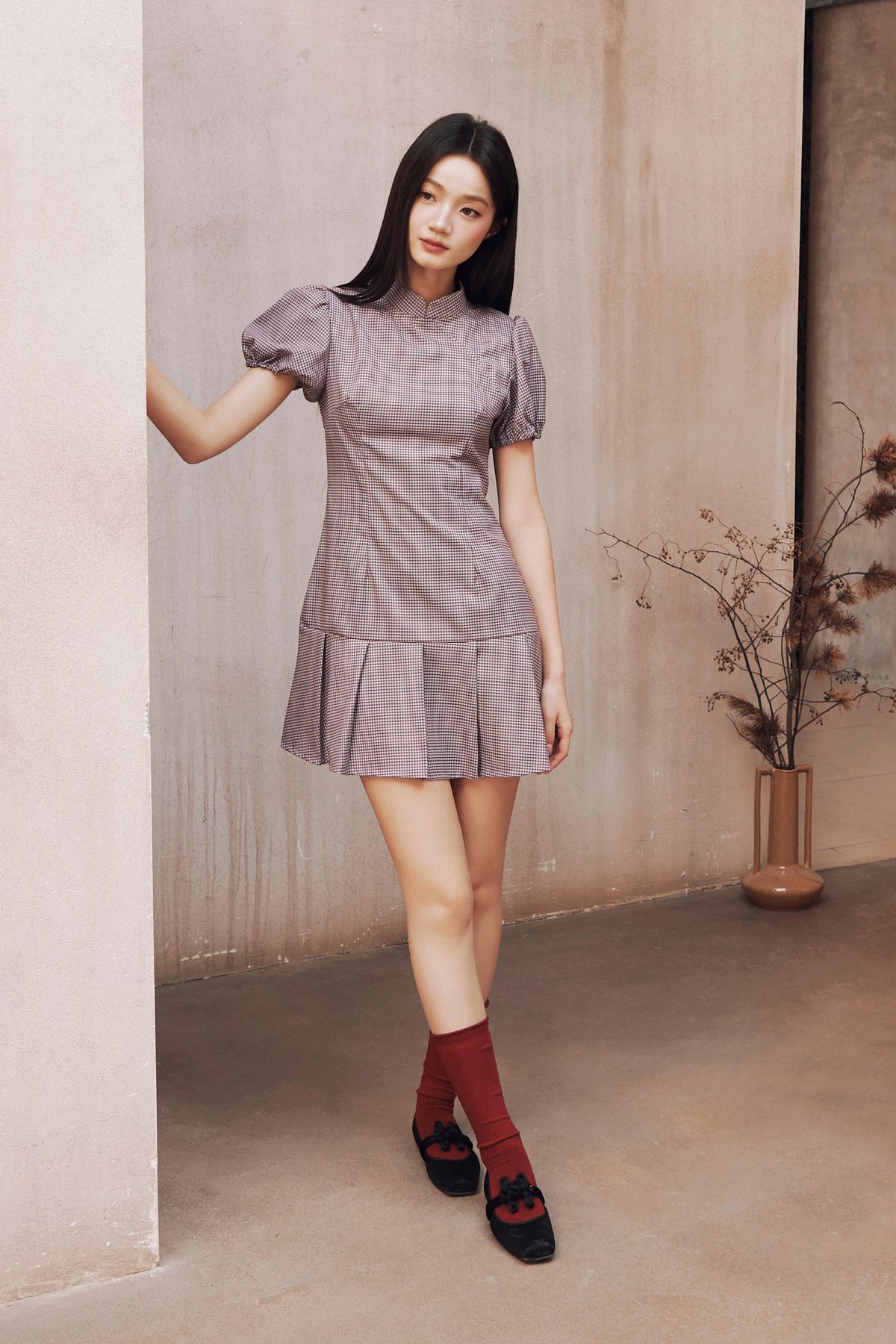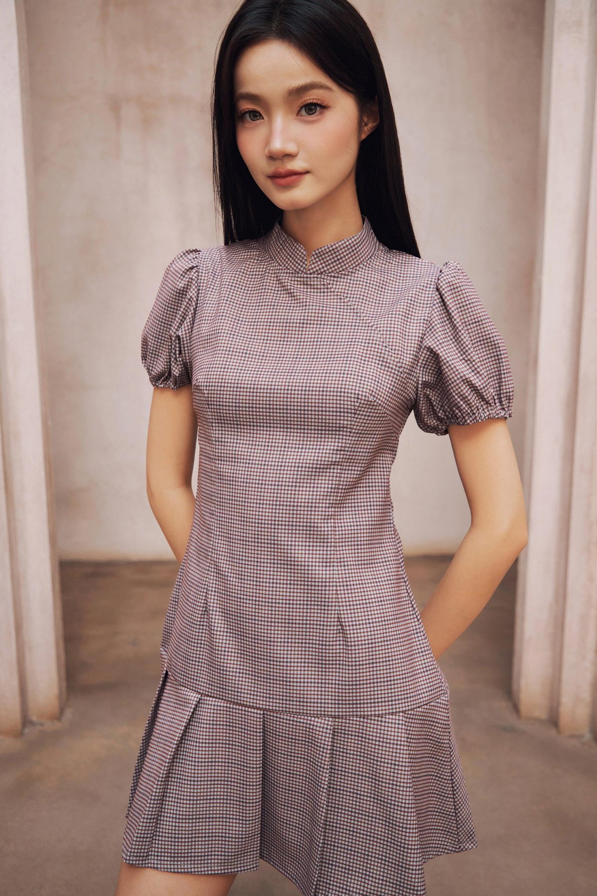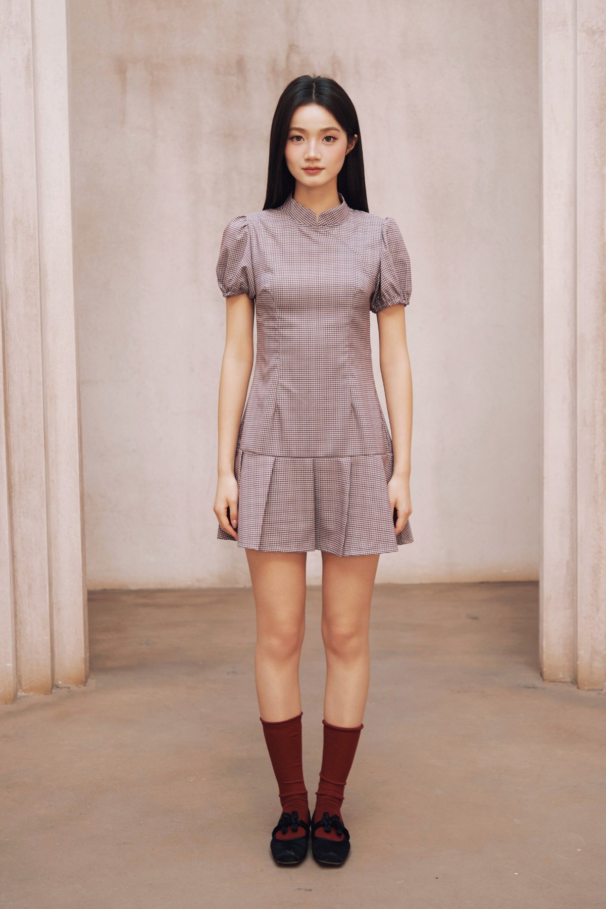 A modern cheongsam dress with a chinese stand collar, puff sleeves with elasticated hems, pleated hem details and a functional back concealed zipper.
