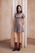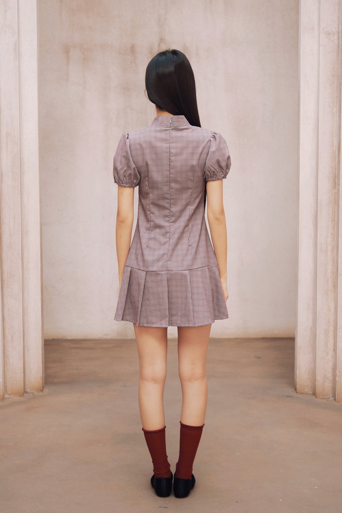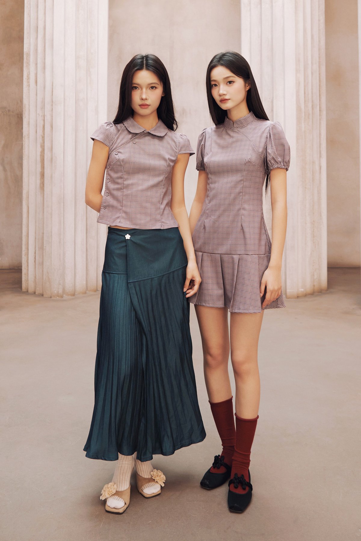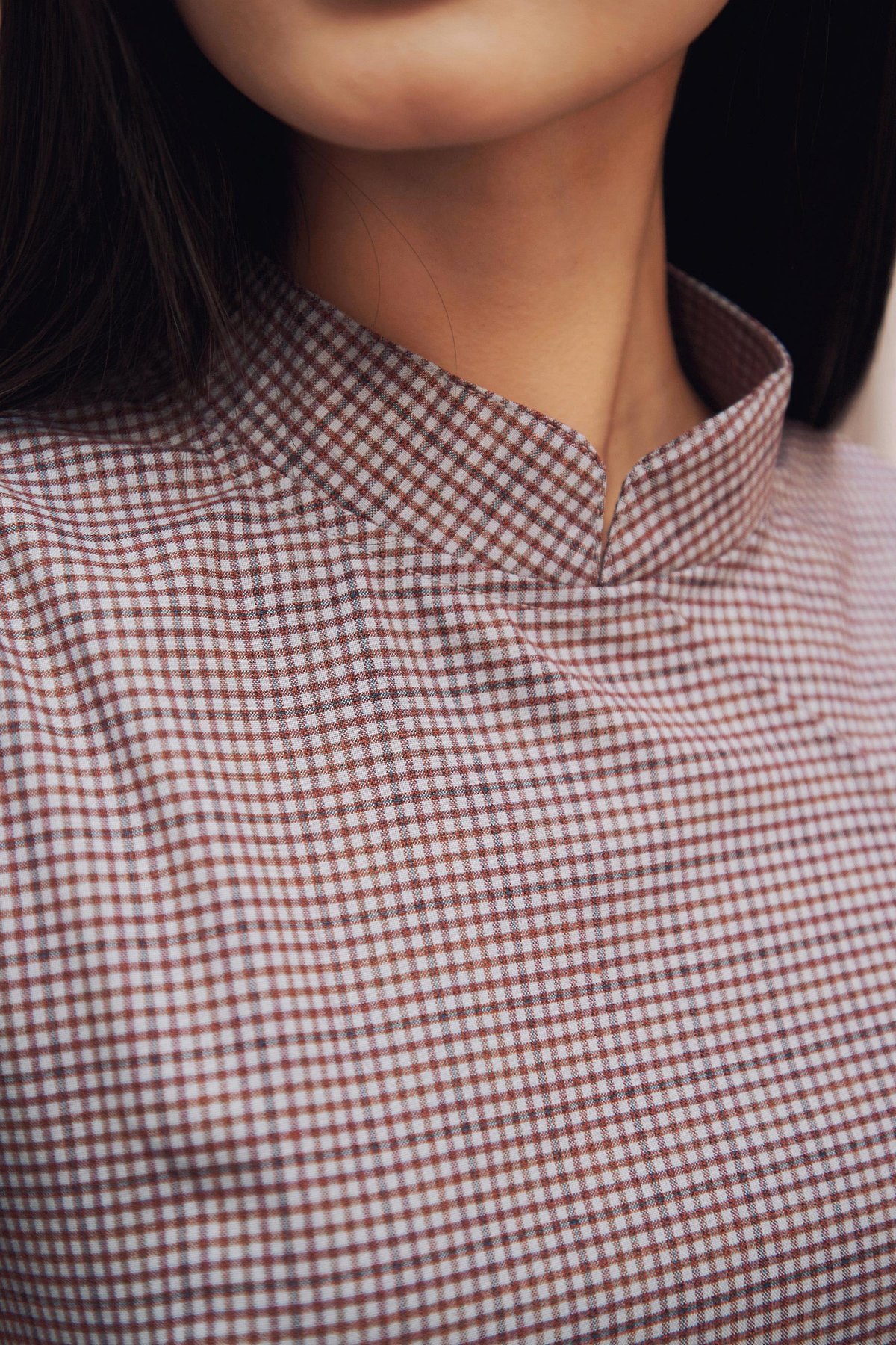 A modern cheongsam dress with a chinese stand collar, puff sleeves with elasticated hems, pleated hem details and a functional back concealed zipper.