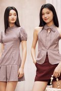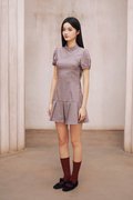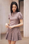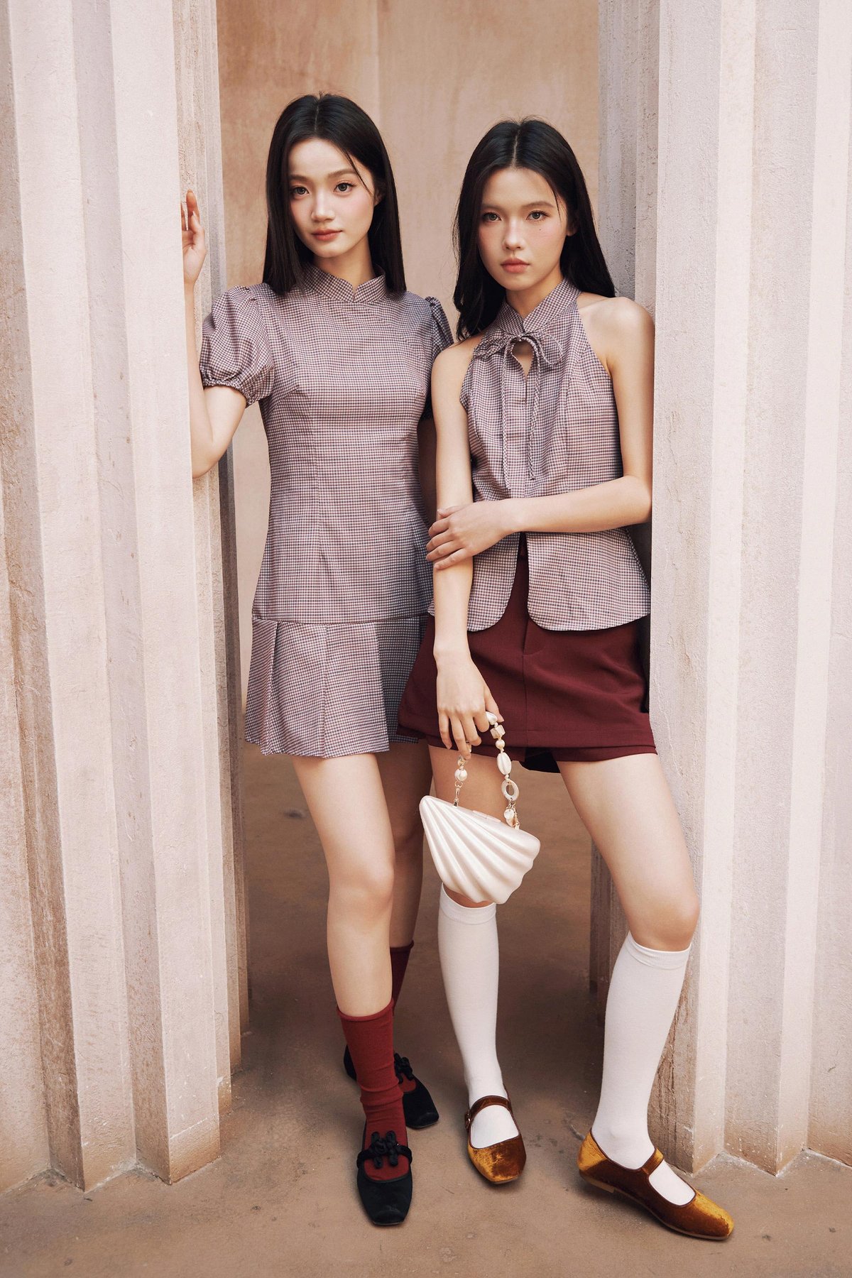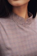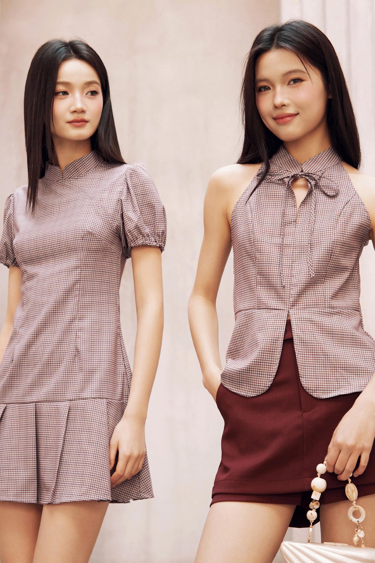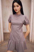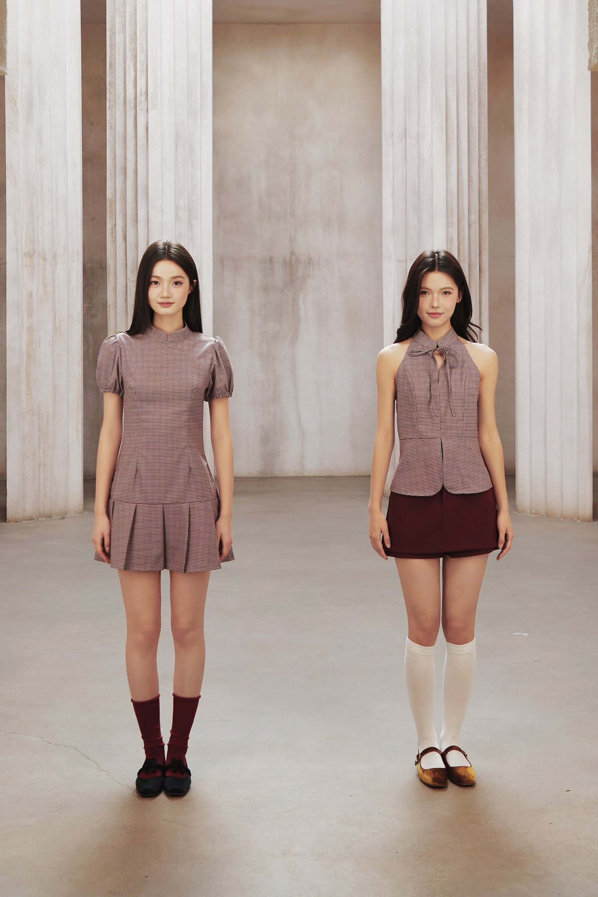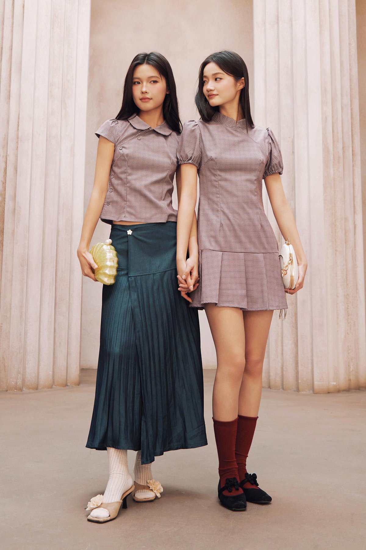 A modern cheongsam dress with a chinese stand collar, puff sleeves with elasticated hems, pleated hem details and a functional back concealed zipper.