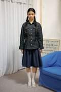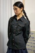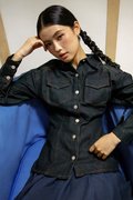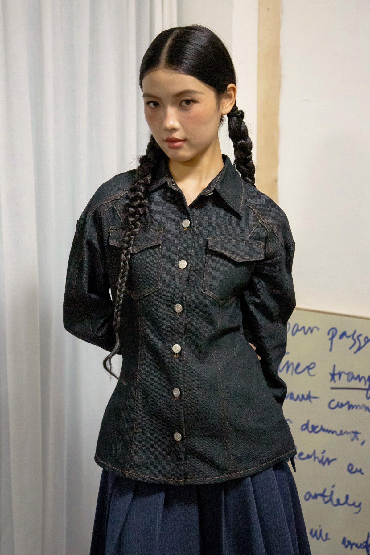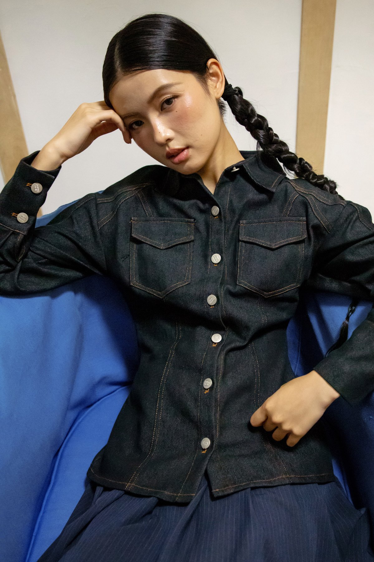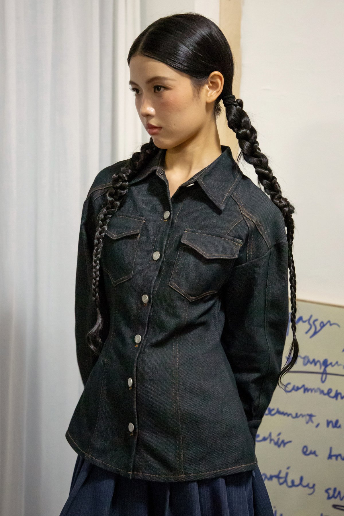 A classic fitted denim jacket featuring functional chest pockets, front rivet button closure, and double-button sleeve cuffs, accented with contrast stitching for a timeless denim look.