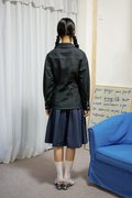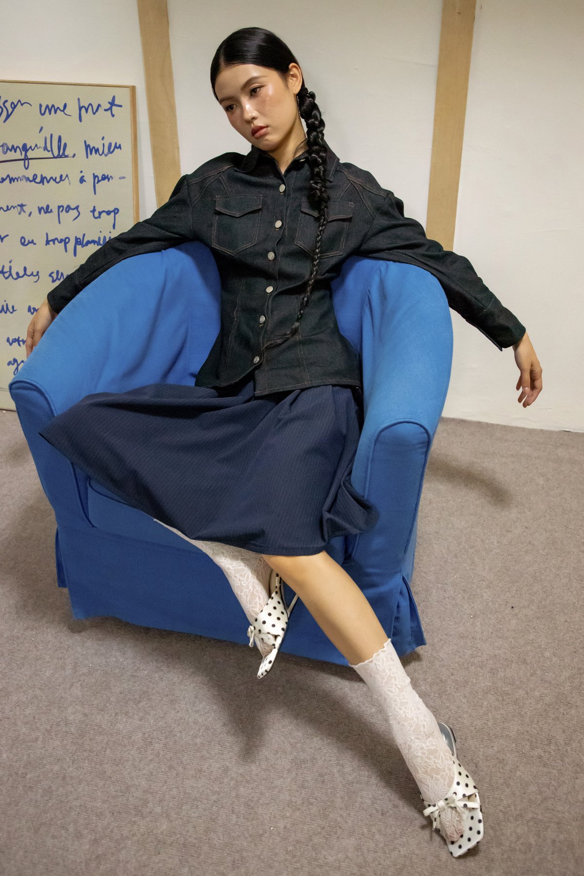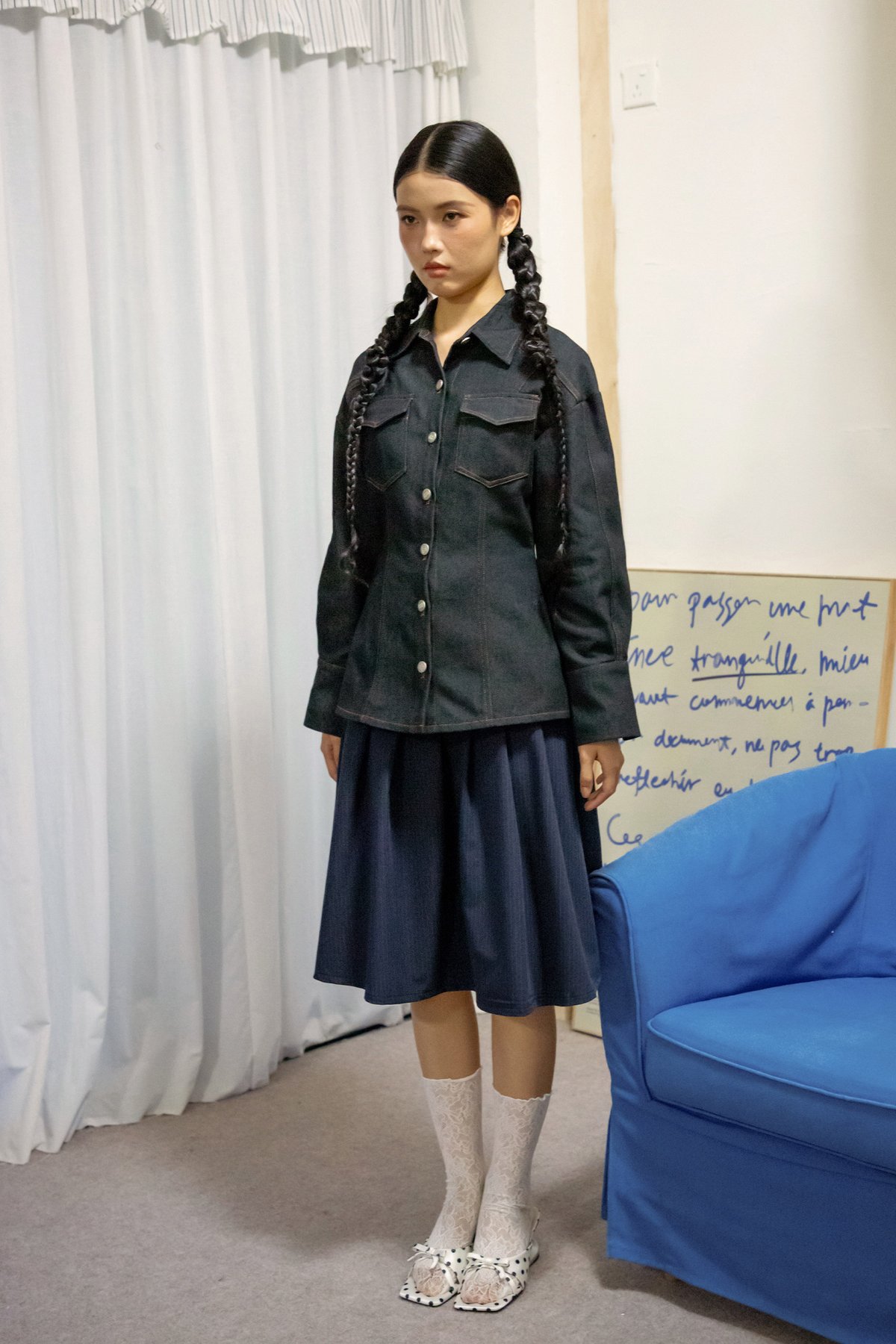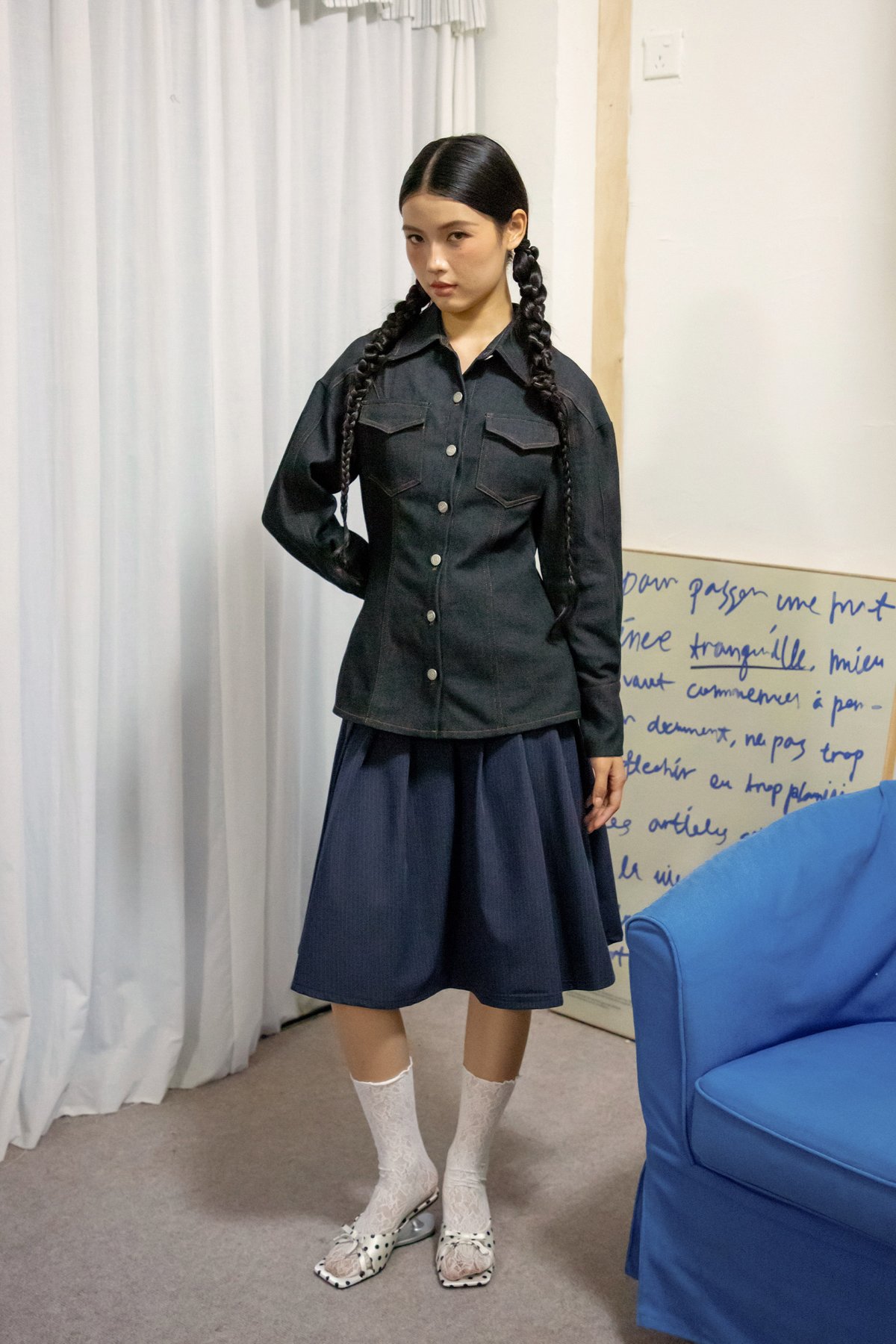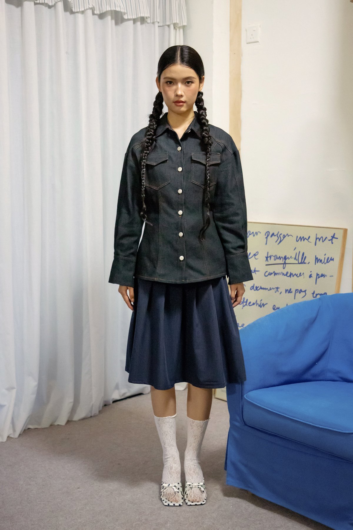 A classic fitted denim jacket featuring functional chest pockets, front rivet button closure, and double-button sleeve cuffs, accented with contrast stitching for a timeless denim look.