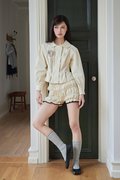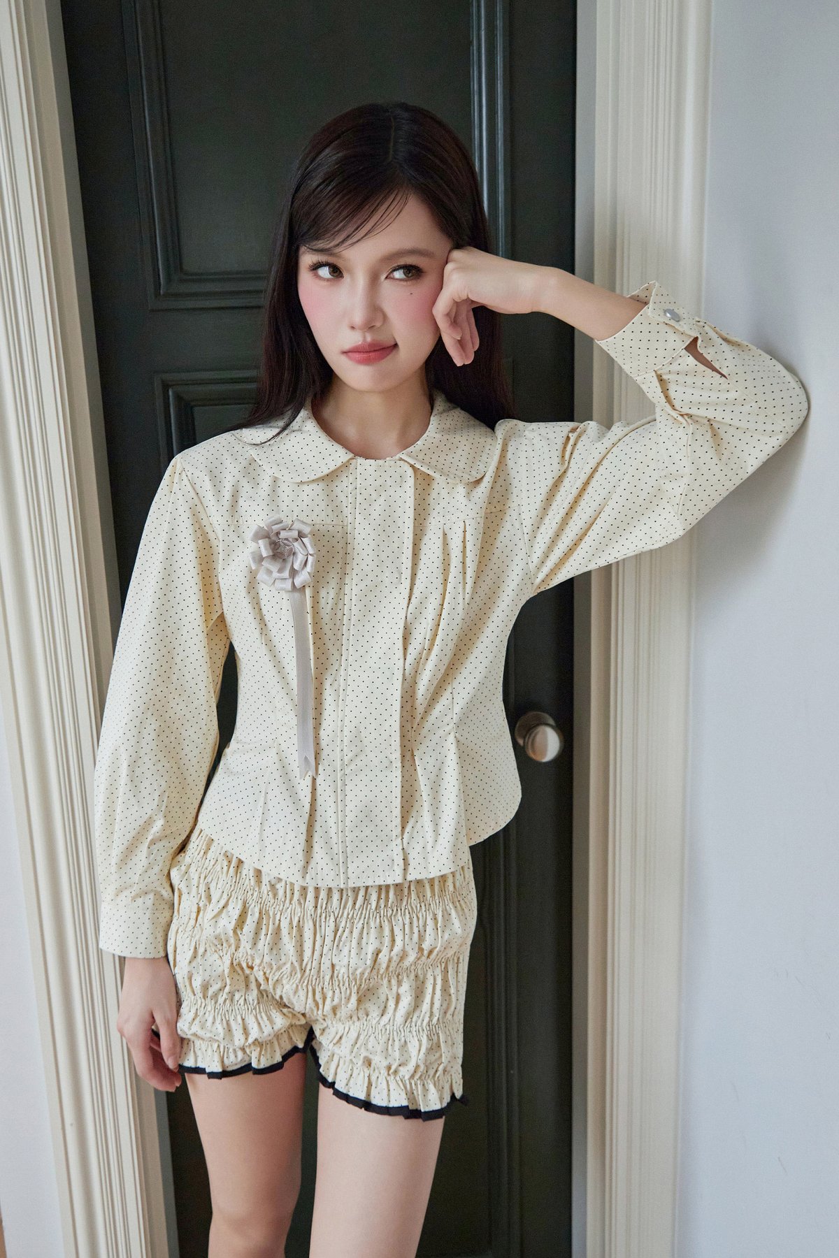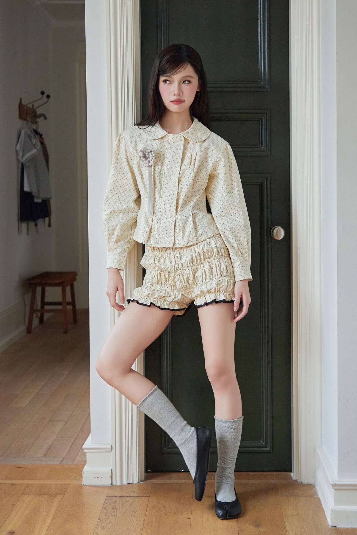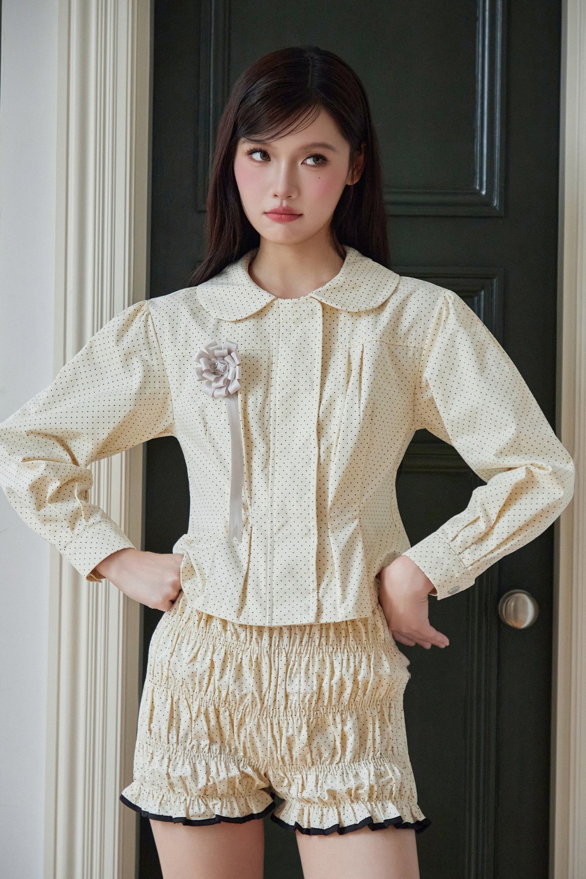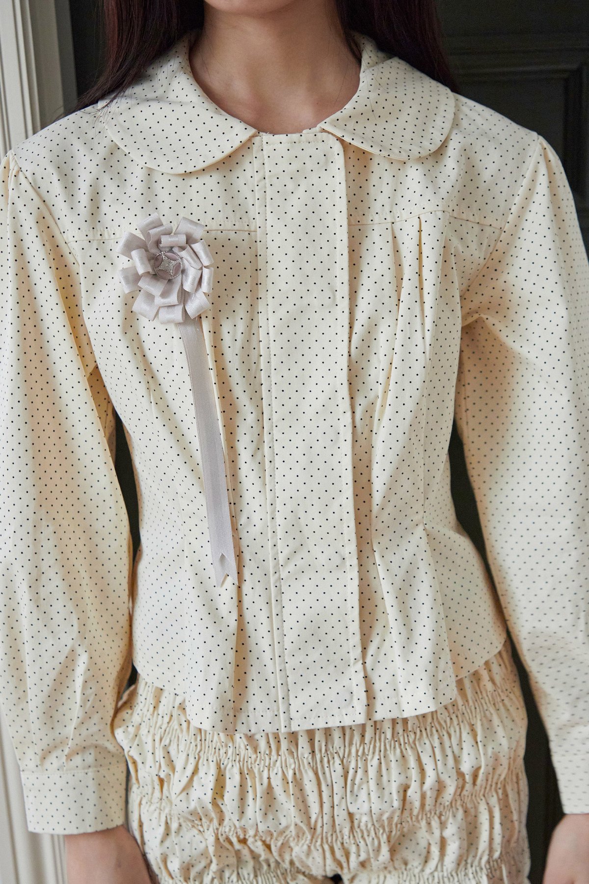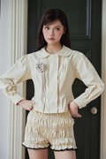 A versatile outerwear piece that doubles as a blouse, featuring a Peter Pan collar, concealed front zipper and snap button closure, delicate pleated details near the hem, and buttoned sleeve cuffs for a refined finish.