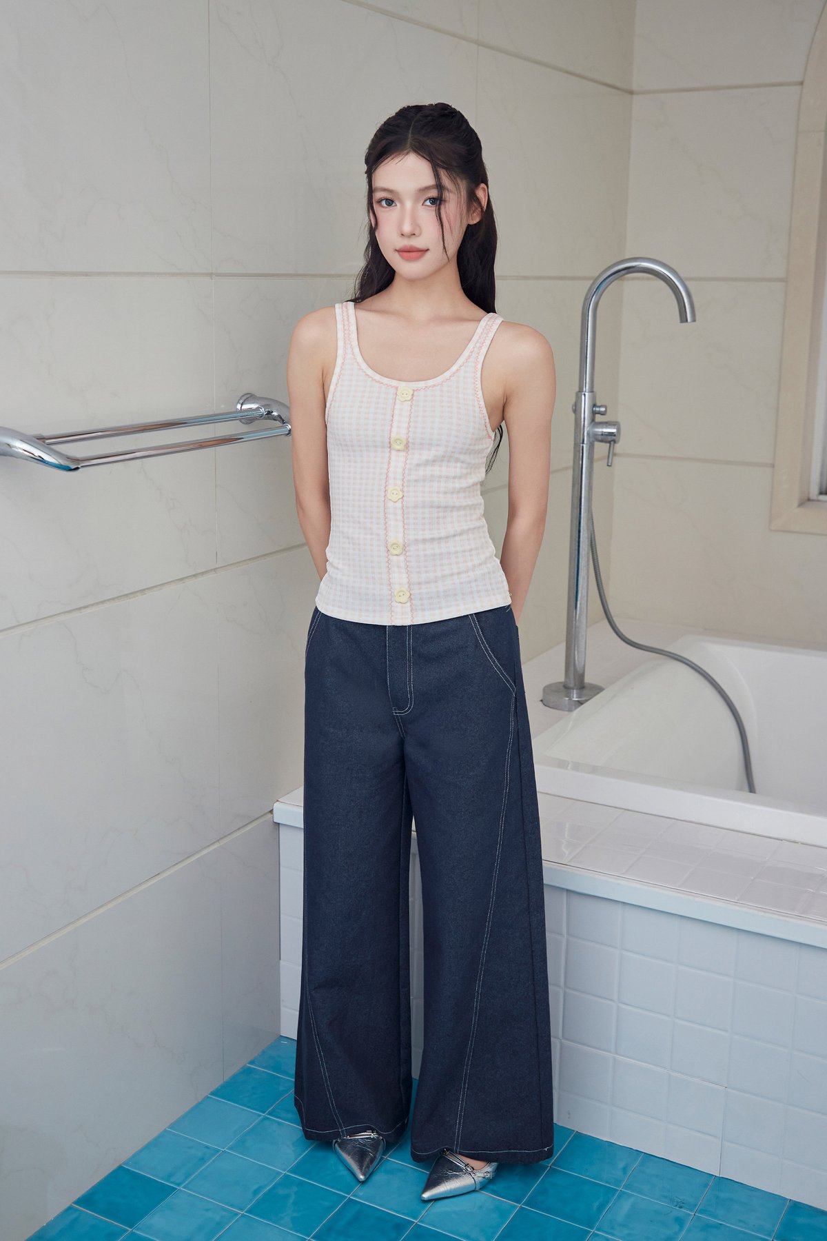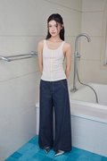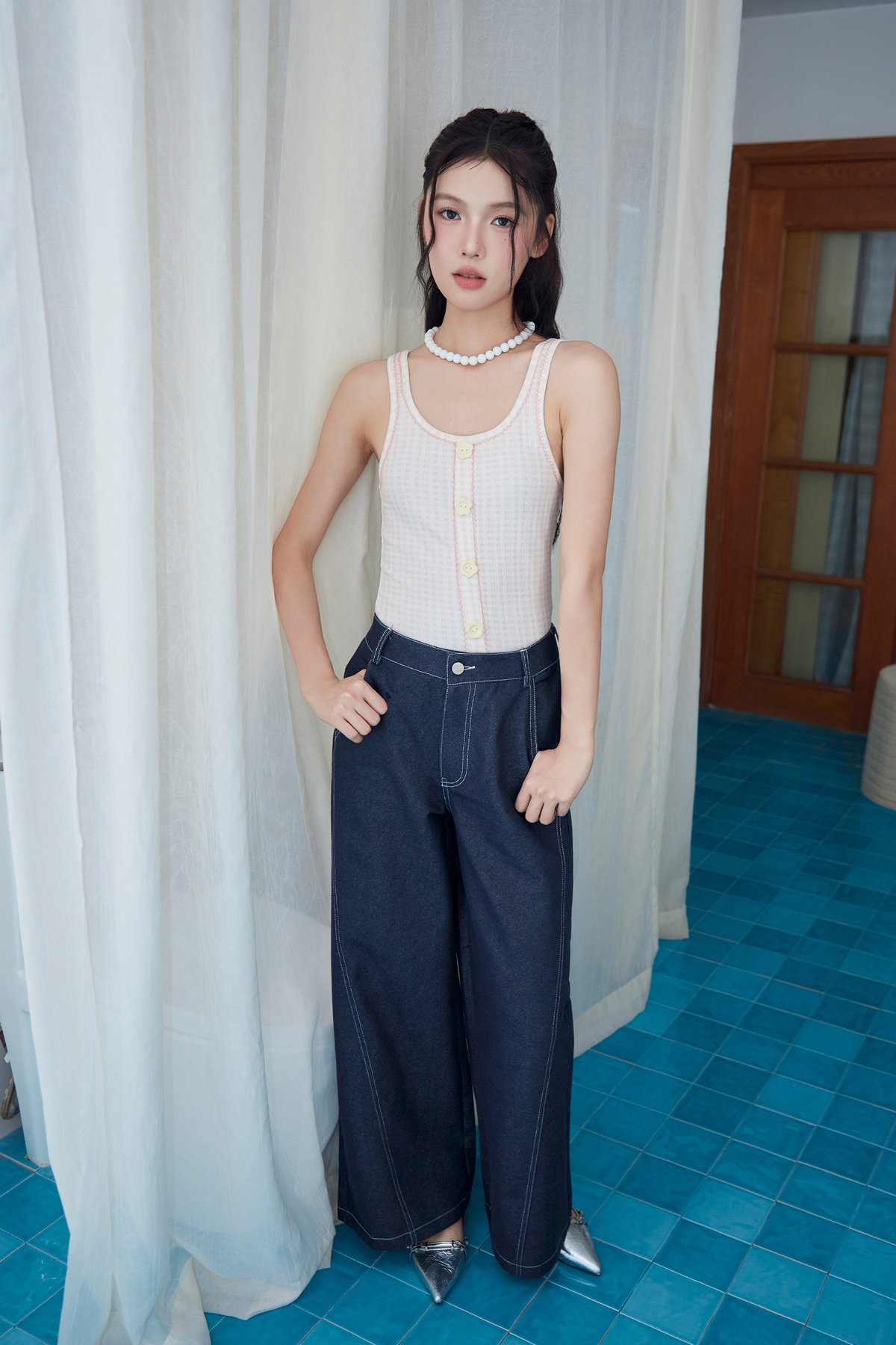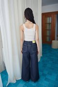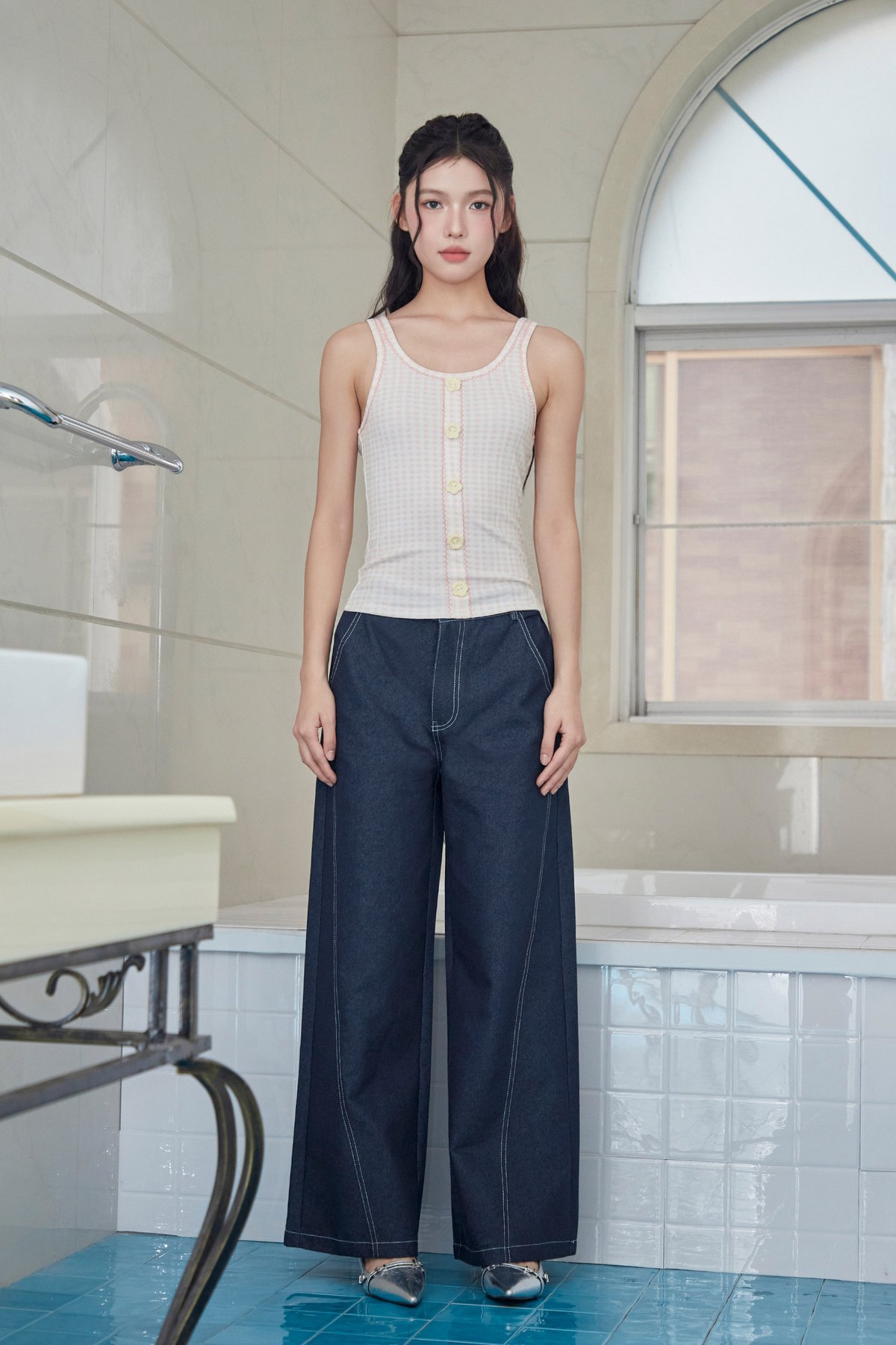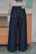 A pair of everyday jeans featuring belt loops, denim rivet buttons with zipper fly, side and back pockets, and side panelling detail.