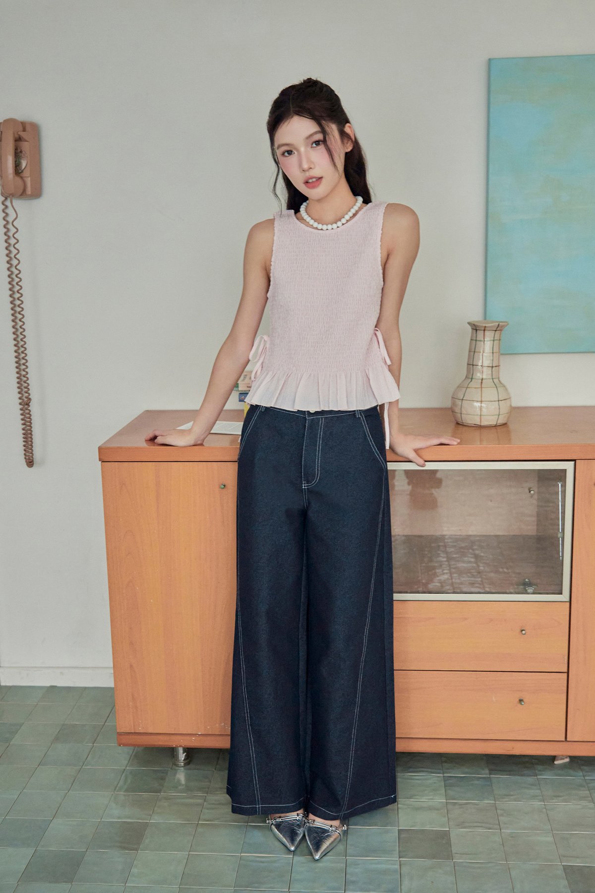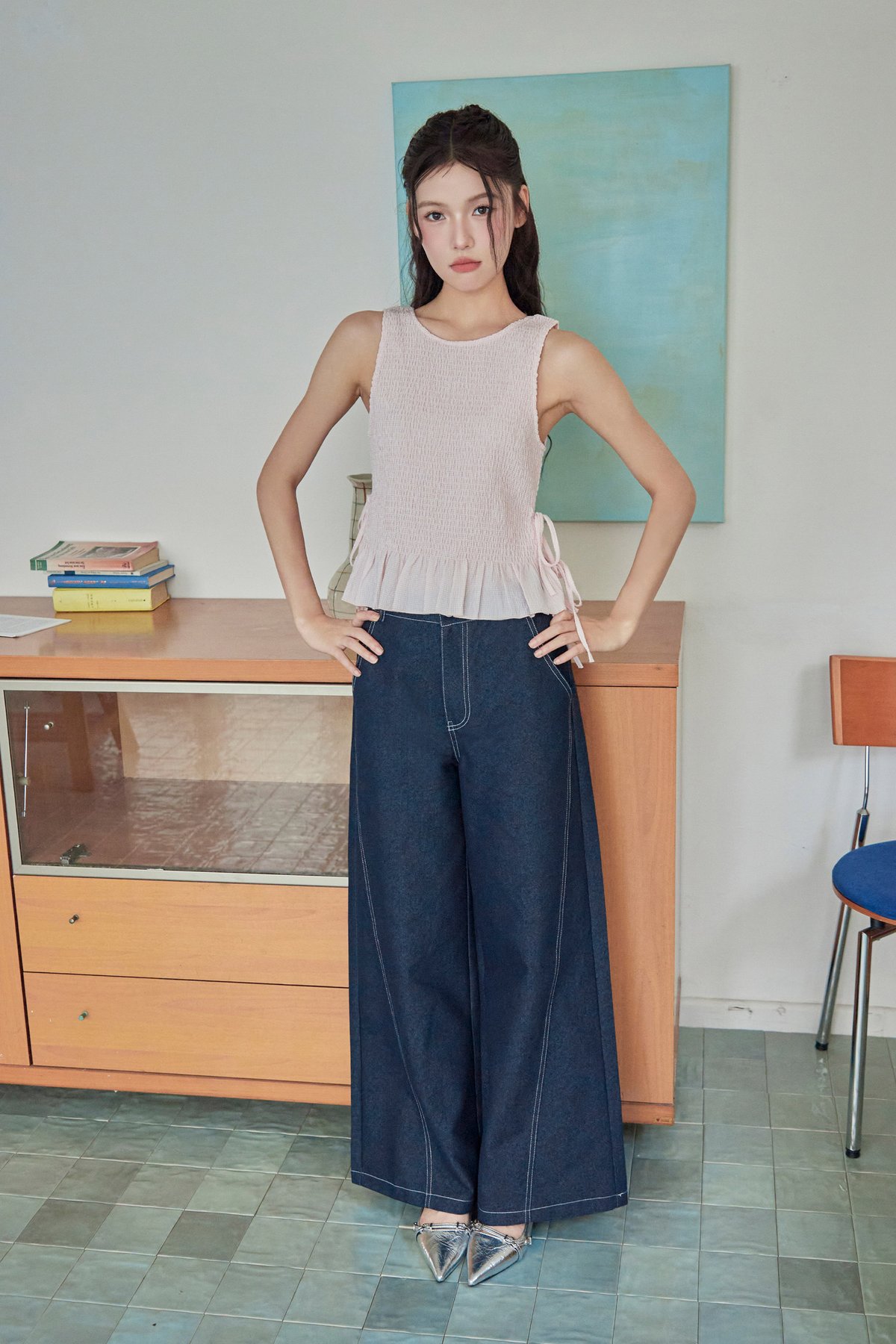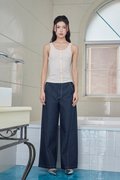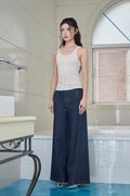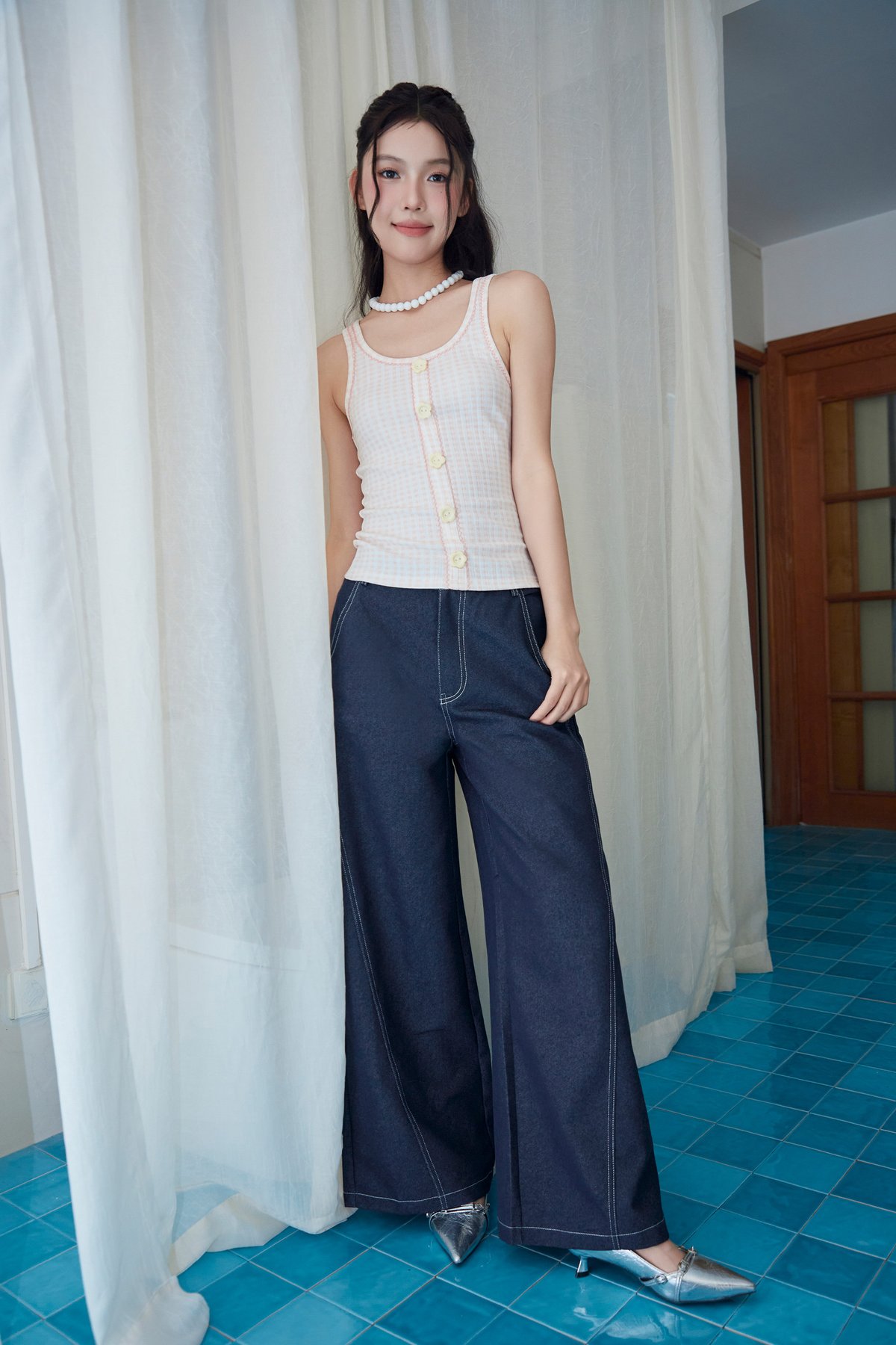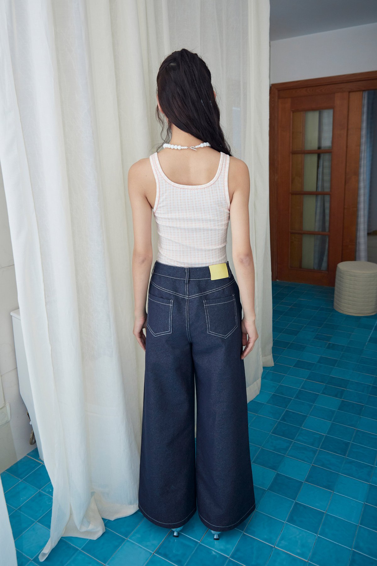 A pair of everyday jeans featuring belt loops, denim rivet buttons with zipper fly, side and back pockets, and side panelling detail.