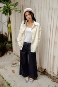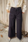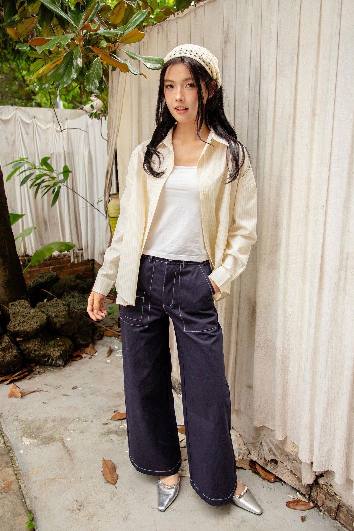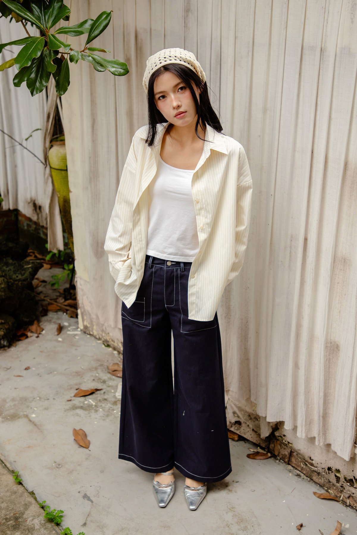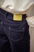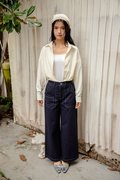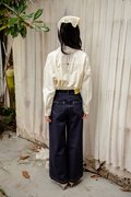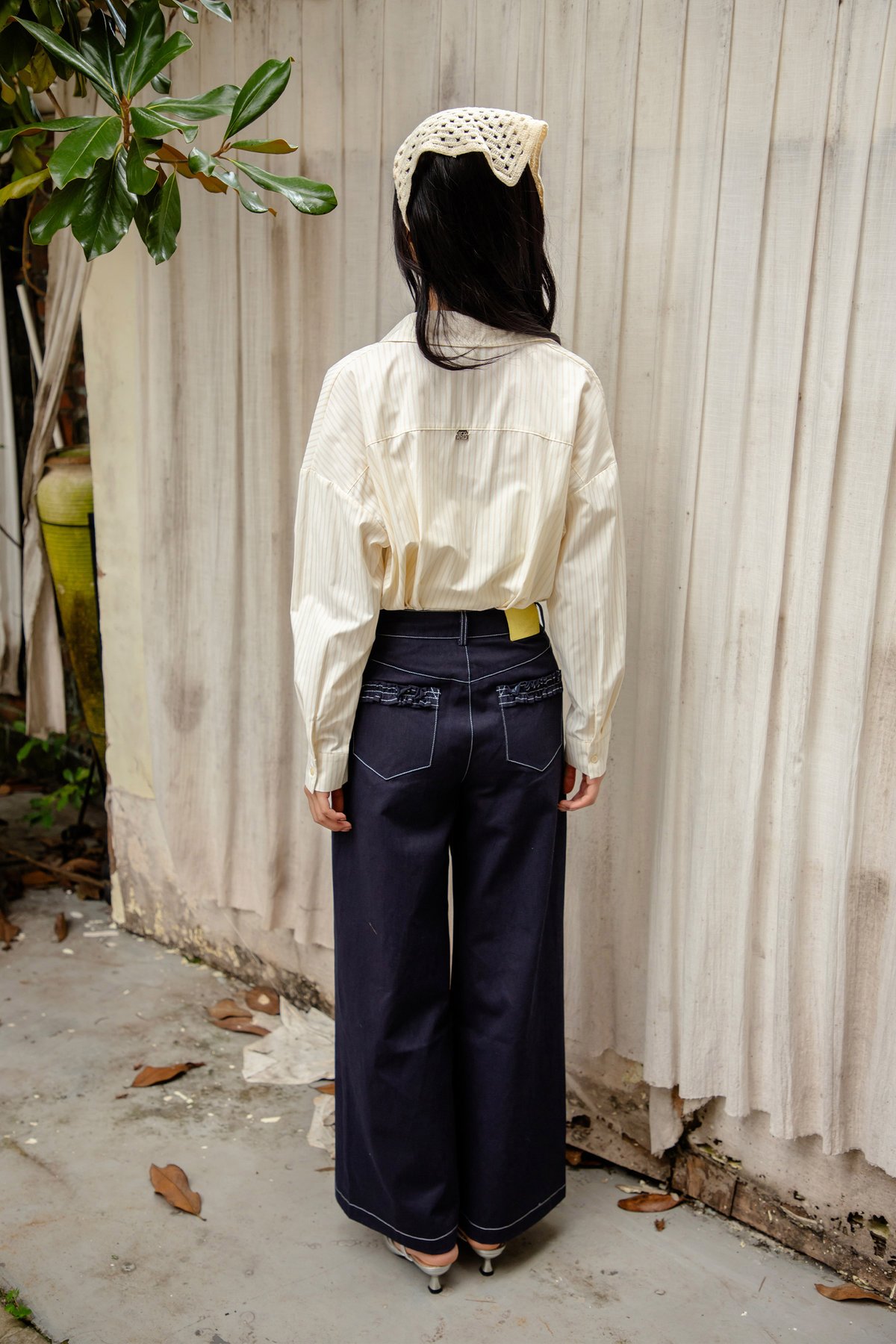 A wide-leg denim jeans featuring three functional front pockets, a denim rivet button, and a zipper fly closure. Designed with functional back pockets adorned with a ruffle detail.