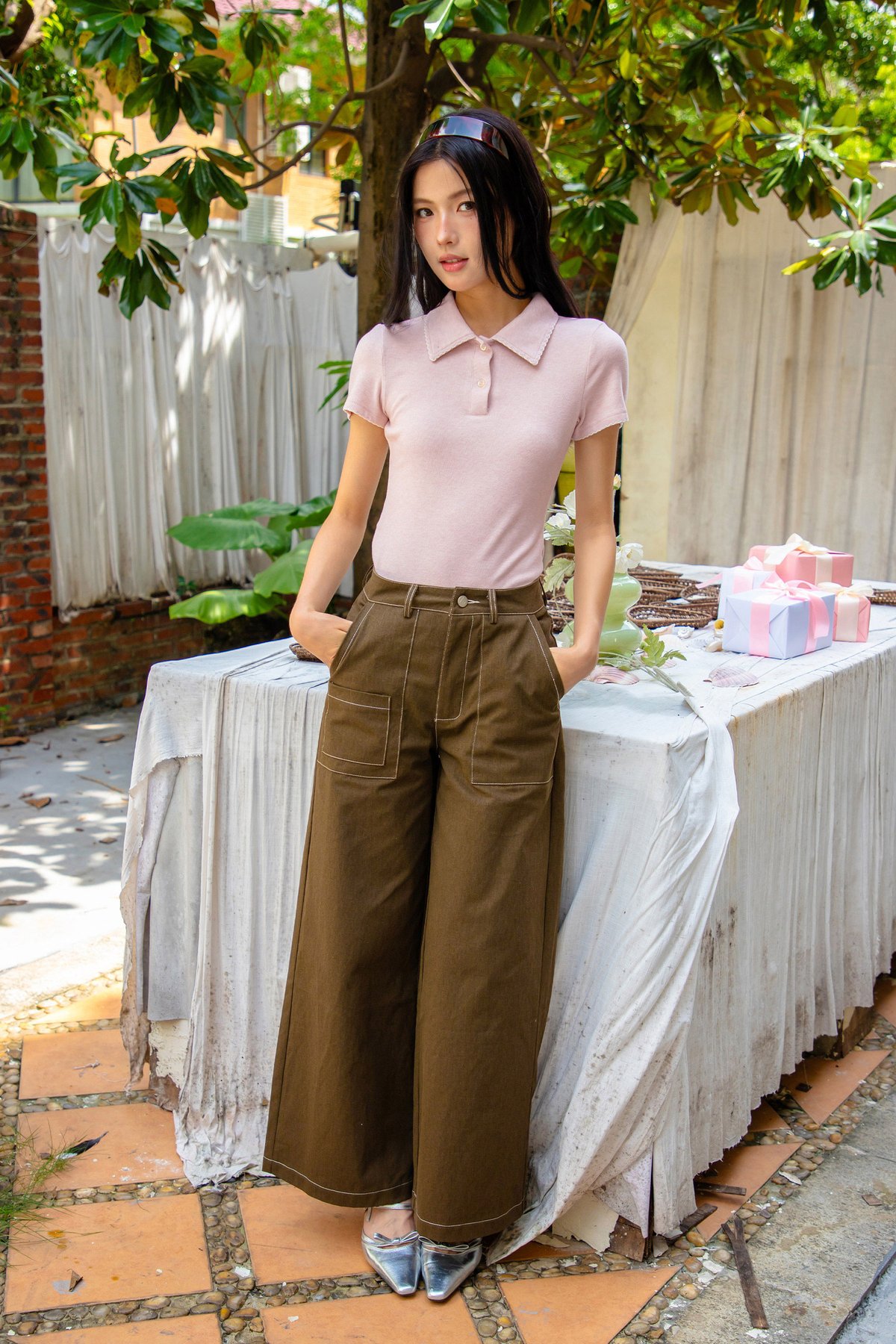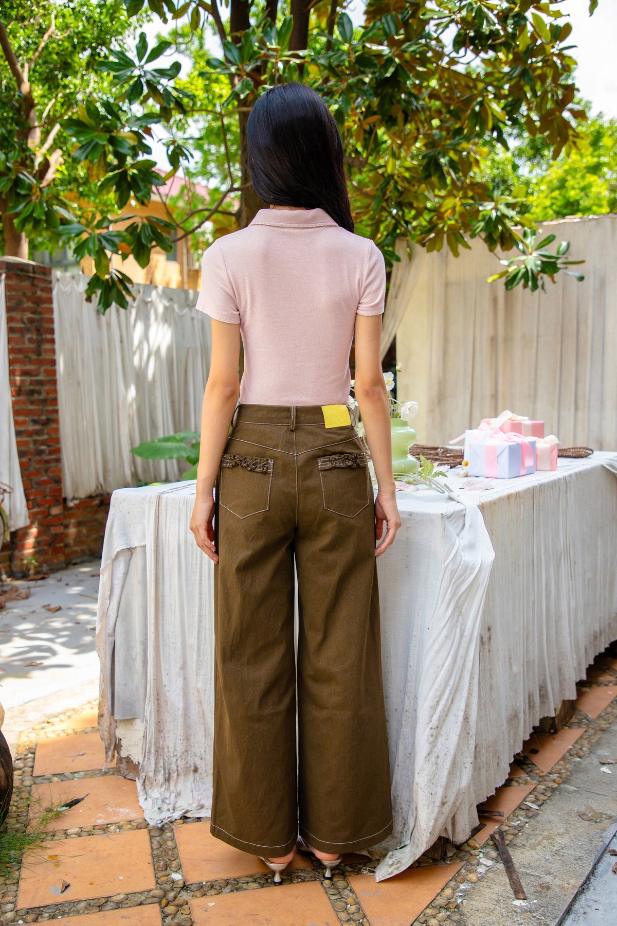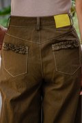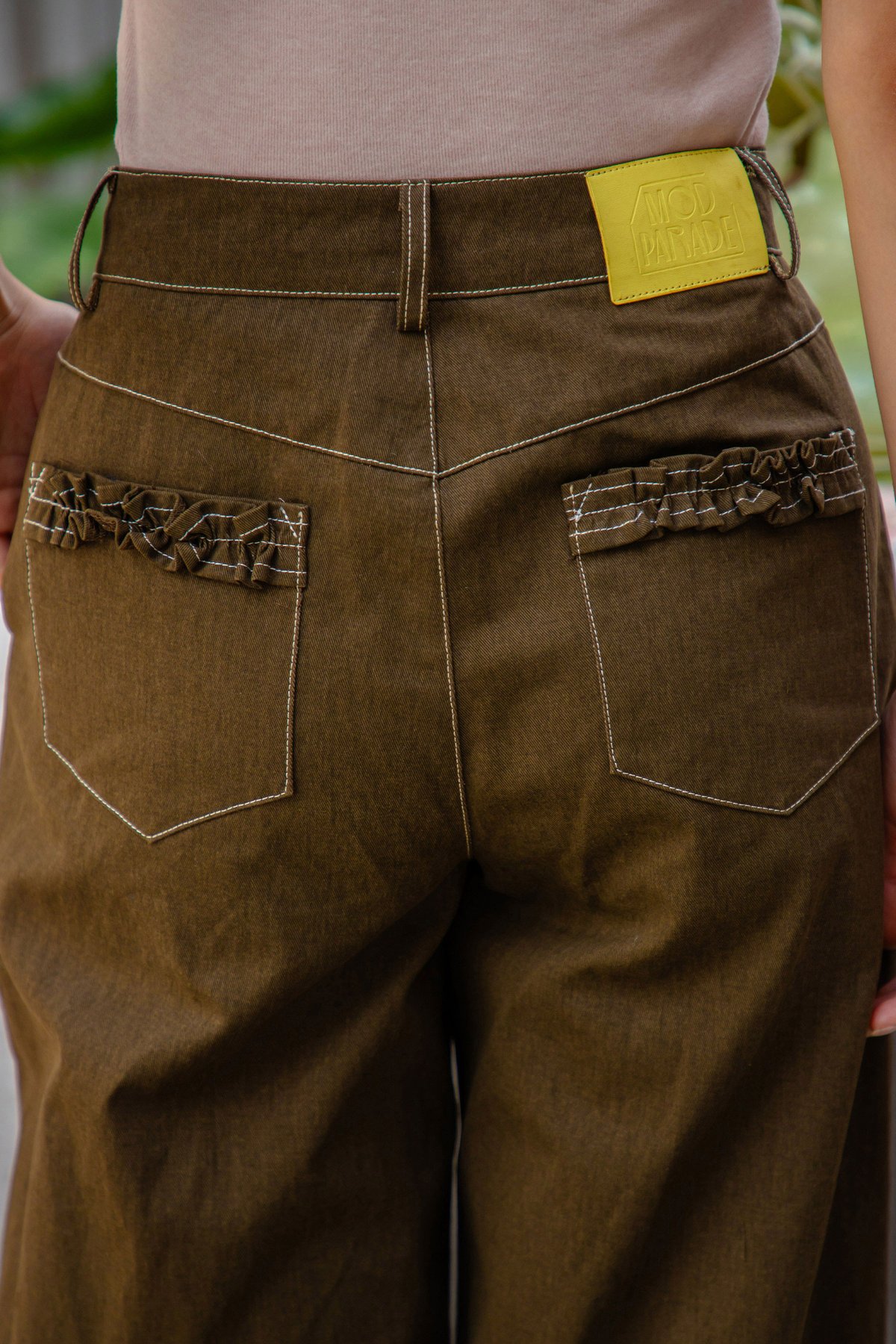 A wide-leg denim jeans featuring three functional front pockets, a denim rivet button, and a zipper fly closure. Designed with functional back pockets adorned with a ruffle detail.
