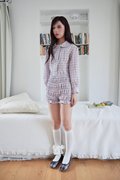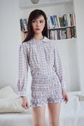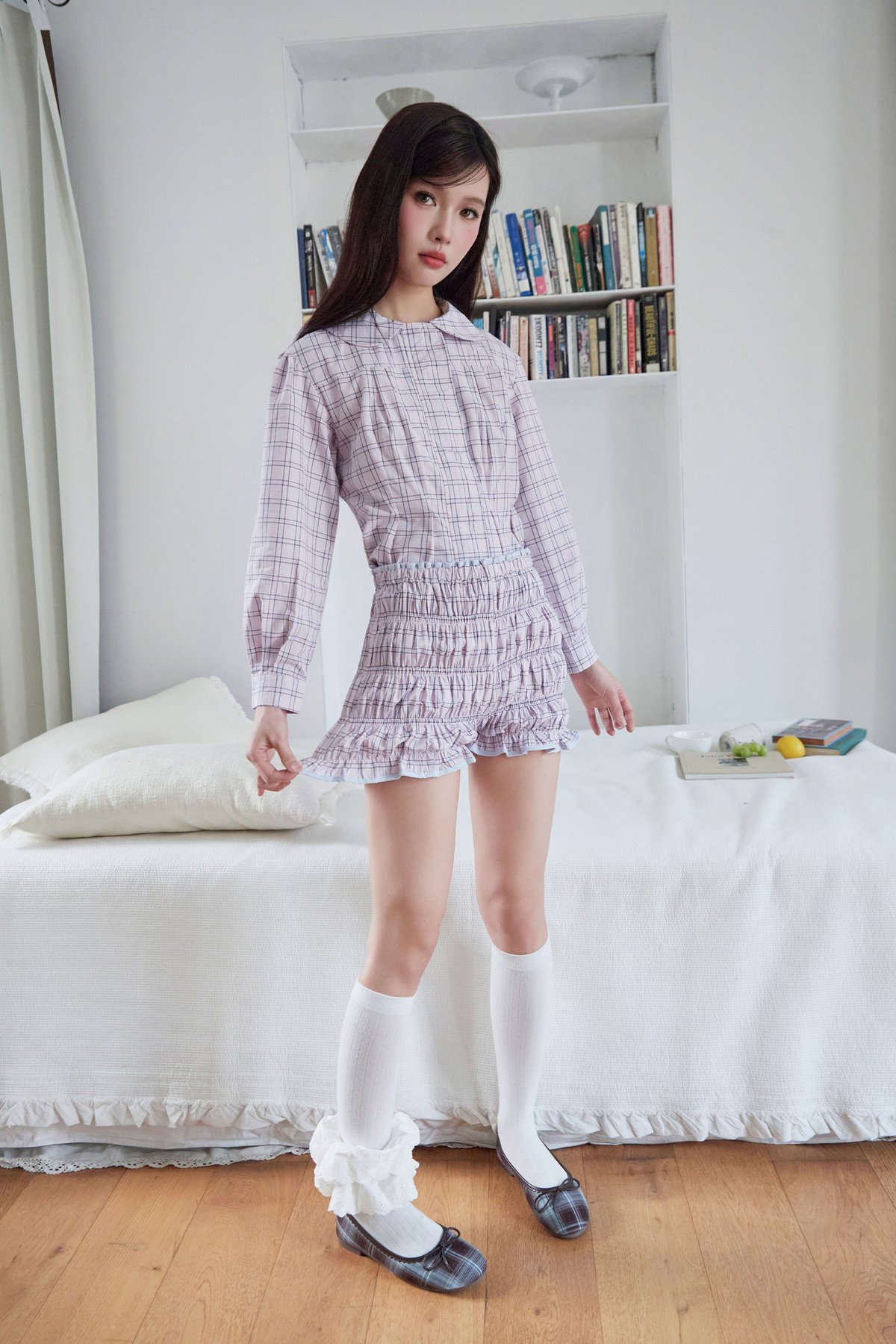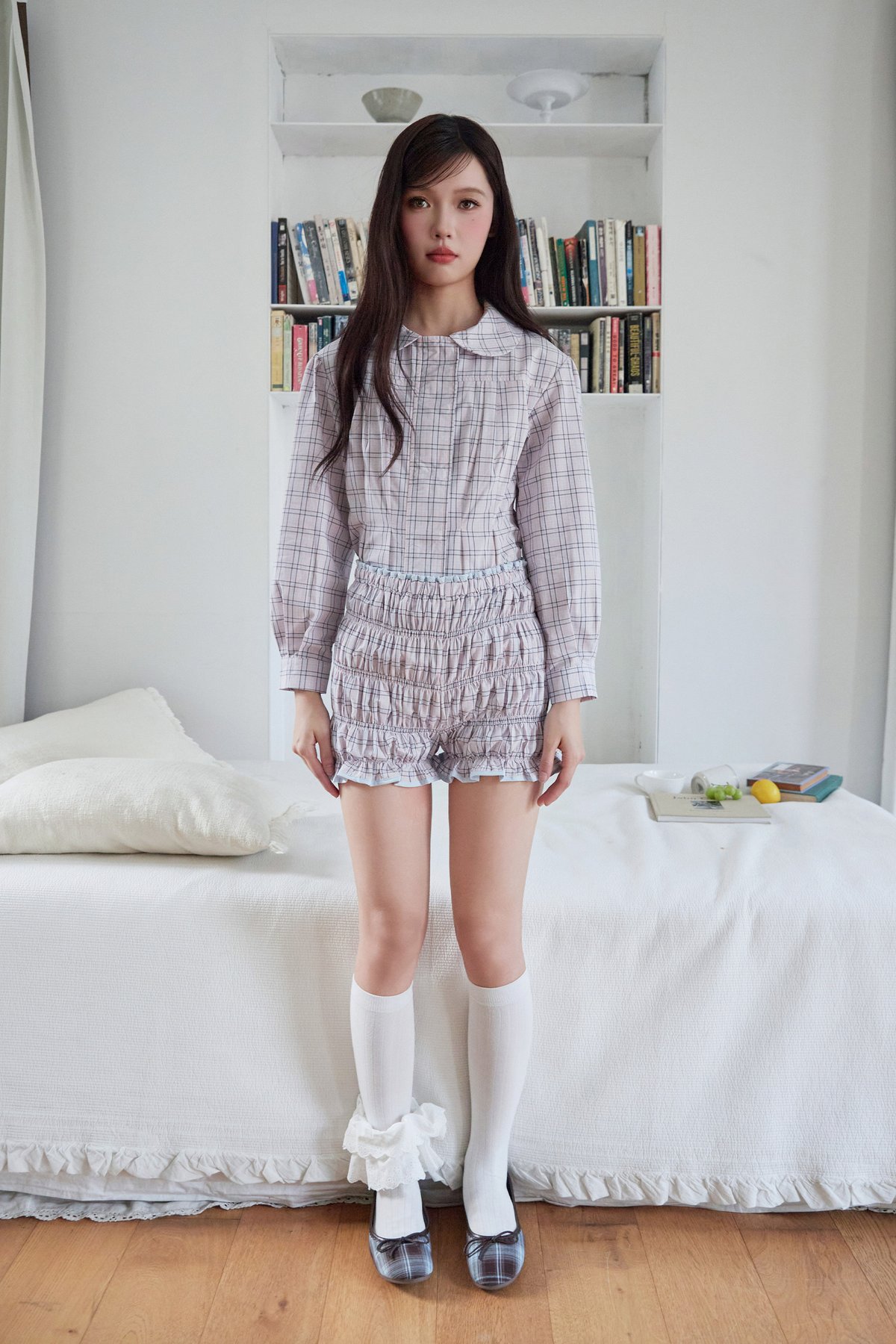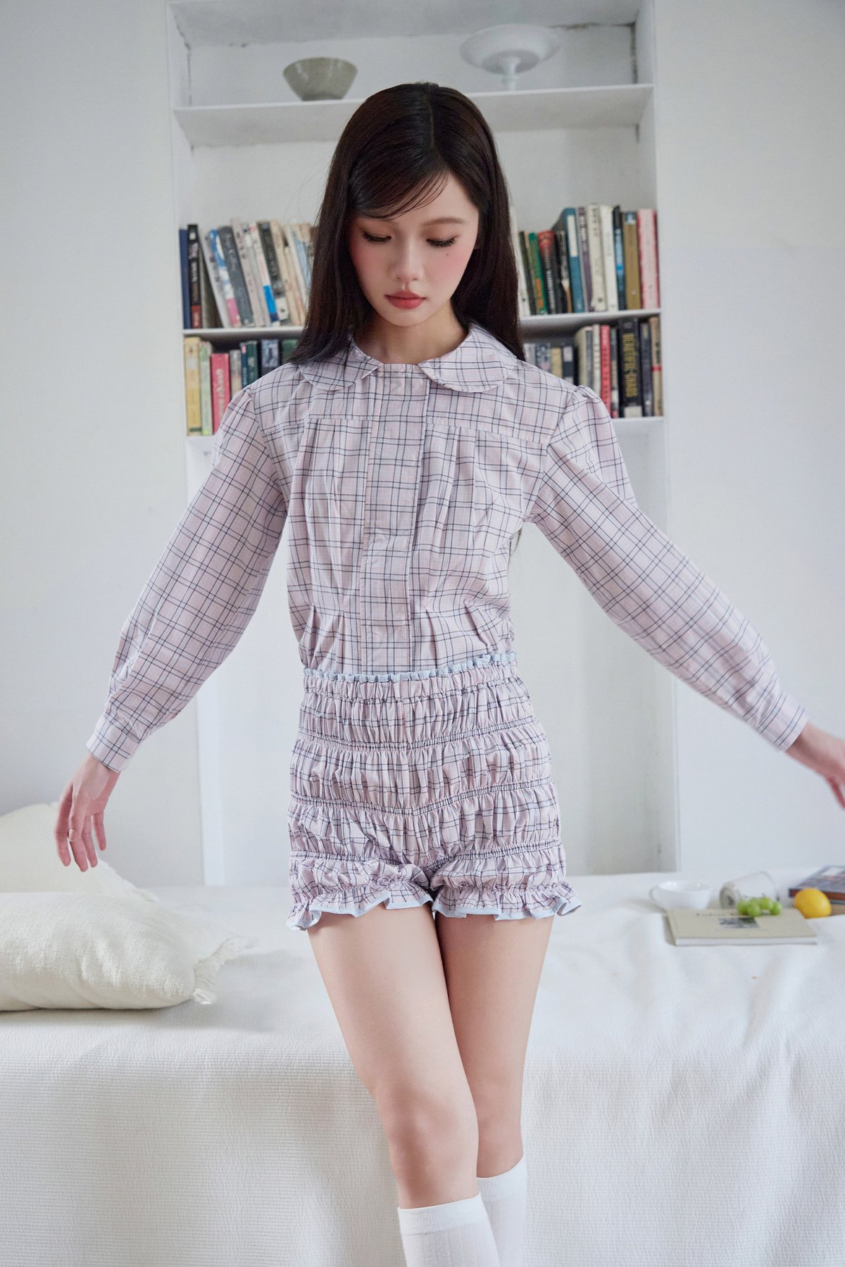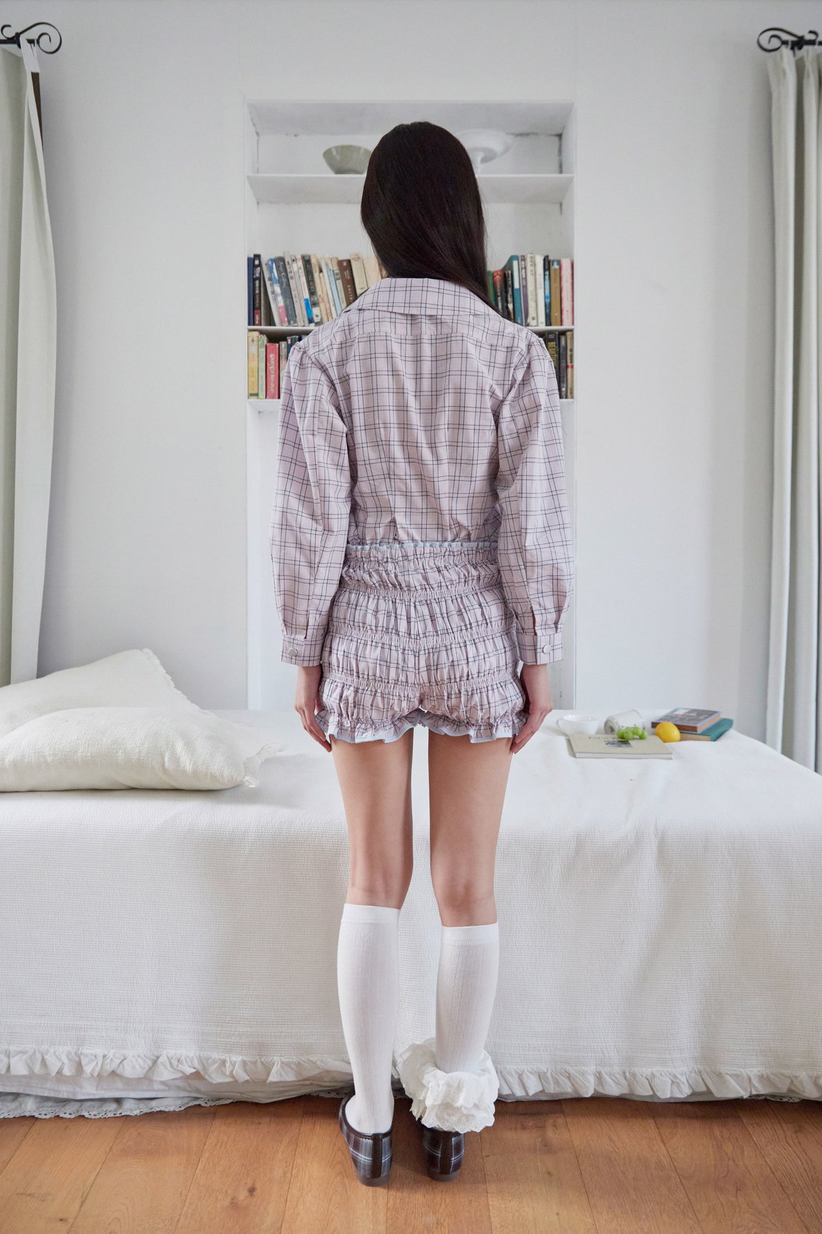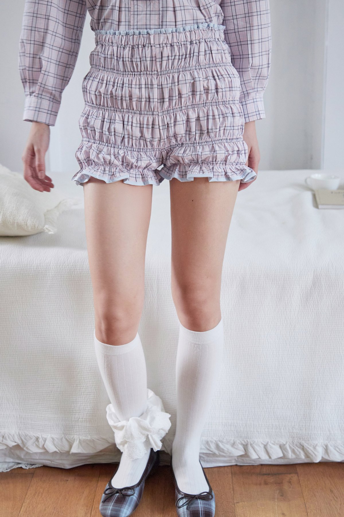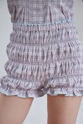 A mid waist fully smocked shorts with contrast piping around the hem and waist area.