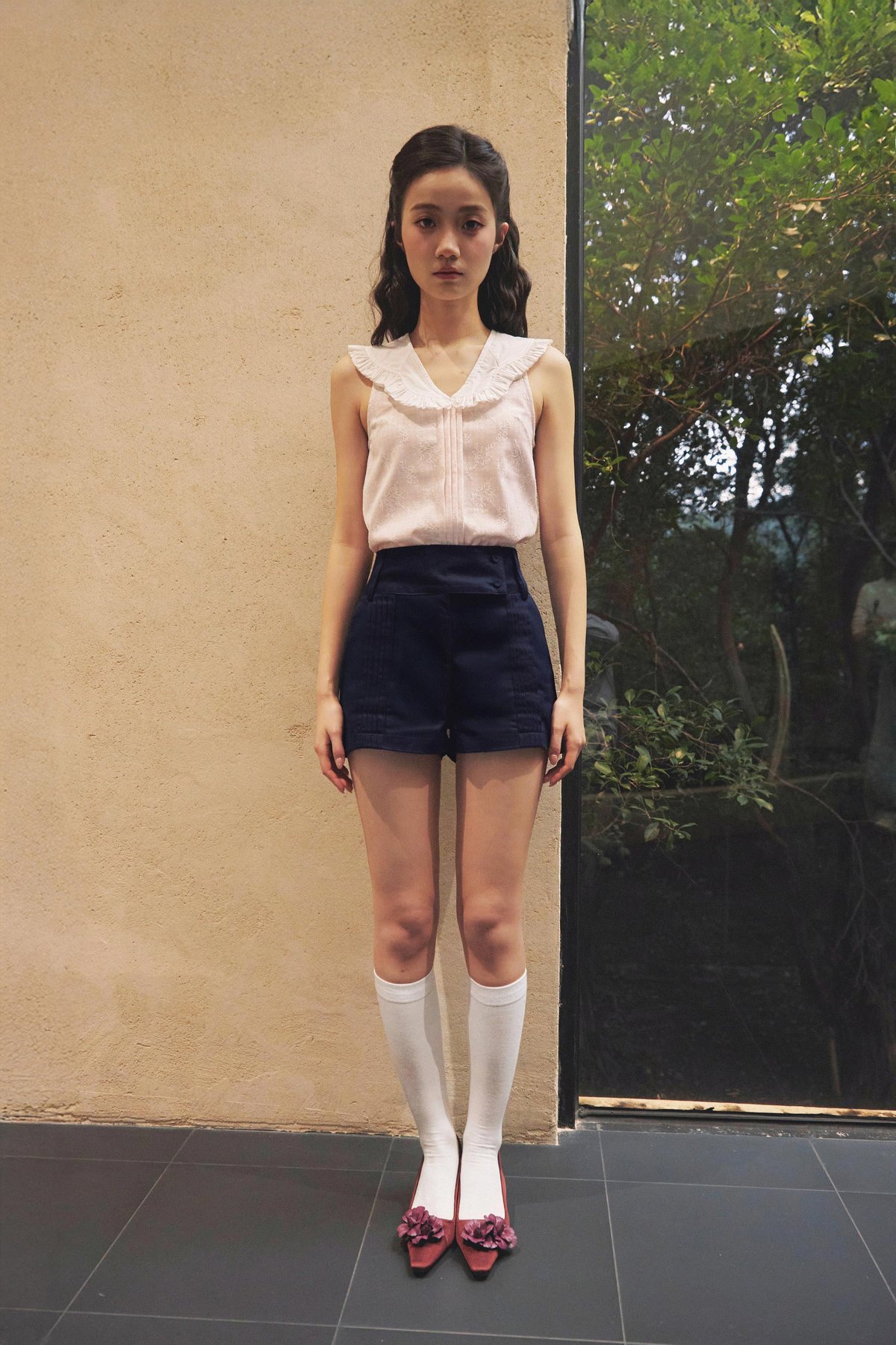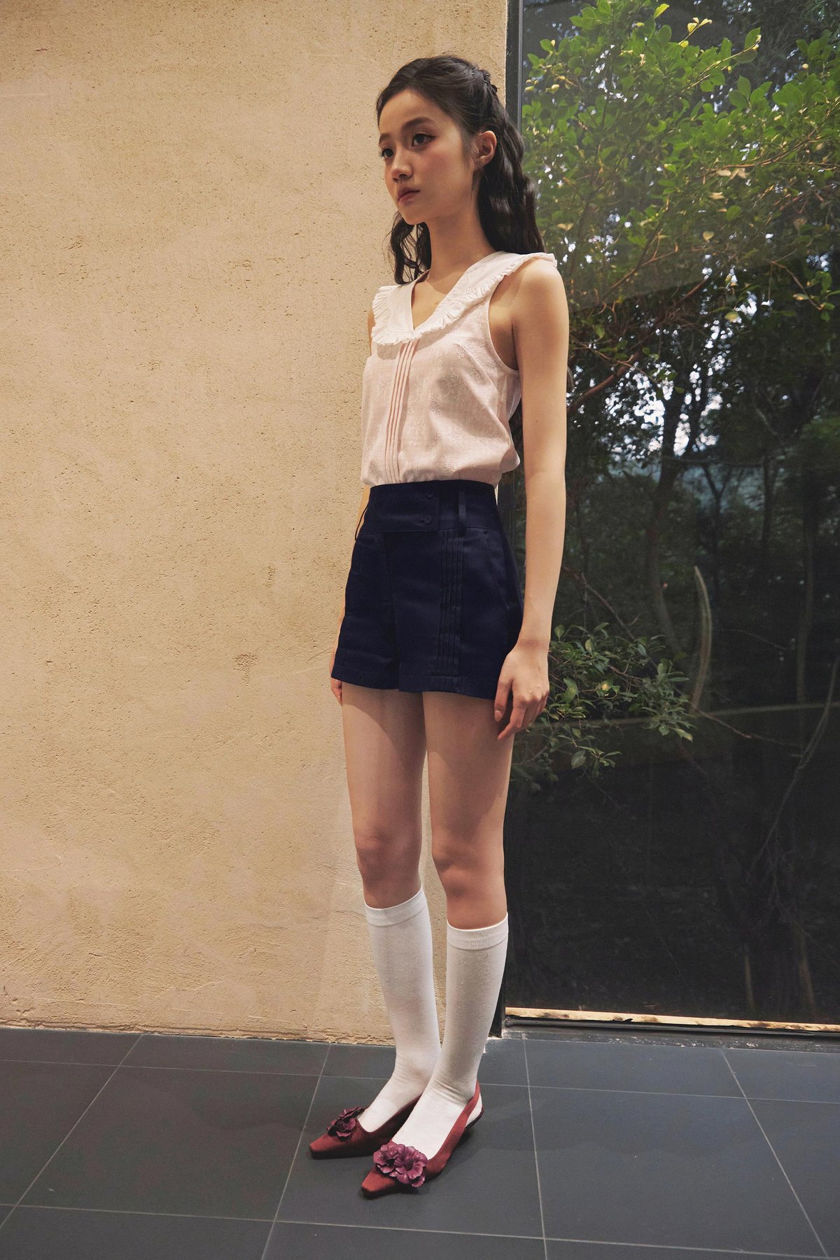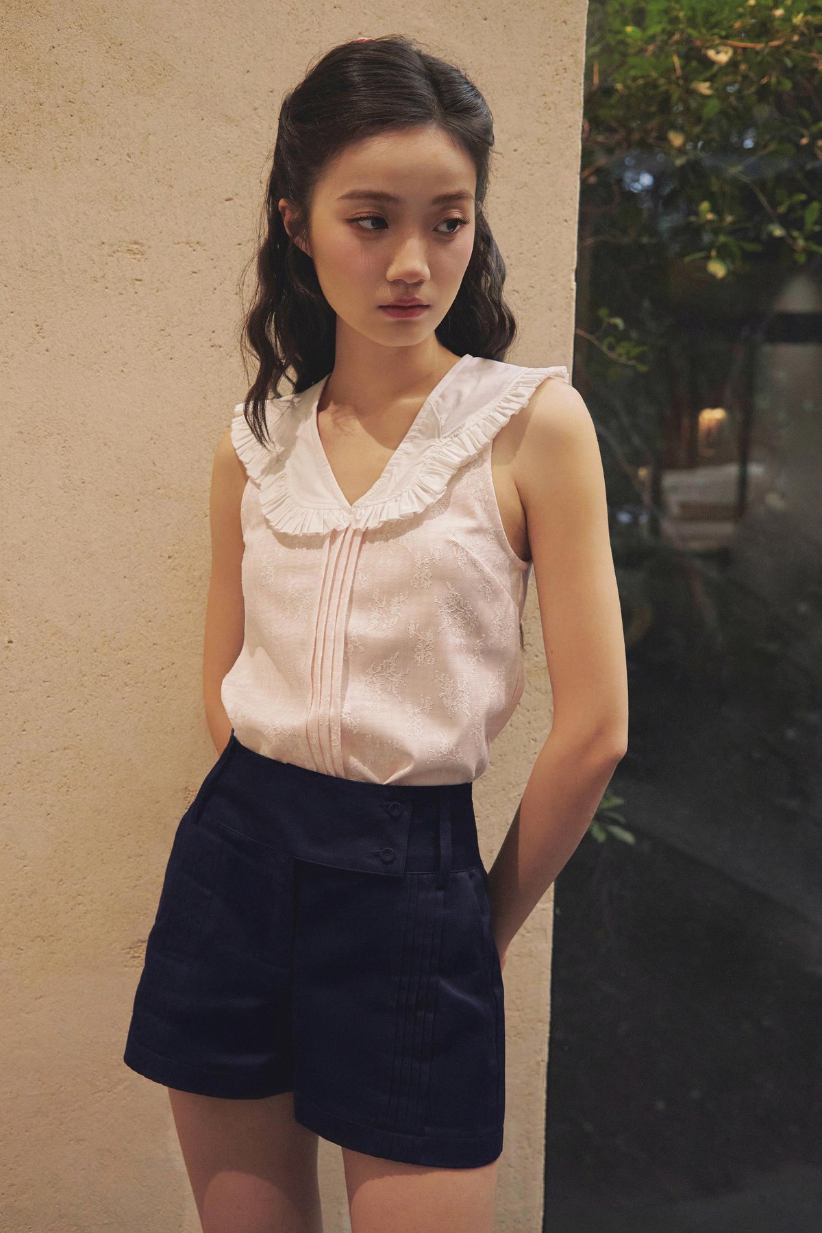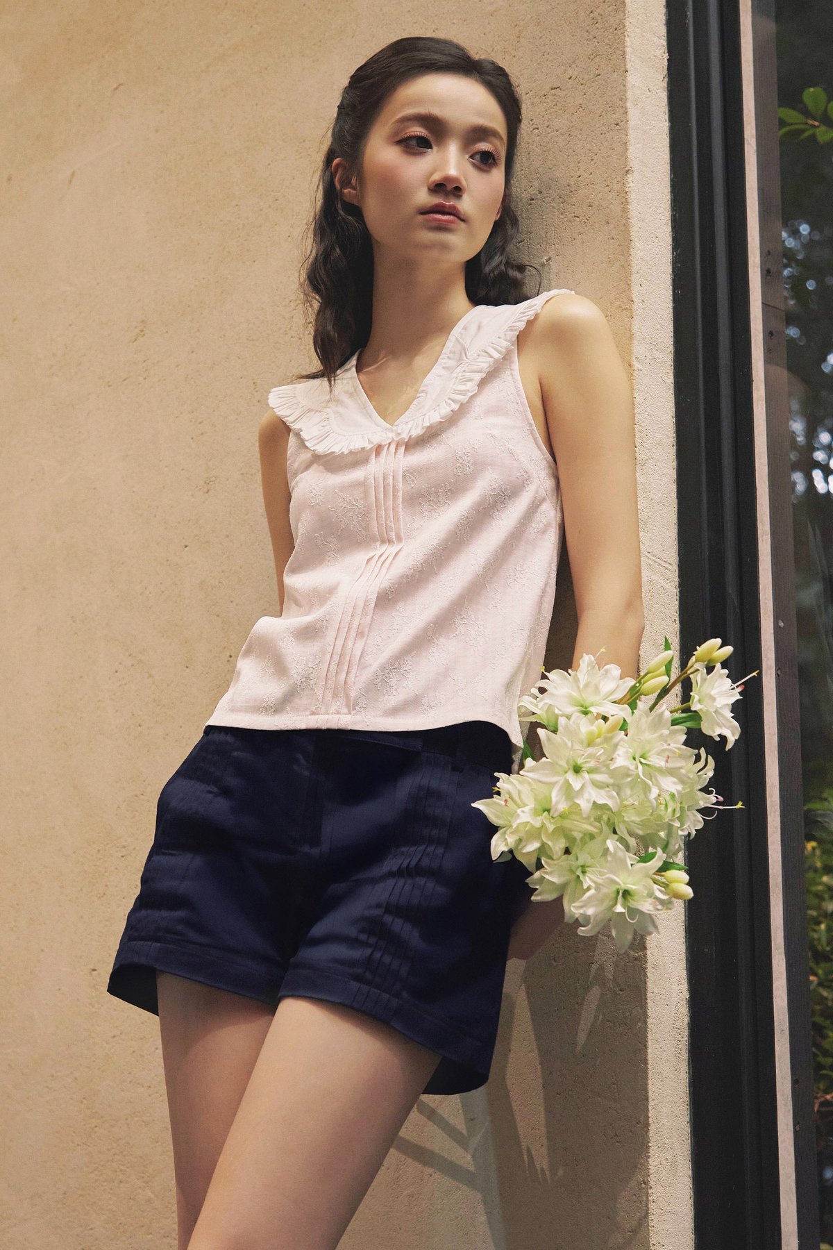 Featuring front pintuck details, functional side pockets, and a wide waistband finished with a functional button and zipper fly closure.