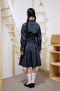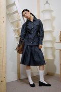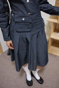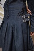 A skirt designed with side rivet button and zipper closure, detachable adjustable pocket, and faux side belt details. Finished with front and back pleats and belt loops.