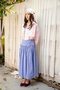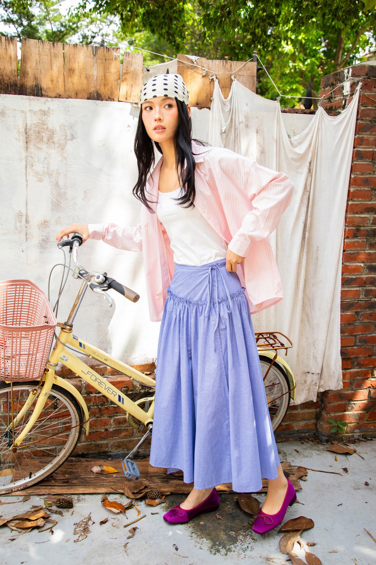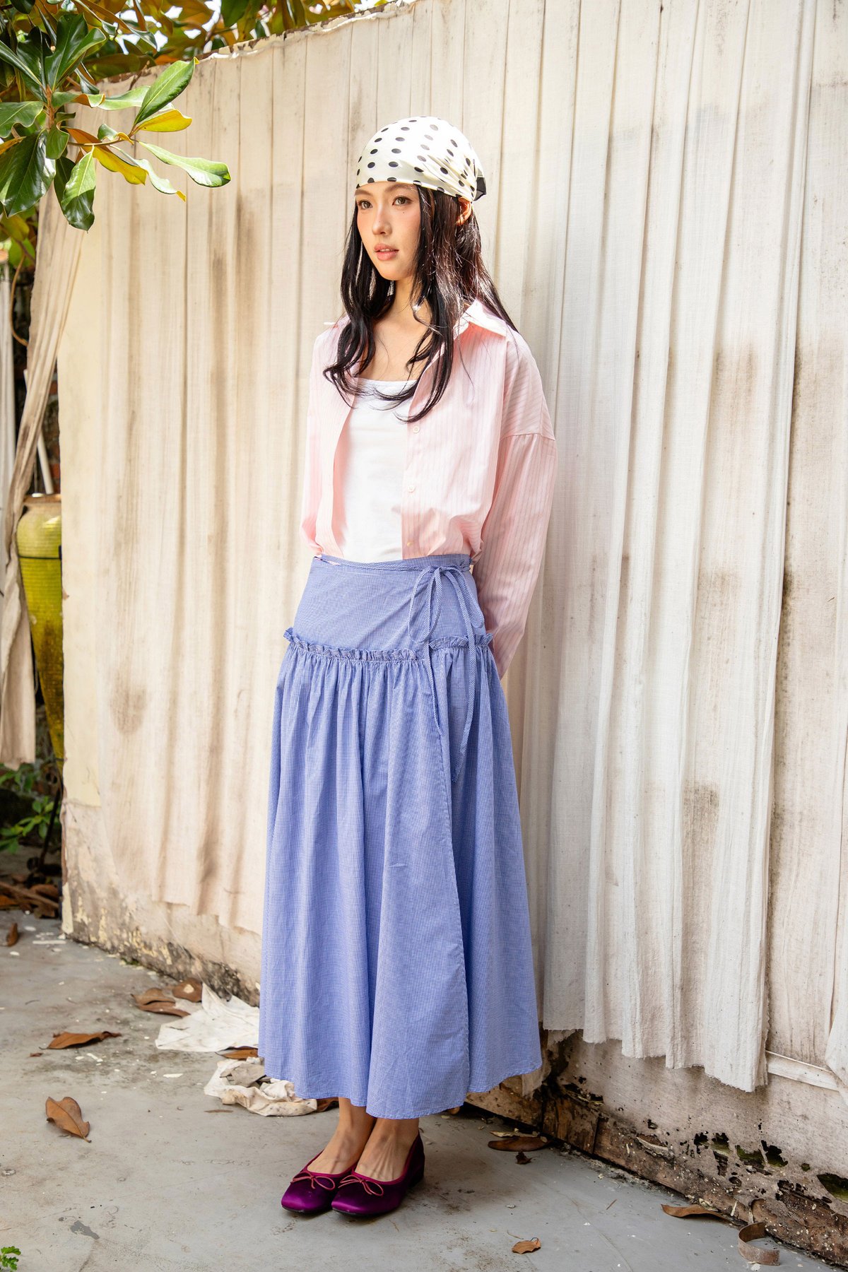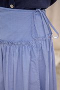 A wrap skirt with adjustable tie as side closure. Comes with drop waist ruffle details as well as belt loops.