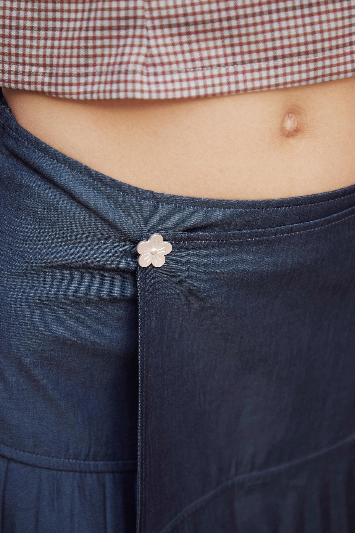 A pleated faux-wrap skirt adorned with delicate silver flower embellishments and finished with a side zipper.