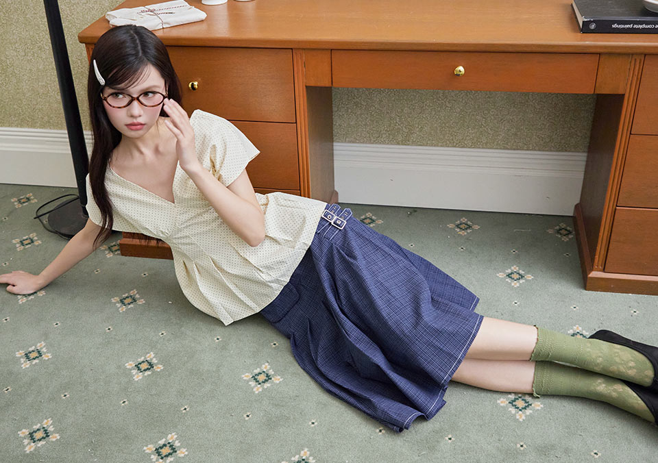 A midi skirt designed with a rivet button and zipper fly closure, finished with pleated detailing, belt loops, and functional side pockets.