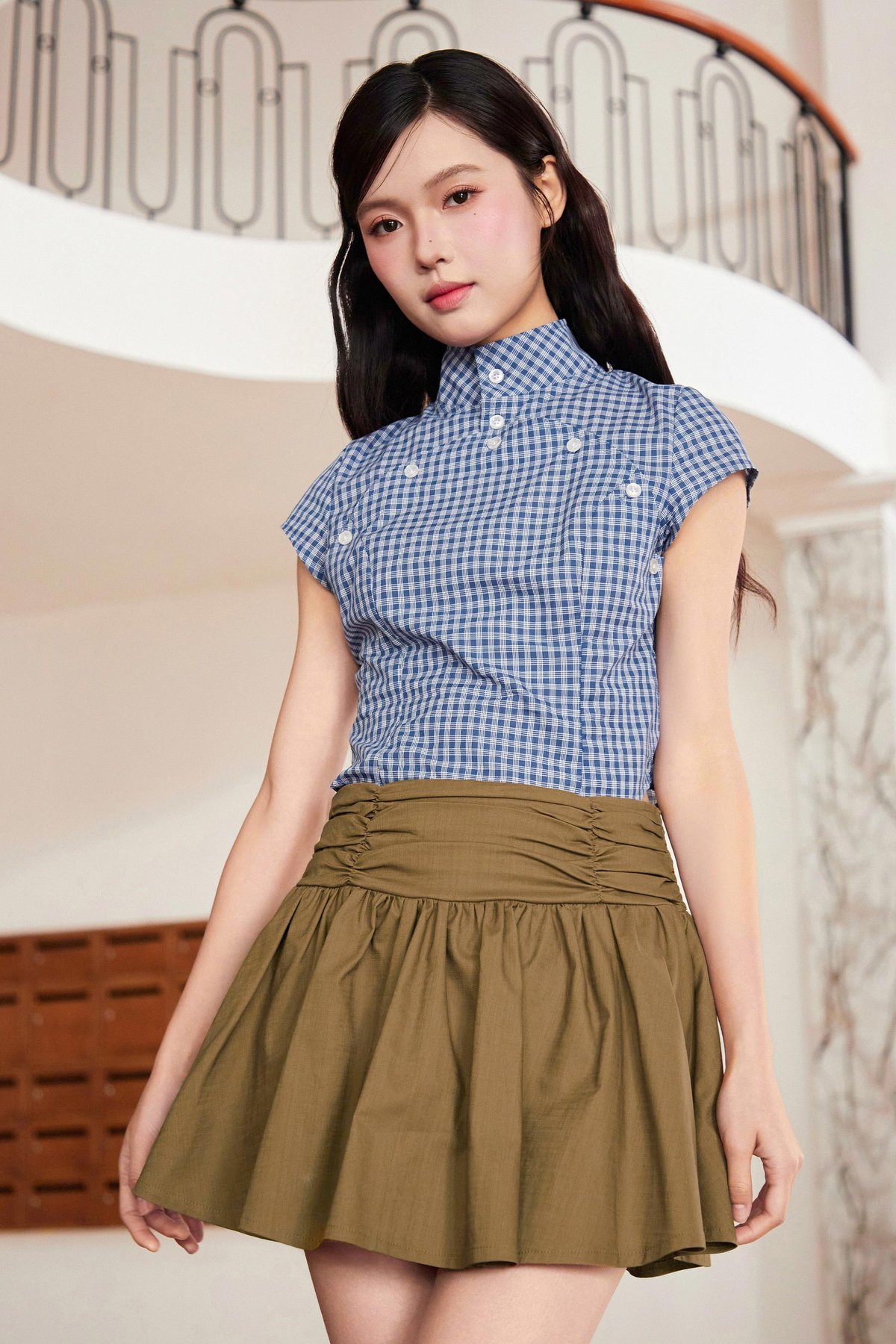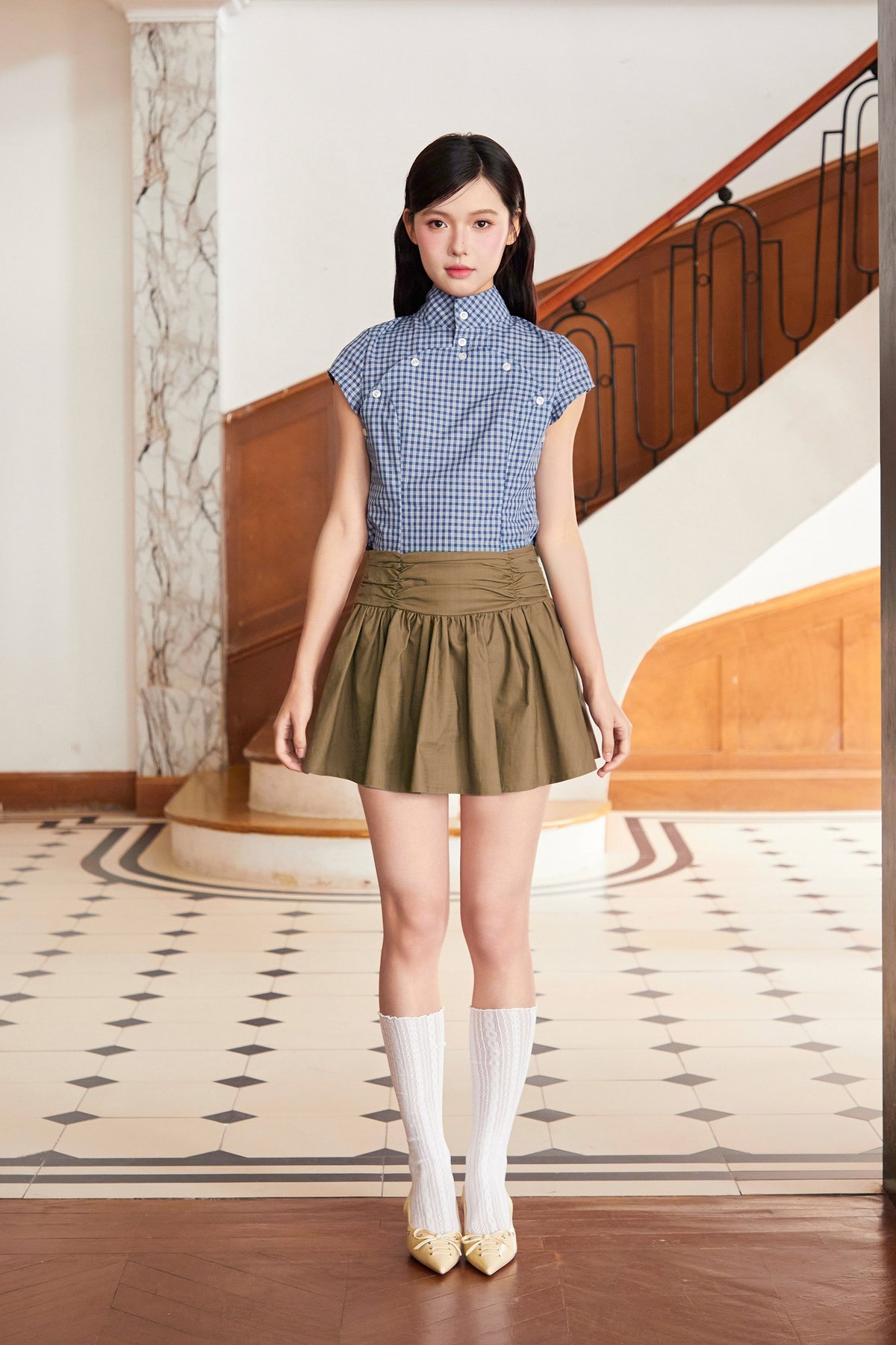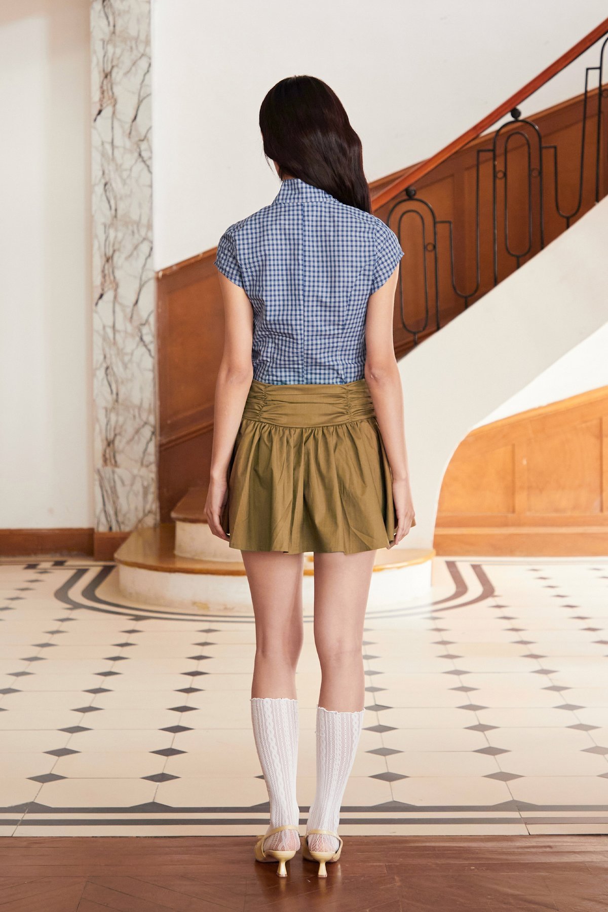 Skorts with a built-in shorts lining, designed with ruching details and a drop-waist silhouette. Finished with a flared hem and a side concealed zipper for a clean fit.