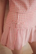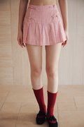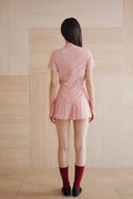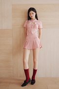 A pleated skorts design featuring a skirt overlay with inner shorts, faux Chinese frog buttons at the waist, and a concealed zipper at the back.
