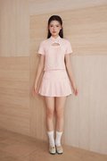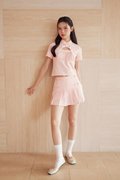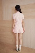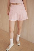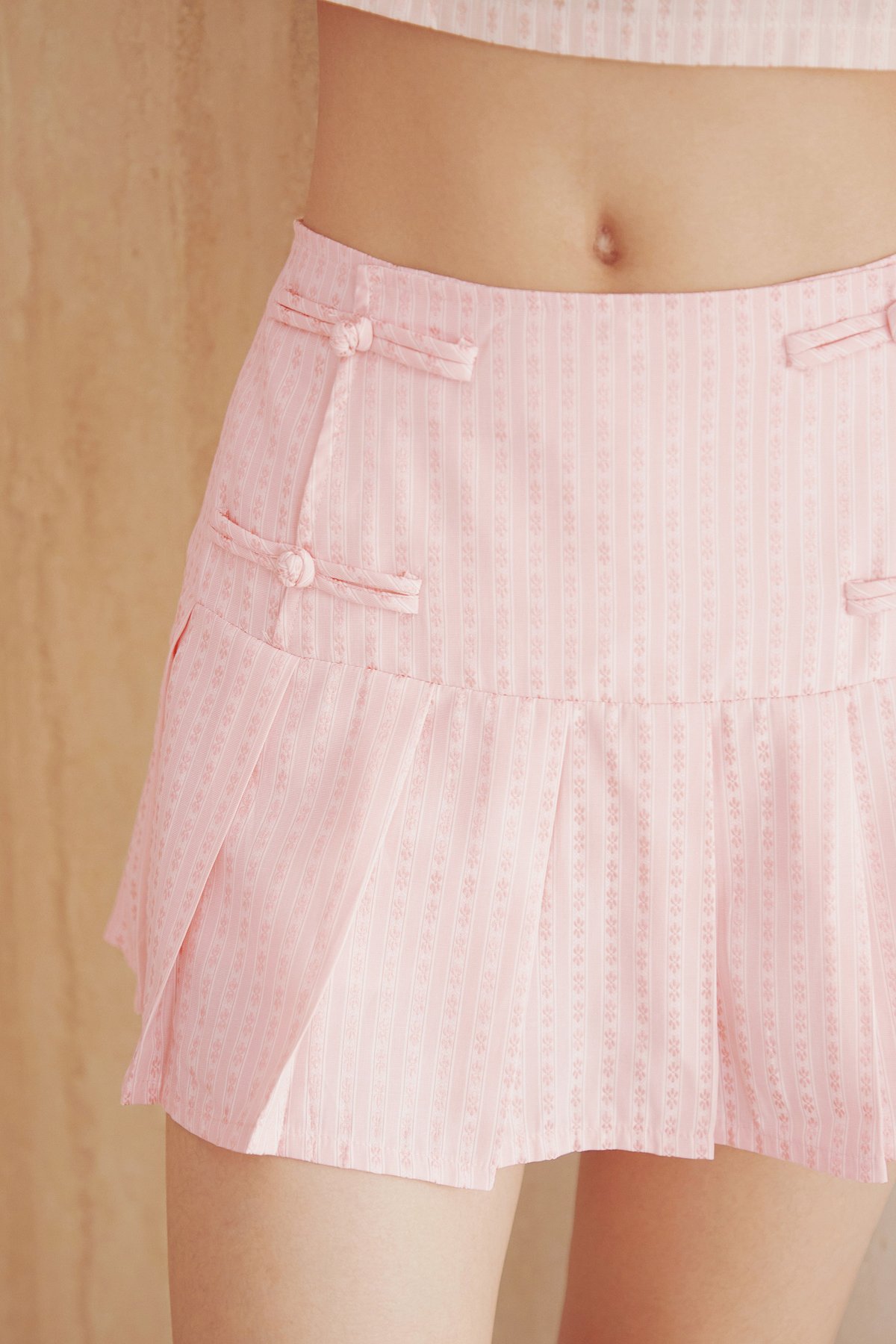A pleated skorts design featuring a skirt overlay with inner shorts, faux Chinese frog buttons at the waist, and a concealed zipper at the back.