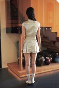 A skorts with inner shorts lining and pleated details on both front and back. Features side pockets, decorative Chinese frog buttons at the front, and a back concealed zipper.