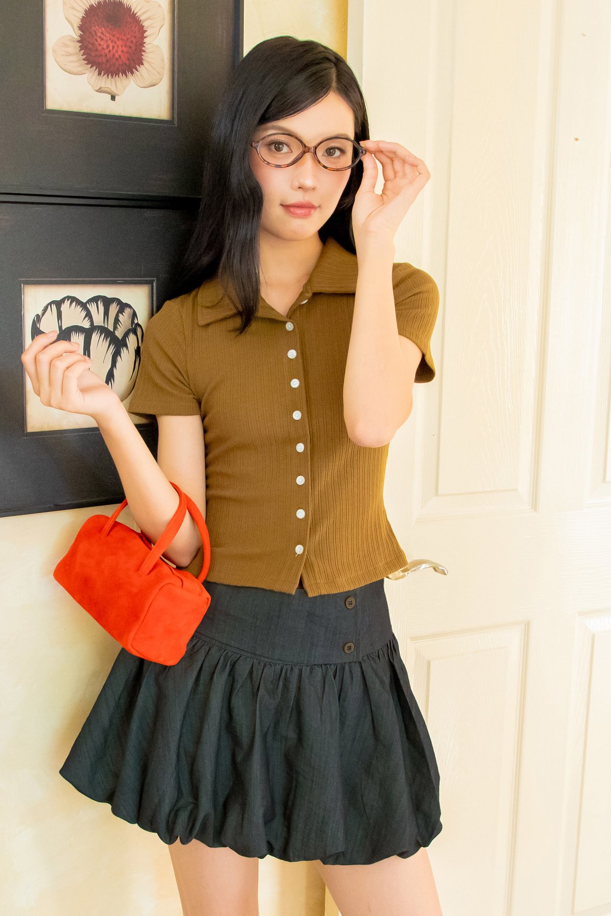 Made from soft chambray fabric, this skort features a bubble hem and a subtle drop-waist silhouette. Designed with faux front buttons, a concealed side zipper, and inner shorts lining for comfort and ease of movement.