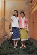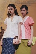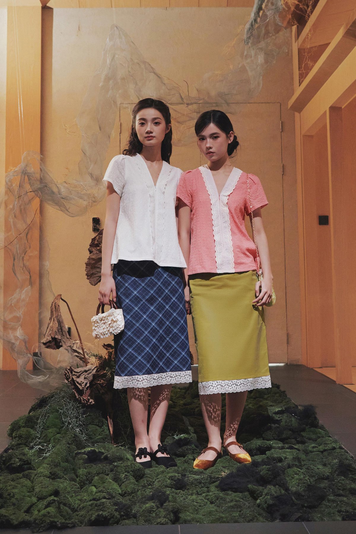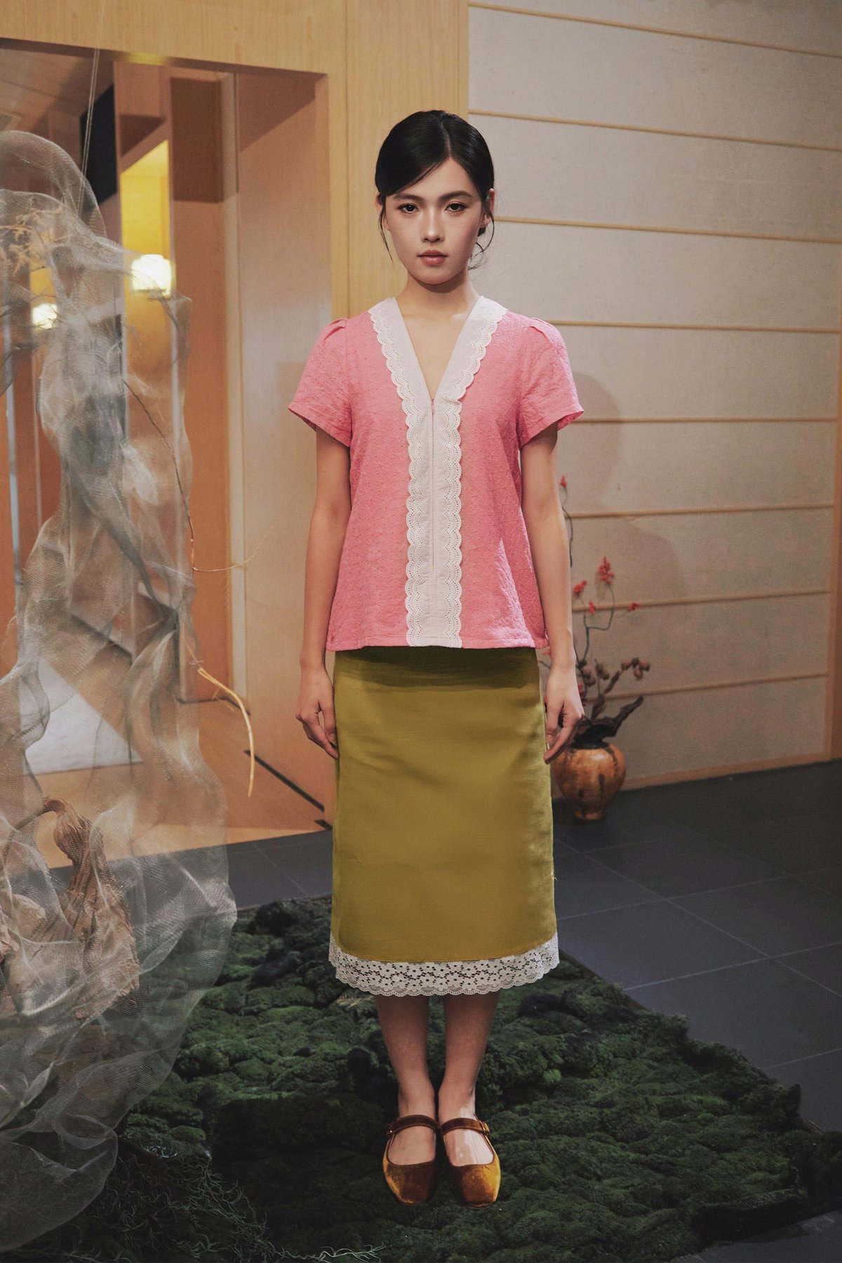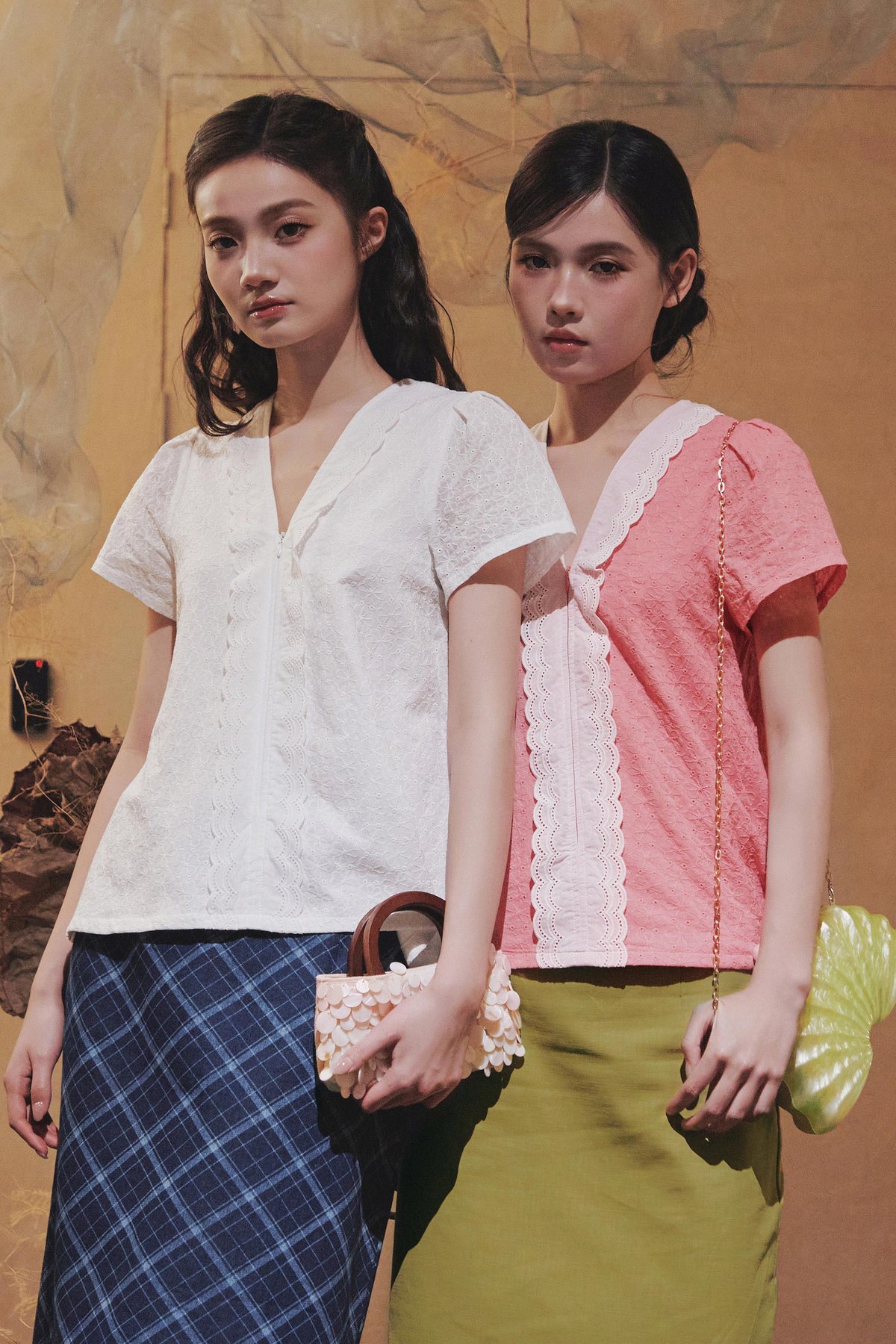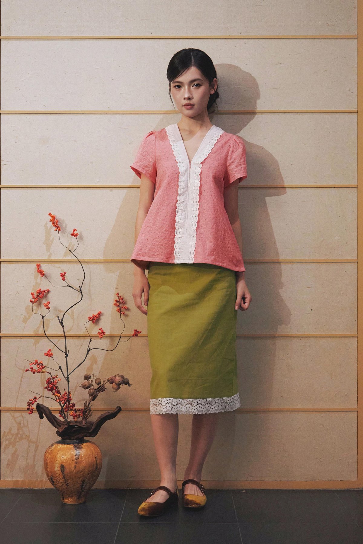 A short sleeve kebaya top designed with a lined bodice, double scallop trimmings at the neckline, a front concealed zipper, and an A-line silhouette.